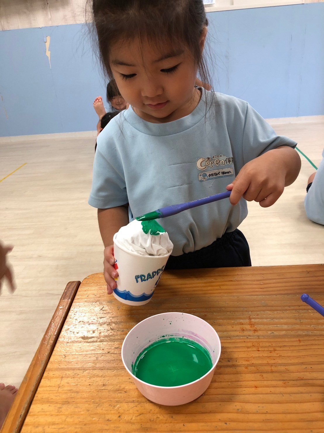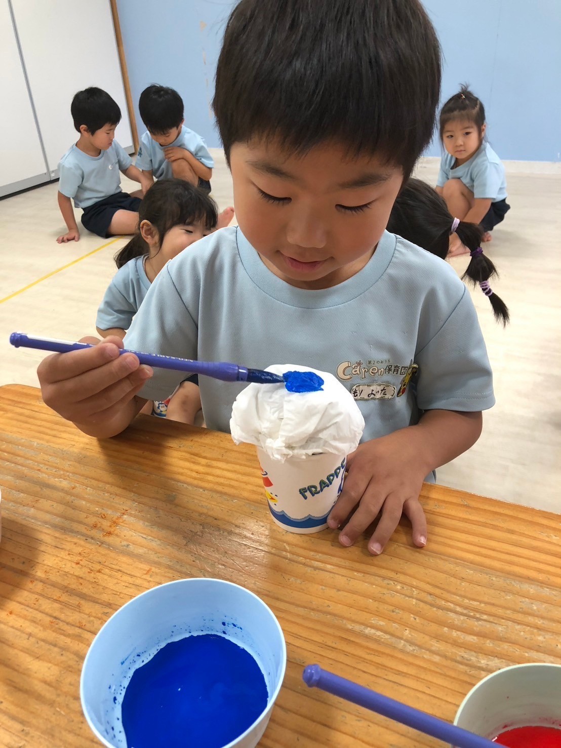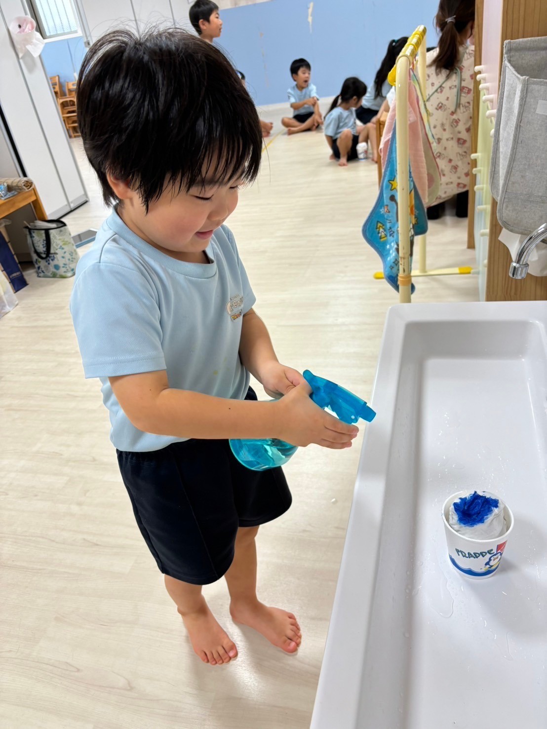 今日はまず夏祭りに向けてかき氷作りから🍧✨丸めた新聞紙をティッシュで包んでカップに詰める、絵の具で色付けして霧吹きで滲ませて…こだわり一品になりました💖そのあとは園庭で時間を決めて遊びましたよ❣️製作で使った霧吹きが再登場して、今度はみんなの暑さ対策に☀️💦万能ですね〜🤣お部屋ではブロックを使って遊びながらクールダウンした後、美味しく給食を食べました😆💕
