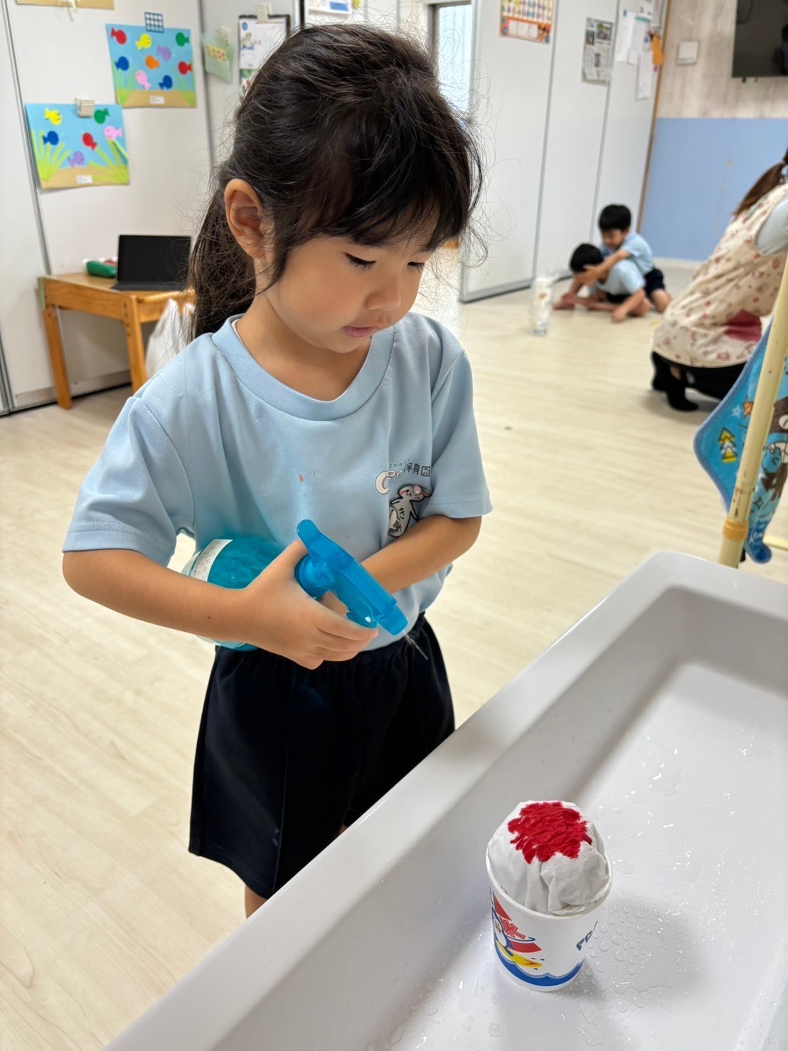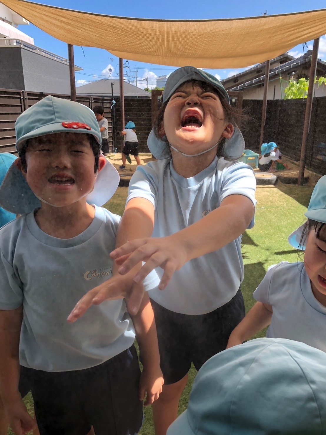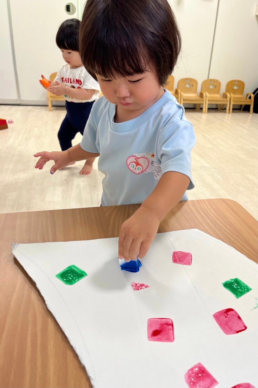 今日はまず夏祭りに向けてかき氷作りから🍧✨丸めた新聞紙をティッシュで包んでカップに詰める、絵の具で色付けして霧吹きで滲ませて…こだわり一品になりました💖そのあとは園庭で時間を決めて遊びましたよ❣️製作で使った霧吹きが再登場して、今度はみんなの暑さ対策に☀️💦万能ですね〜🤣お部屋ではブロックを使って遊びながらクールダウンした後、美味しく給食を食べました😆💕