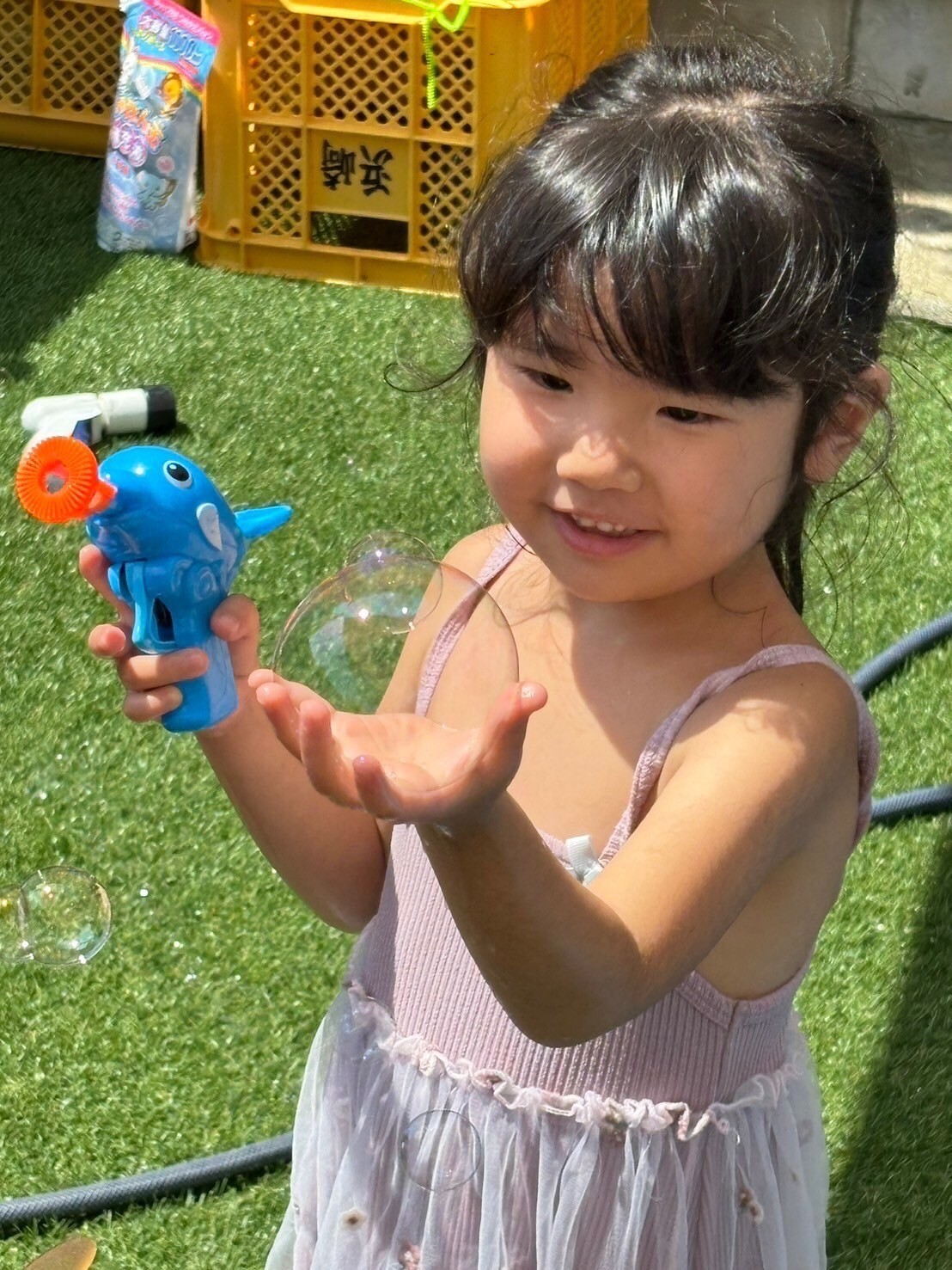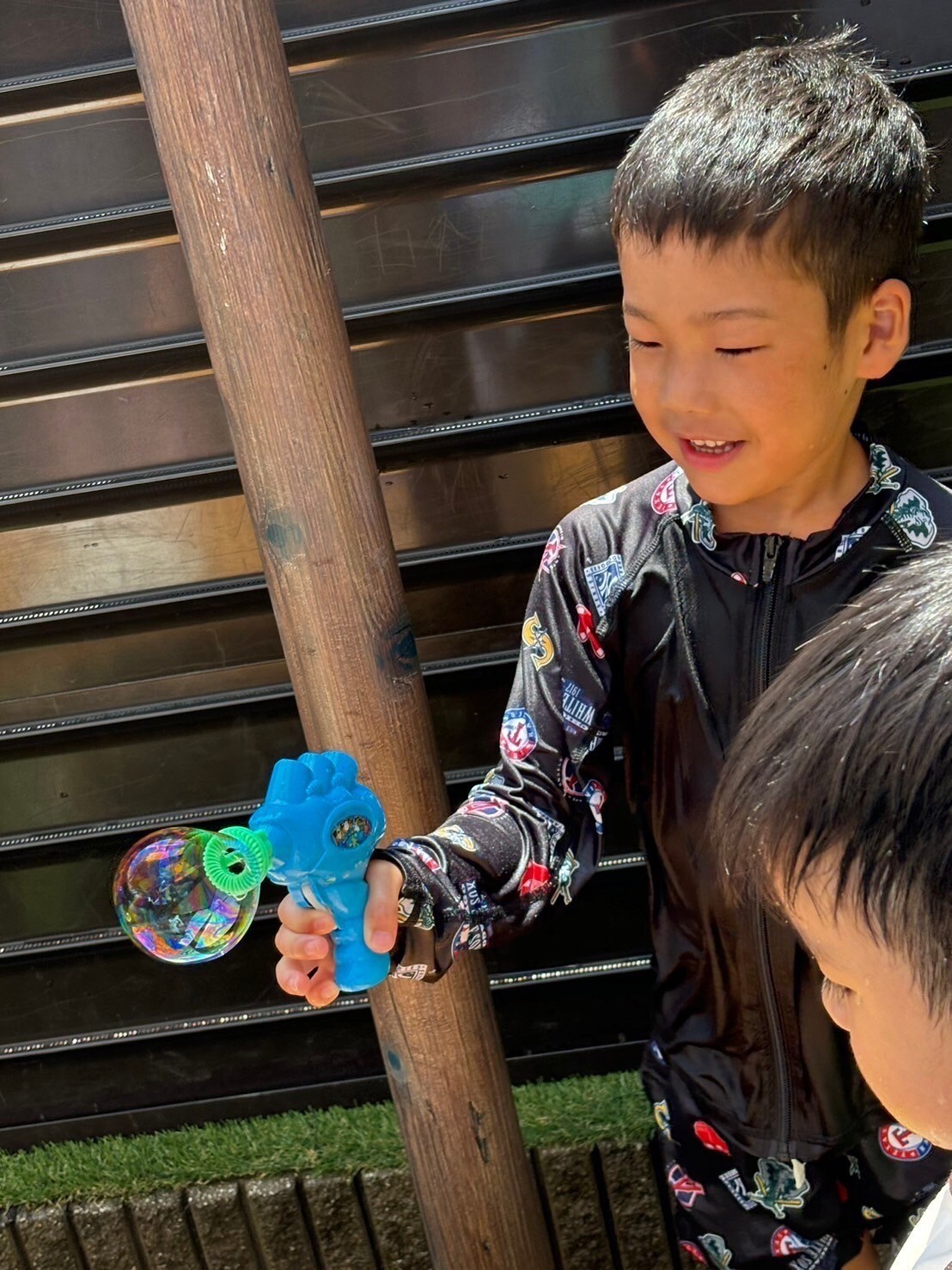 先生の出し物のシャボン玉にはみんな興味津々🤩終始笑顔で楽しむ姿が見らました😍リアクションが可愛すぎて先生たちの撮影も止まらずでしたよ📸😁水遊びでもシャボン玉で遊ぶ時間を作り、眺めたり、触れたりしてそれぞれ笑顔で楽しみました🫧💕【うさぎ、こあら、きりんぐみ】