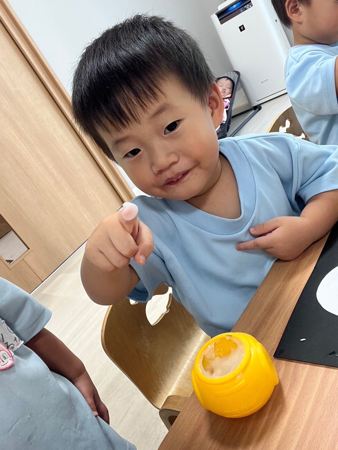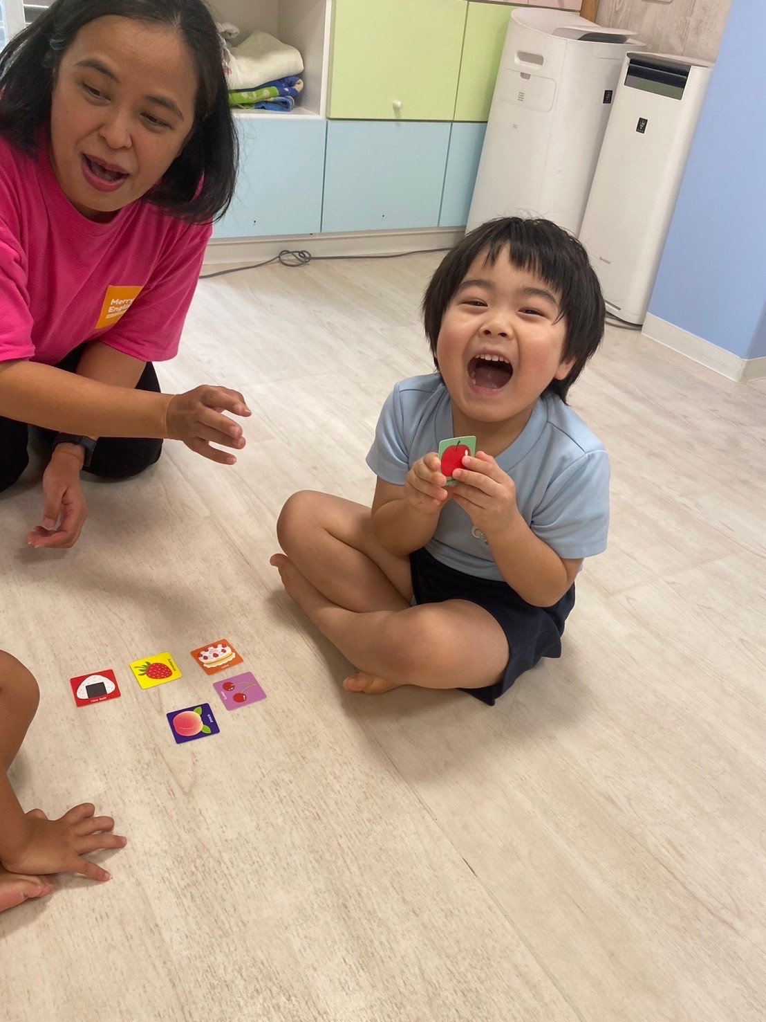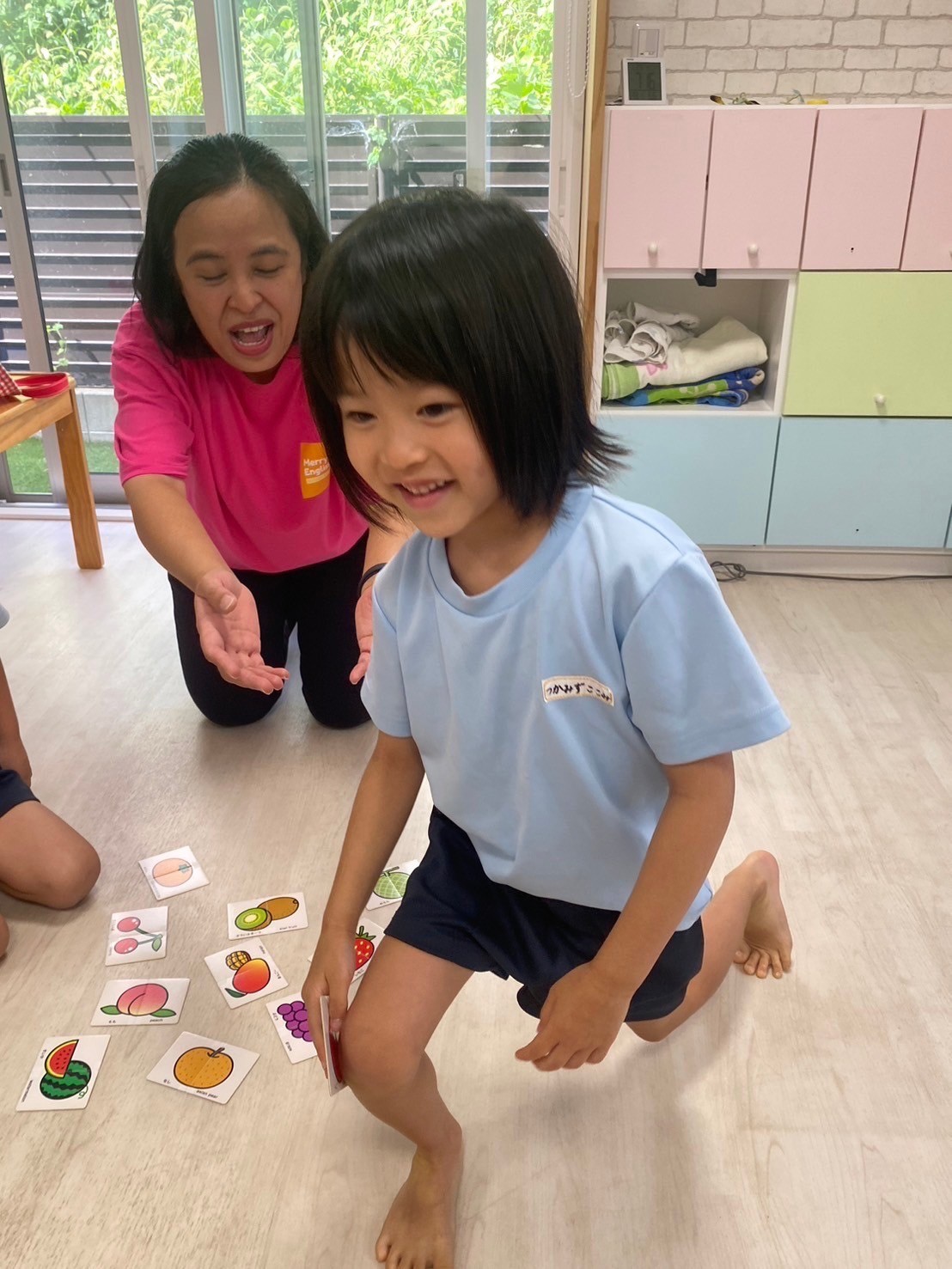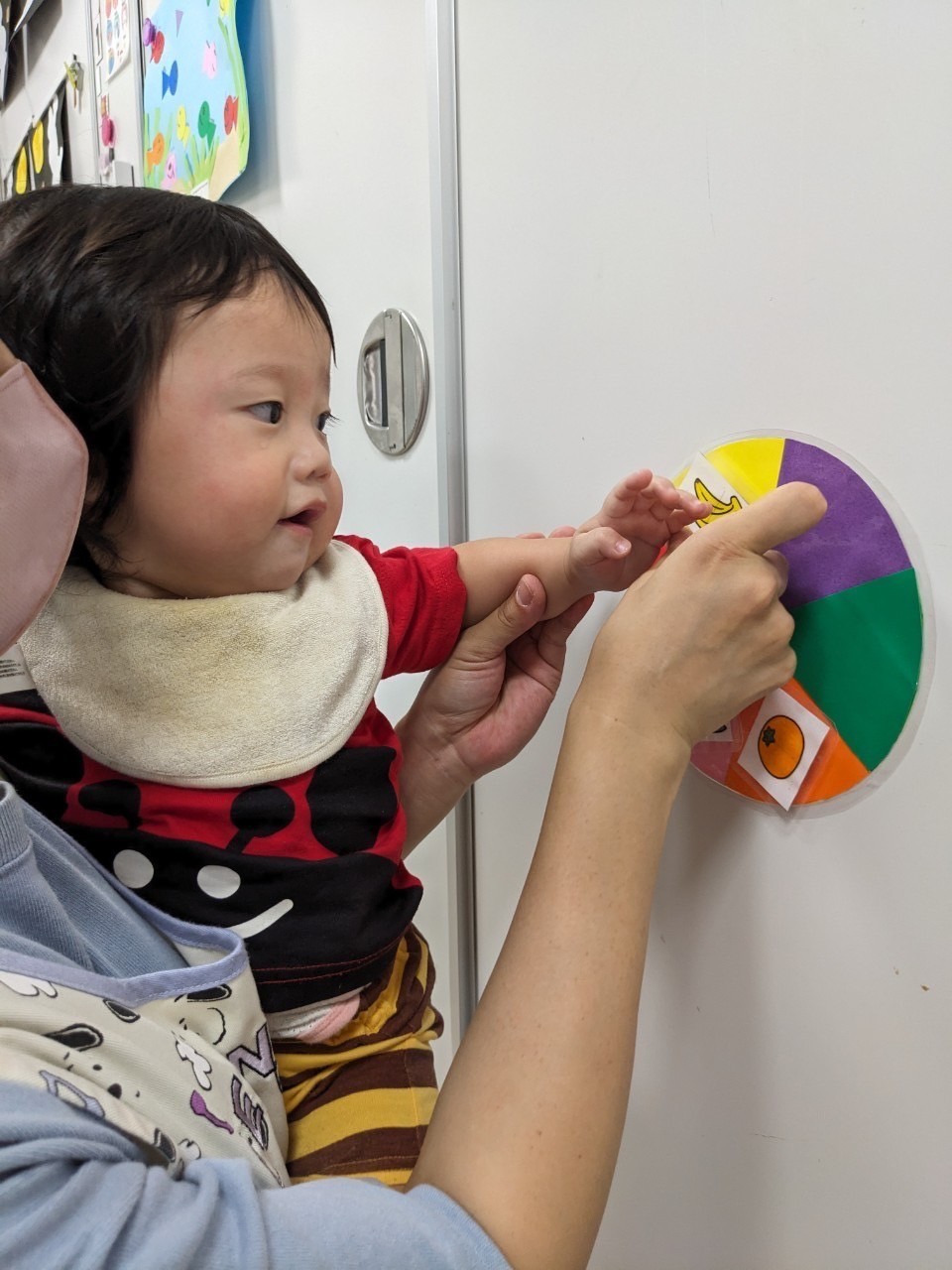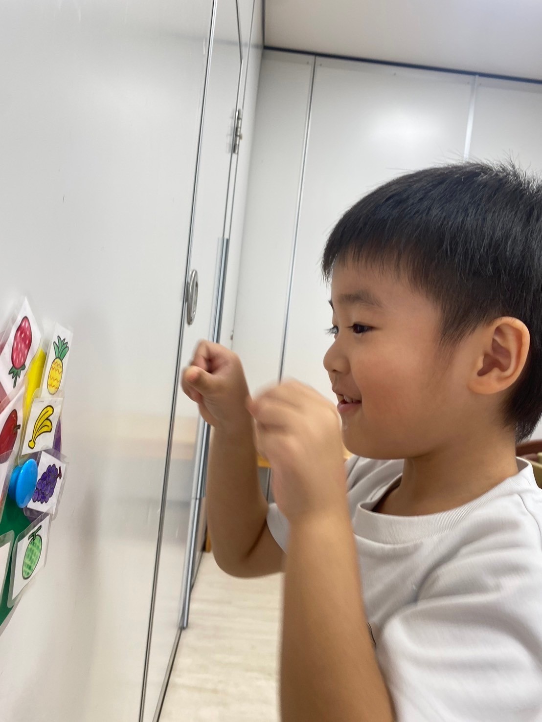 その後は大好き英語レッスン🤩フルーツや色の英単語を積極的にこたえることができていて、ゲームでは上手に色を選んで同じ色の仲間のところに貼ることが できました🍎🍊🍇