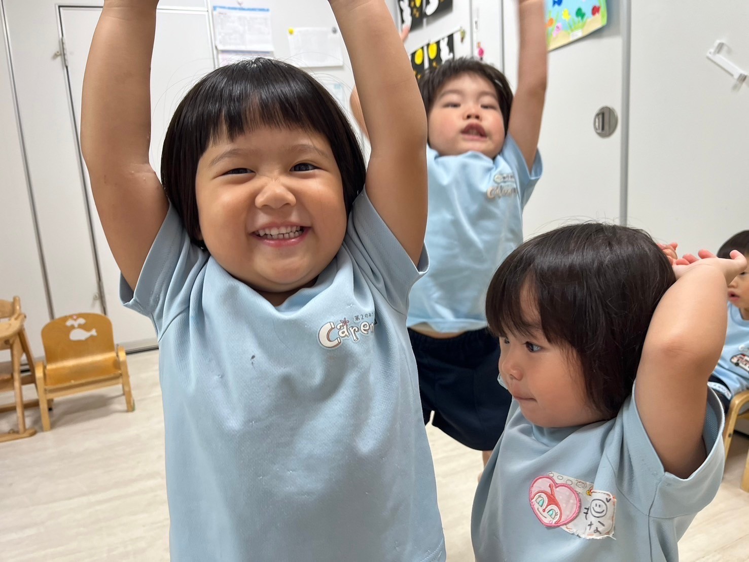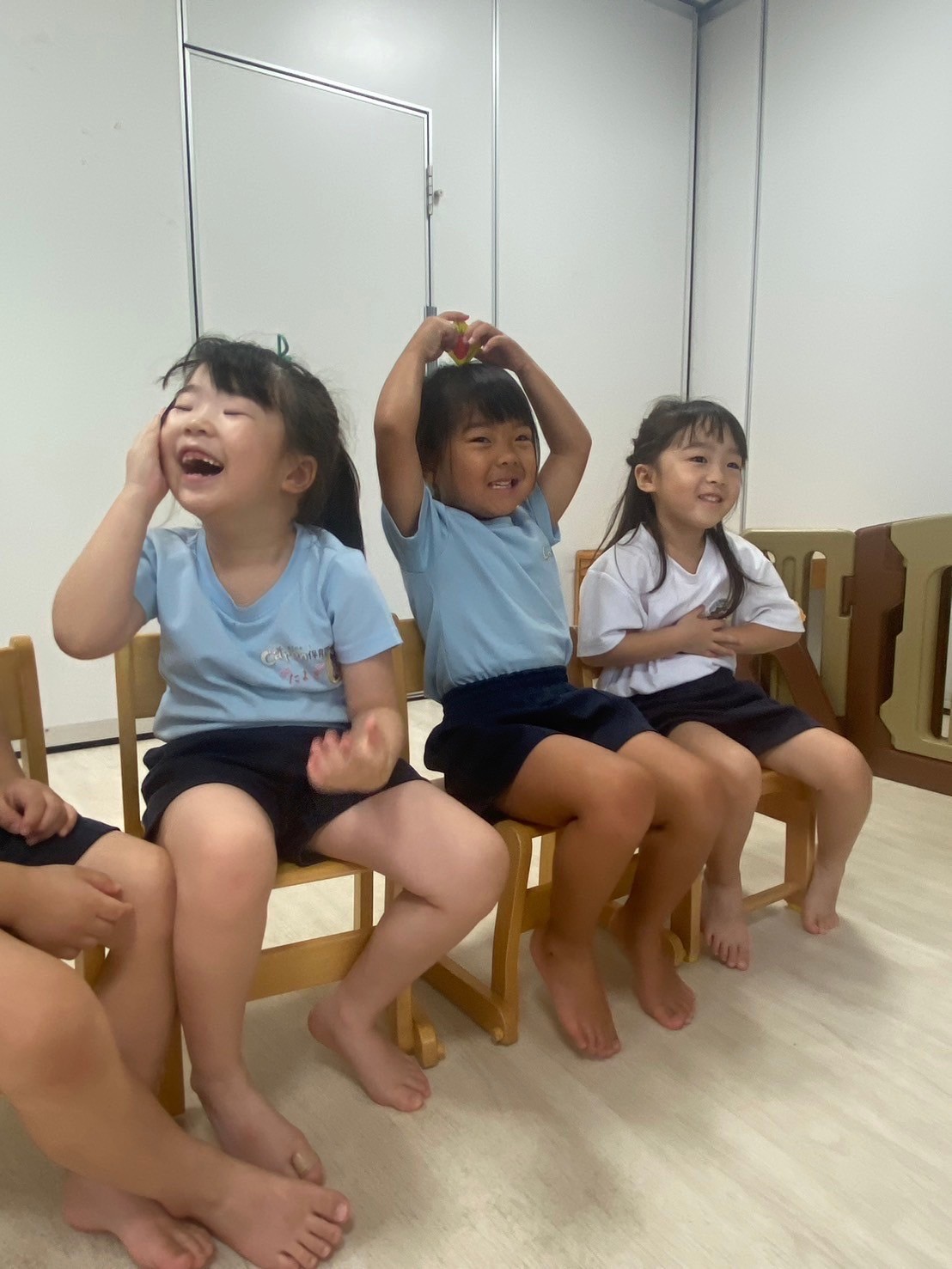 絵本に出てくる体操をお友だちと一緒にやったり、言葉にリズムをつけながらまねっこ遊びを楽しみましたよ🎶