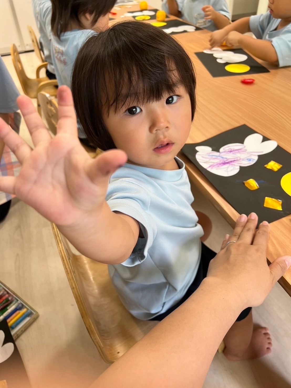糊の塗り方もコツを掴めていて、丁寧に作業ができていました💖りすさんはクレヨン描きの筆圧も強くなってきていて、ひよこさんも初めてのシール貼り上手にトントンできました😊