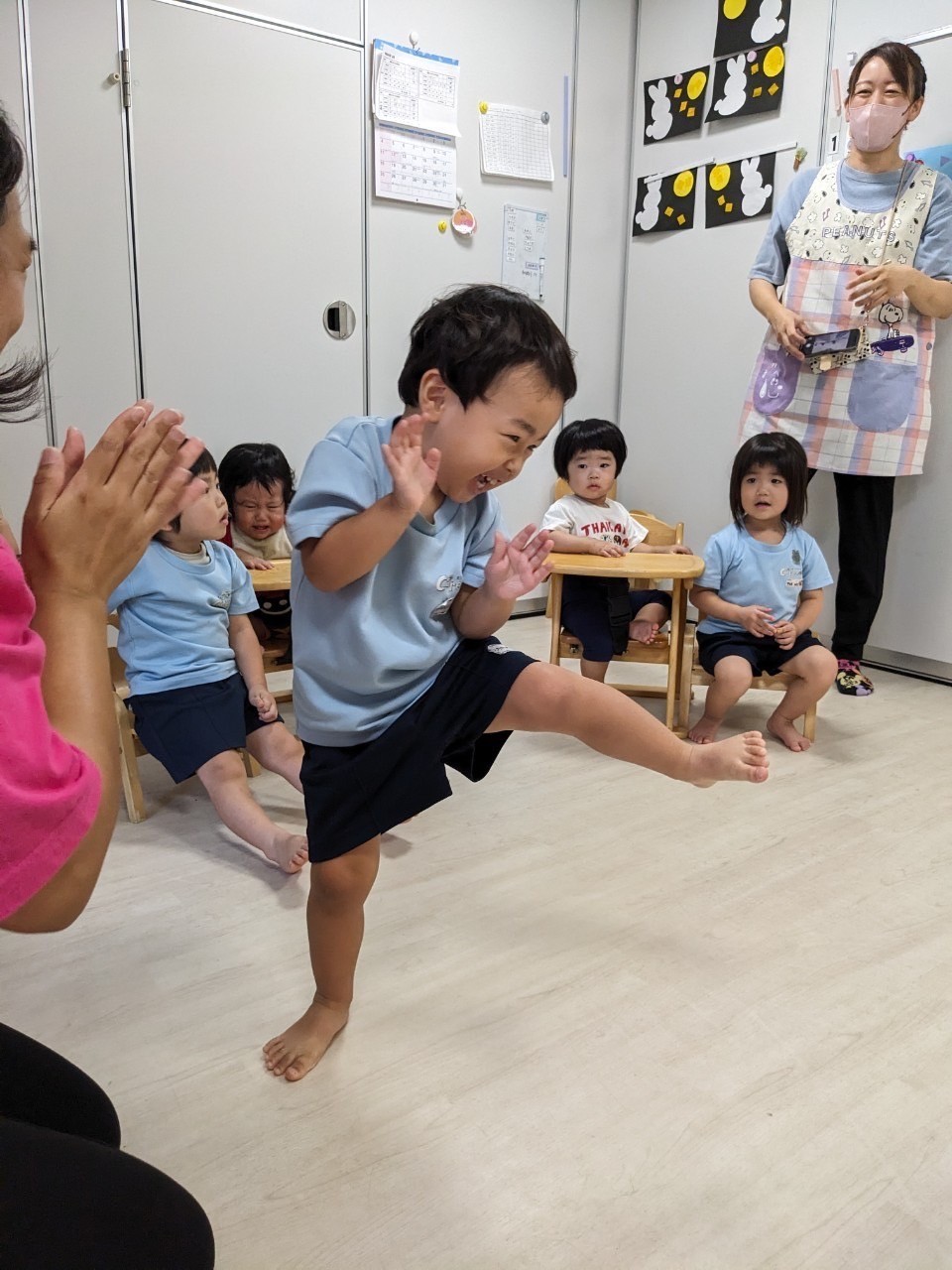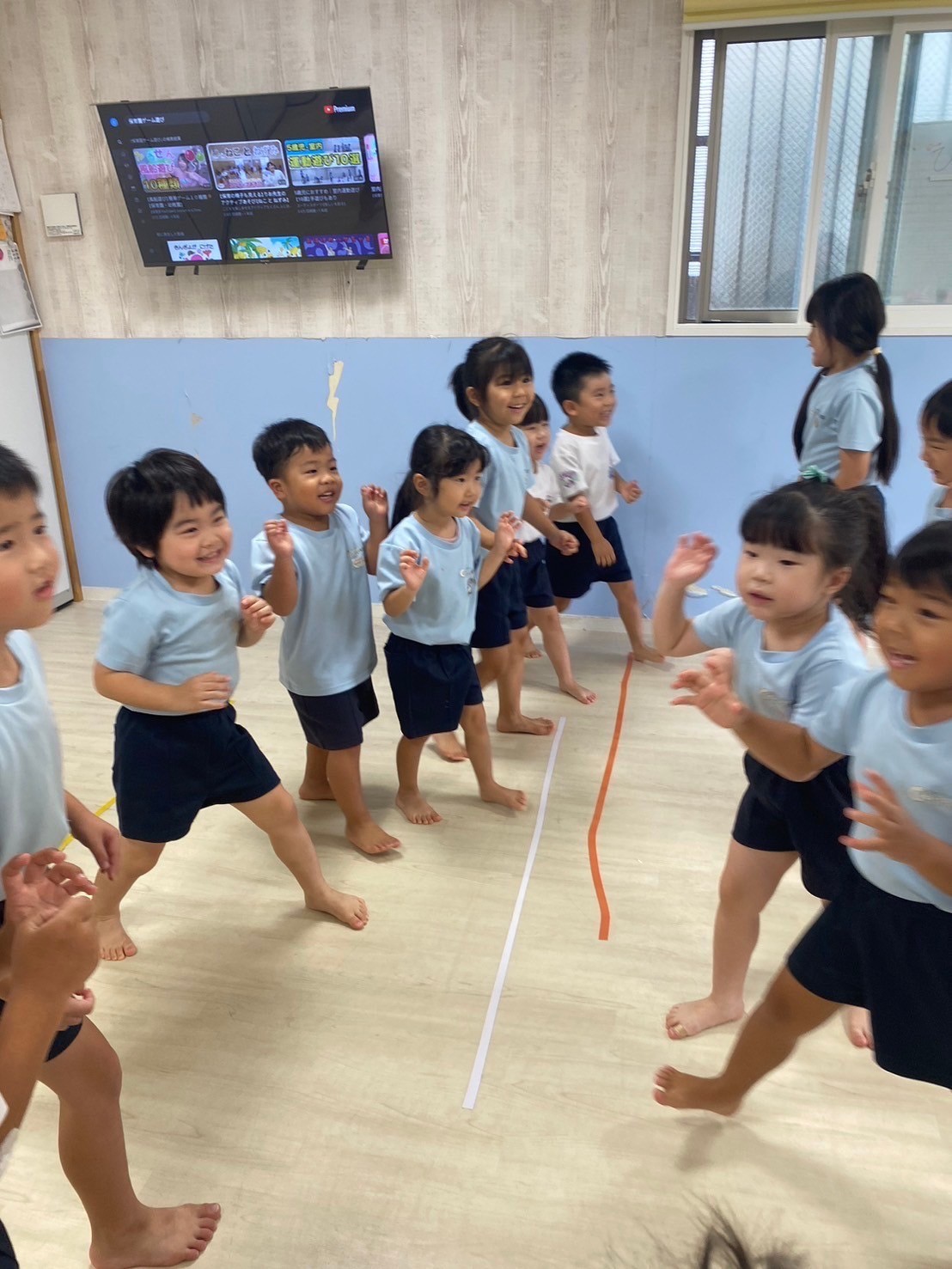 室内遊びでは、ねこチームとねずみチームに別れ先生のかけ声に合わせて捕まえたお友達を仲間にする遊びをしました😊「ニャンニャン」「チューチュー」の鳴き声も元気いっぱいでめいっぱい遊ぶ姿があり楽しい時間を過ごすことができました😁