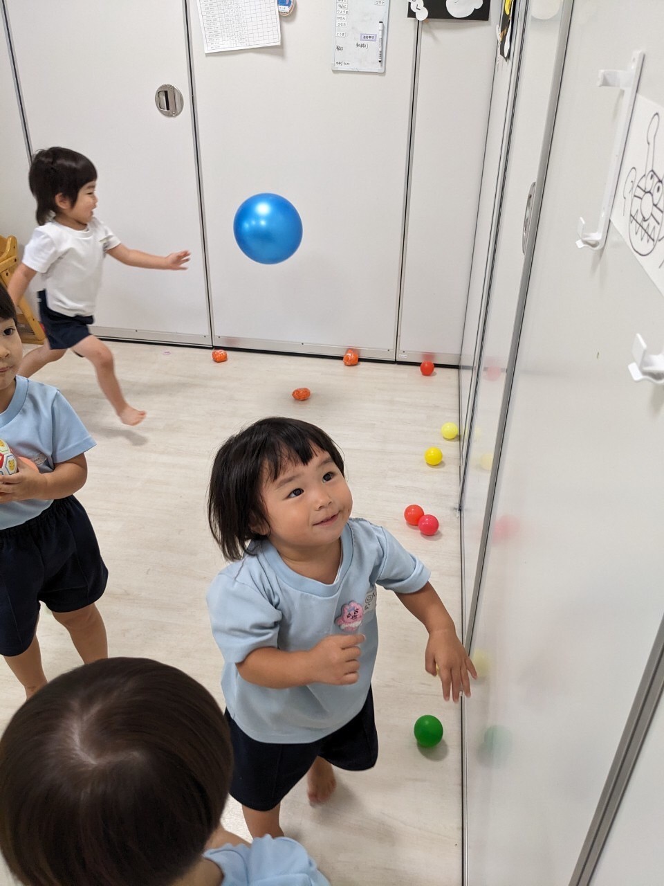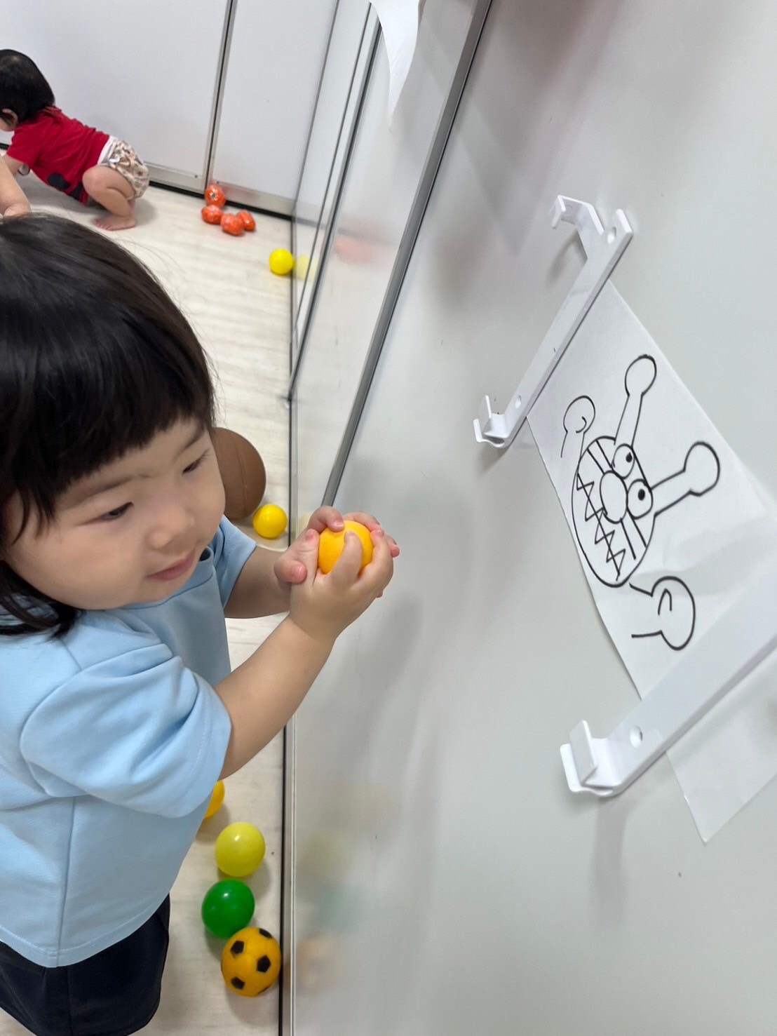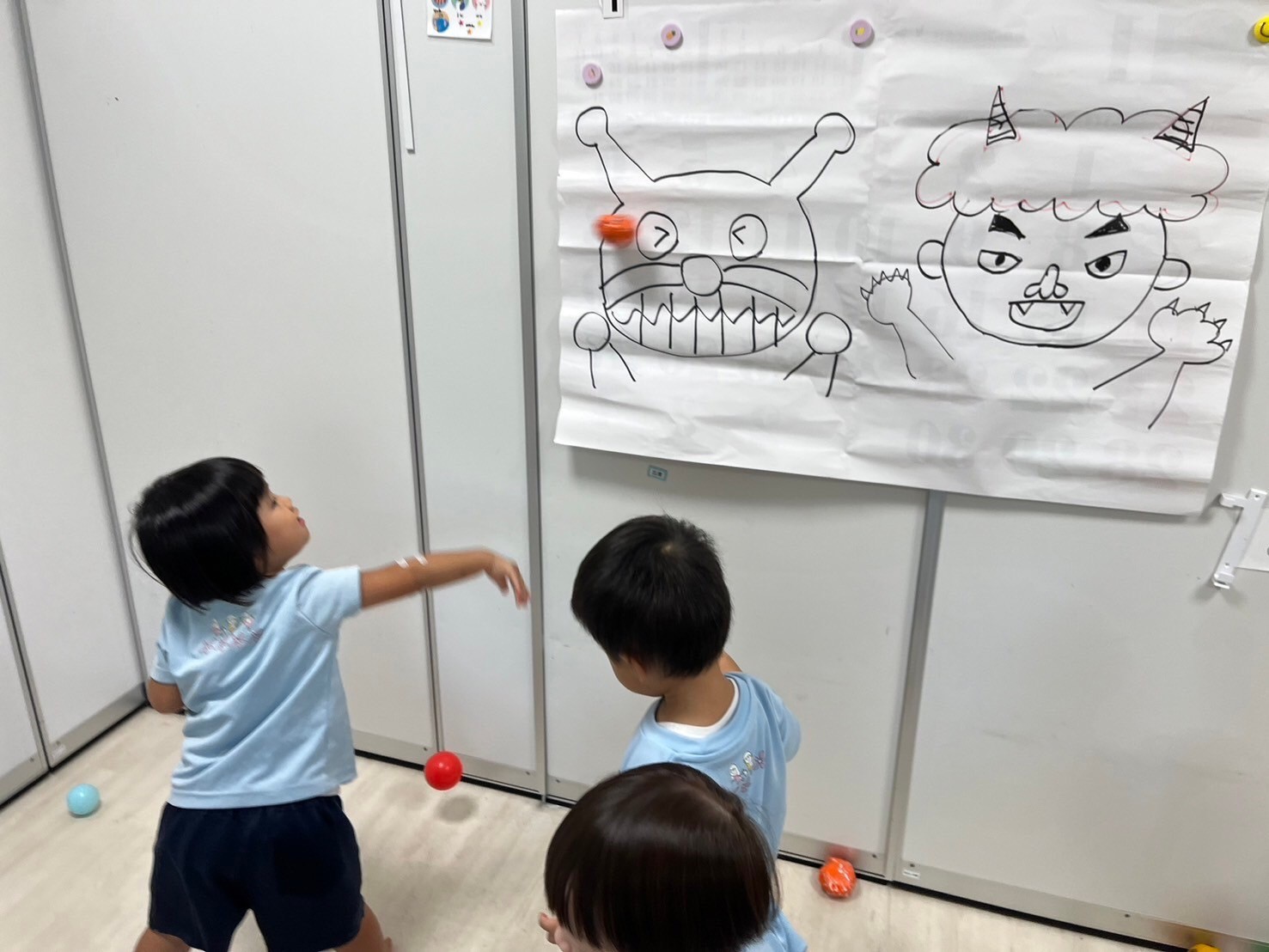 先生とのキャッチボールにも大喜び❤️壁に貼ったバイキンマンやおにさんを目掛けて繰り返し投げて楽しむだけでなく、友だちとの遊びにも発展させることができていました😆