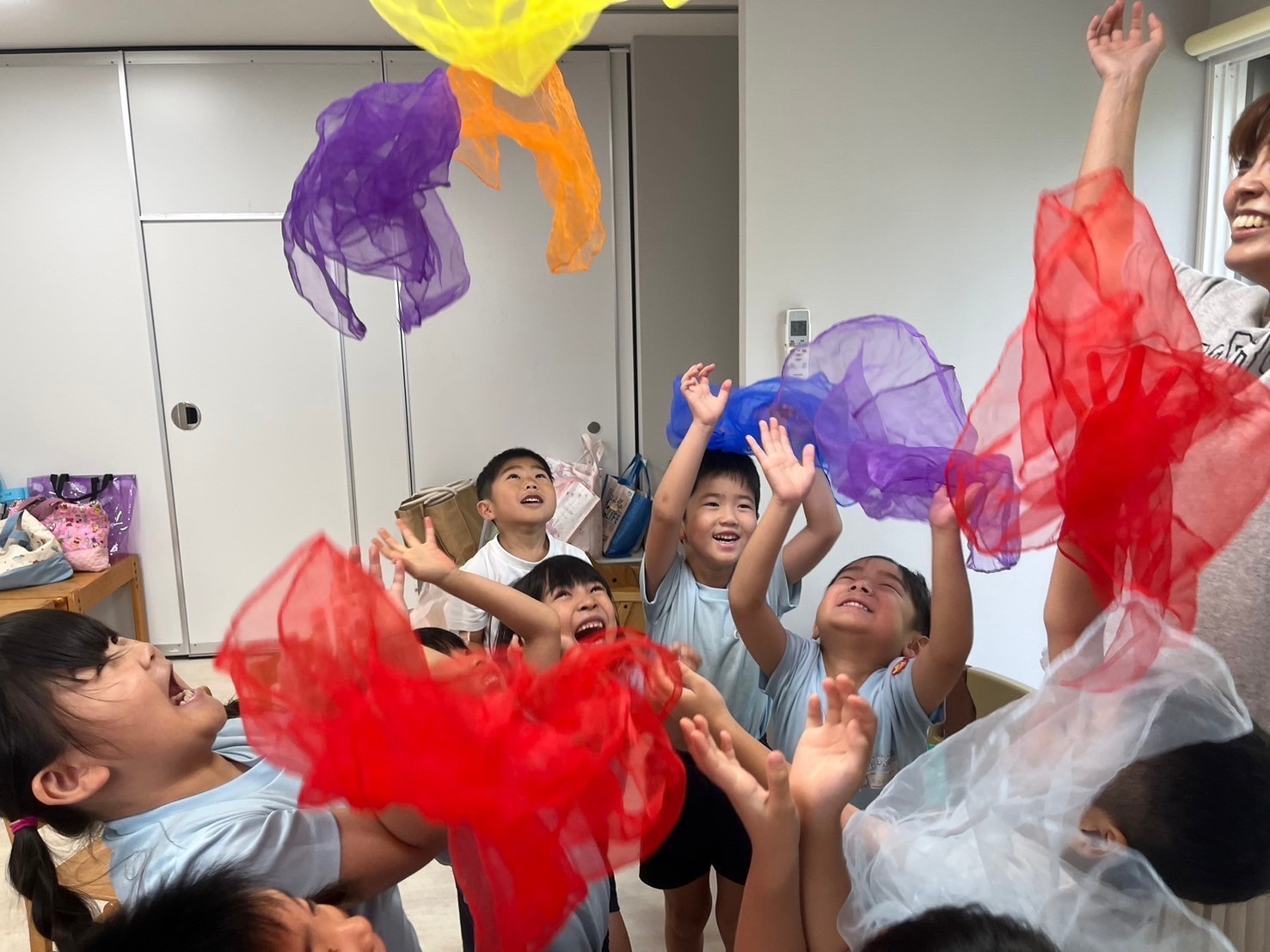 色んな楽器が登場して音から楽器を当てたり、実際に触れてみたりしました💖フラフープを使ったり、シフォンスカーフを使ったりとっても楽しい時間でした😊待ち時間には、リクエストのおもちゃで遊びました🌟