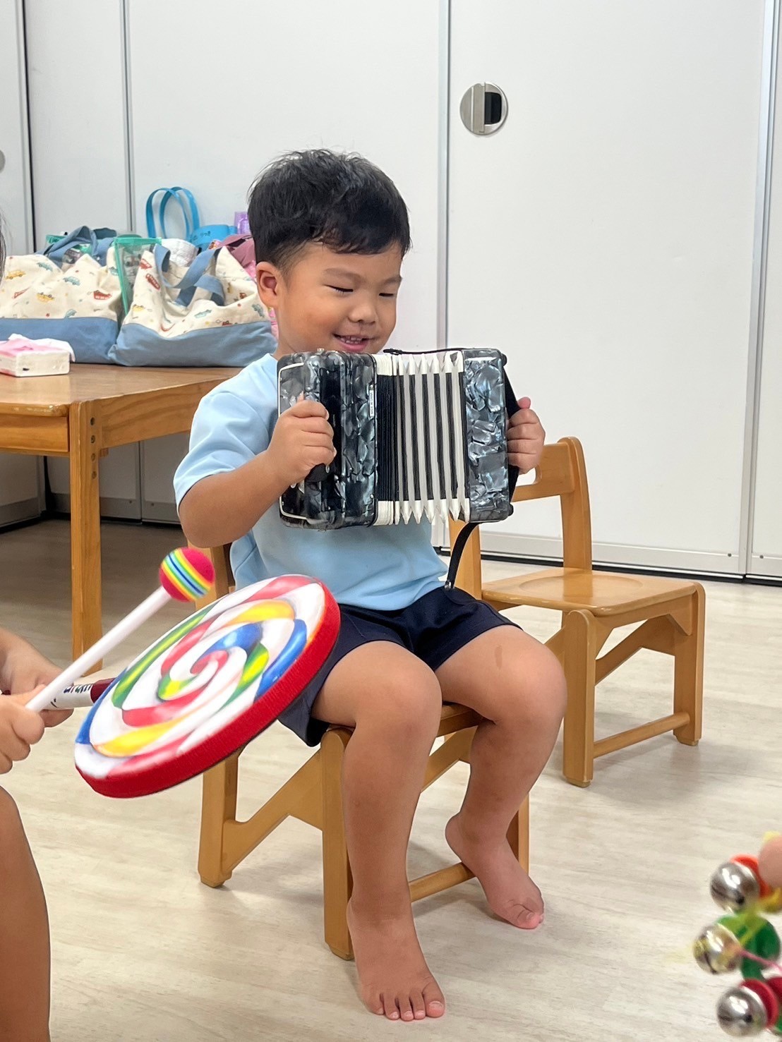 絵本に出てくるスイッチに合わせて鳴き声や動きの真似も楽しそうにできていて、ナイス表現がたくさんでした🌟ぱんだ🐼の鳴き声がわからないみんなのために、鳴き声を実際に聴いてみる時間も作りましたよ👂🌟大好きリトミックでは、さまざまな楽器の音に注目し、マラカスも自分から動かしながら音に親しめていました♬