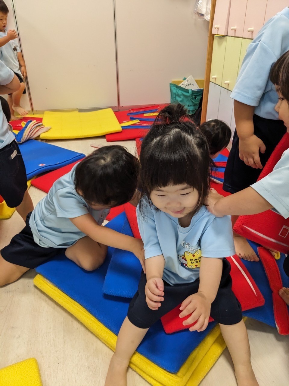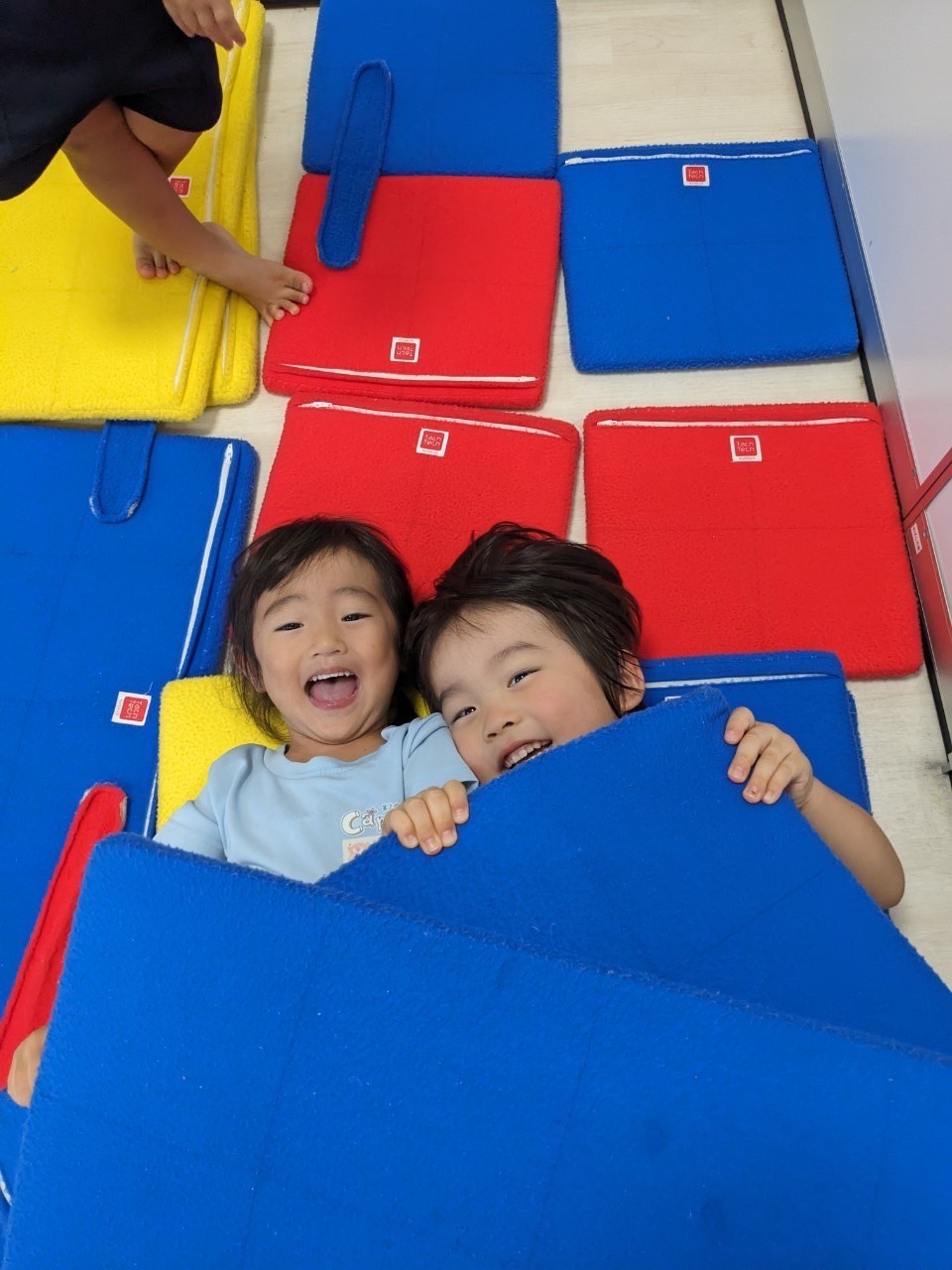 友達と一緒に寝る場所を工夫して作ったりマットの上を歩いたり賑やかに過ごしていました💕その時も英語の歌を自然と口ずさむ姿が見られました🎶