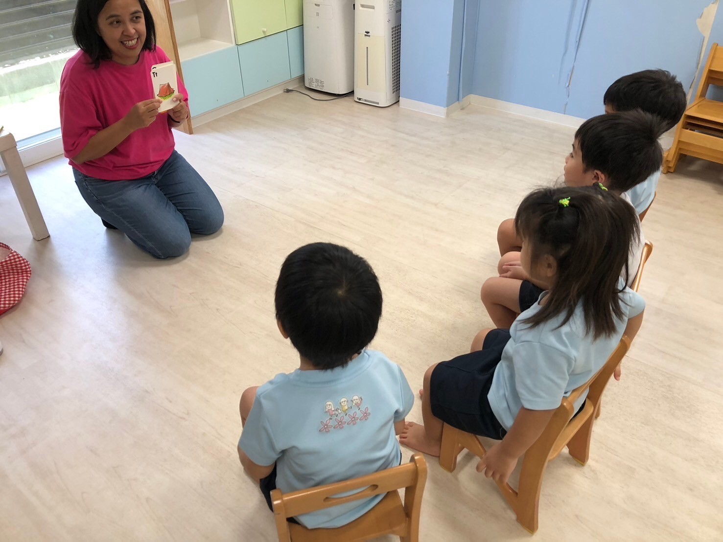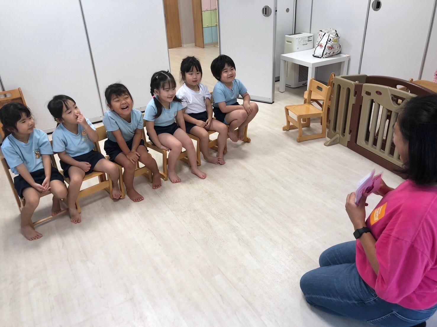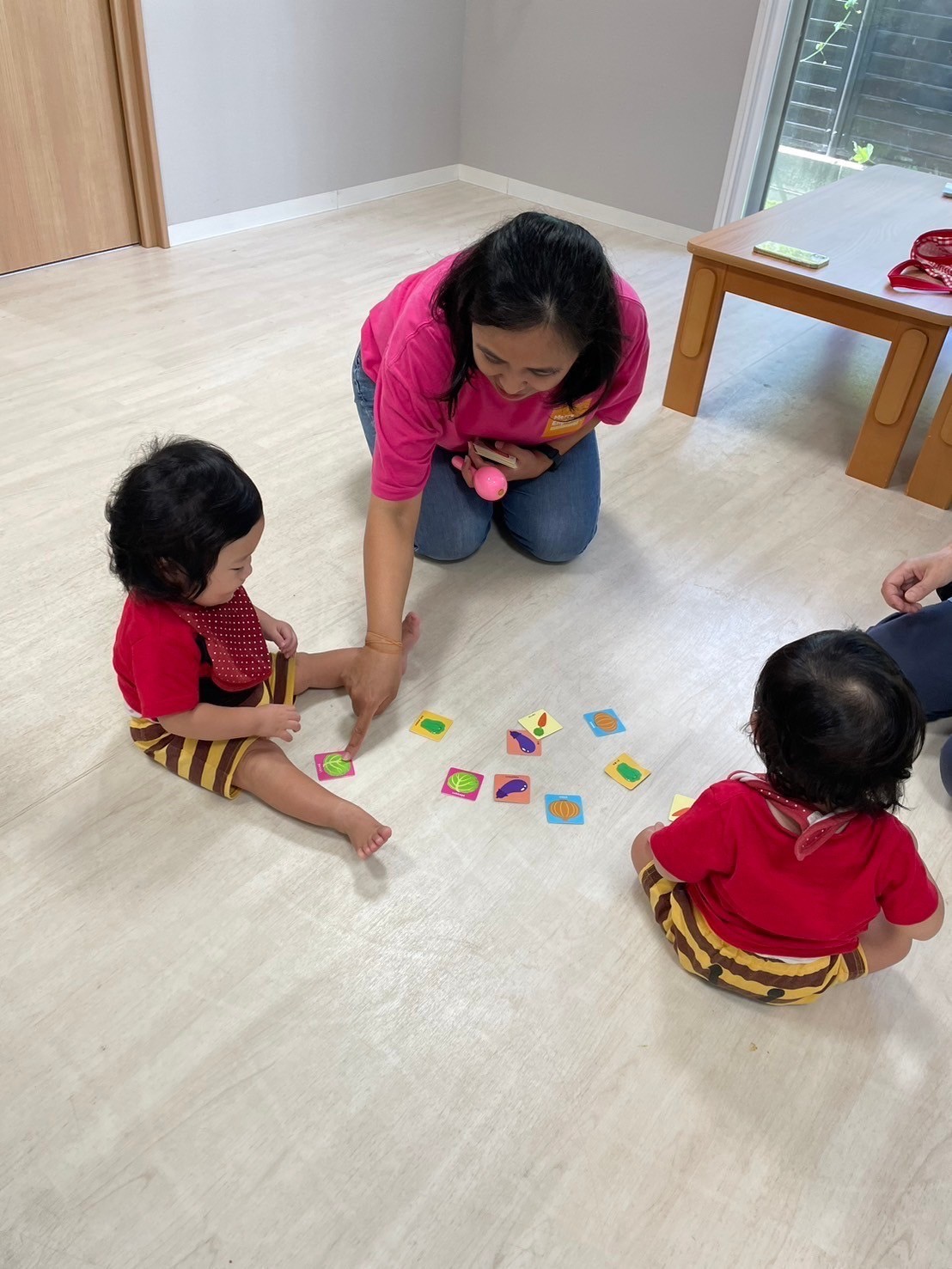 絵本の読み聞かせなどを十分に楽しんだ後は英語レッスン。チャリナ先生が来るとみんな興奮状態に🤩発音練習を元気よく楽しみ英語でカルタゲームもしました✨その後のマット遊びも元気いっぱいの子ども達🥰