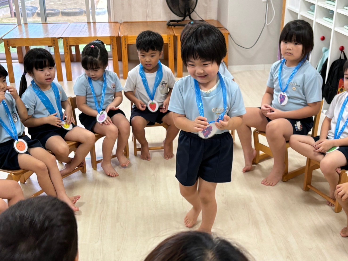 今日は9月生まれのお友だちの誕生日会🎊🎂朝からウキウキした様子の誕生児さんでしたが、インタビューではちょっぴり緊張気味😁でもしっかりと答えていましたよ💖警察官になる夢も、ケーキ屋さんになる夢も叶えてもらいたいと思います☺️✨今月の出し物は、パネルシアターで十五夜のお話でした🌝お供えしてあったお団子を食べられてしまって涙したお月様でしたが、優しい動物たちのおかげてニコニコに戻ることができました❣️誕生日会の後はみんなでフルーツバスケット、うさぎぐみさんは初めてでしたが、ちゃんとルールを守って参加できましたよ😄最後は席替えをして、給食タイムだったので会話が弾んでいました🌟