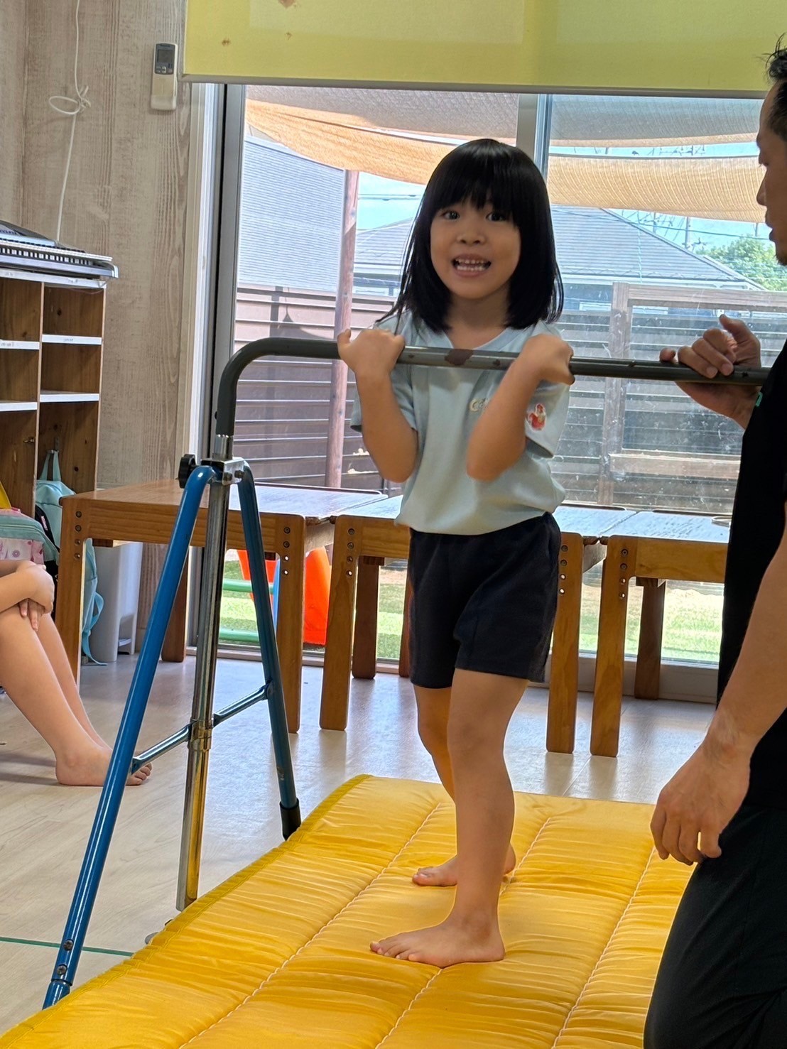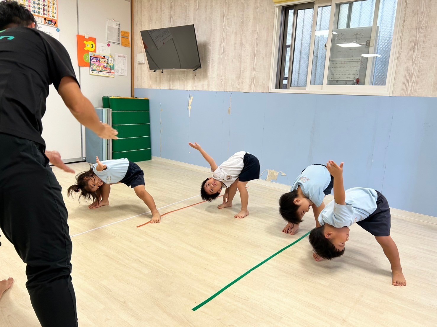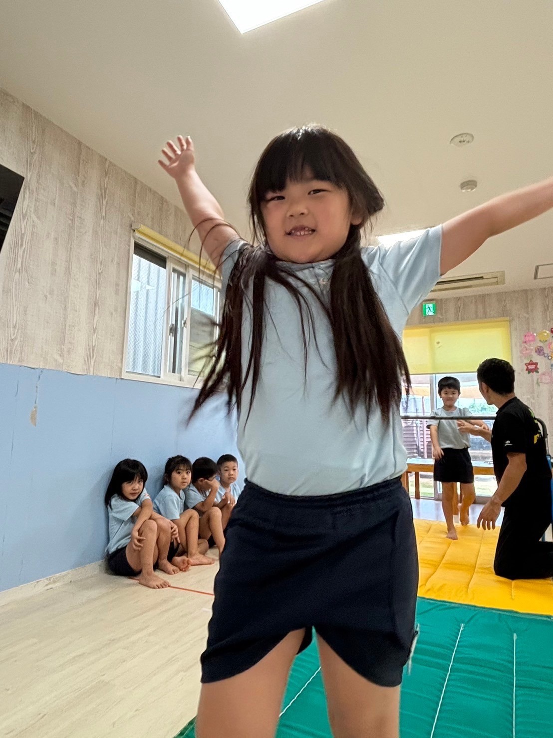 歌やダンスの練習をしたあと、てる先生の登場🤗体操教室です🤸🩷怪我をしないように十分に準備体操をしてからレッスンスタート🌟うさぎ組さんは足抜きまわり、こあら組さんは前回り、きりん組逆上がりと鉄棒は学年別の技で、マットでは前転を頑張りました❣️最後にはポーズも決めて少し自信がついたようでした😌💕