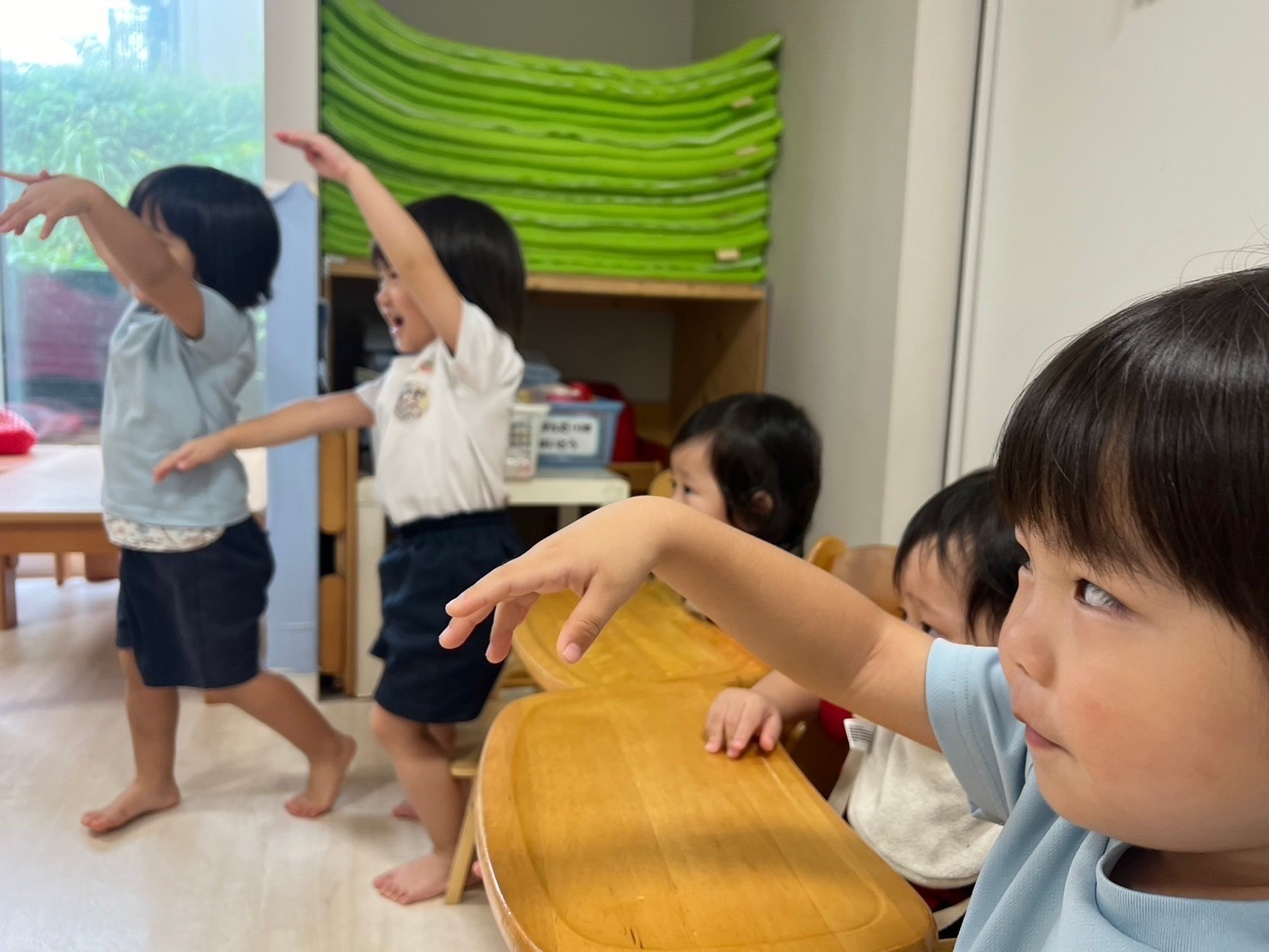今日はダンスタイムから保育がスタート🕺❣️曲が流れると意欲的に体を動かす子やじっと眺めて楽しむ子などさまざまな反応が見られましたよ😊これから色々なダンスを楽しみながら発表会で踊りたいダンスをみんなで決めていけたらと思っています😍🌟
