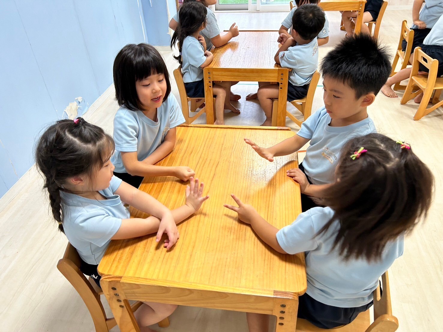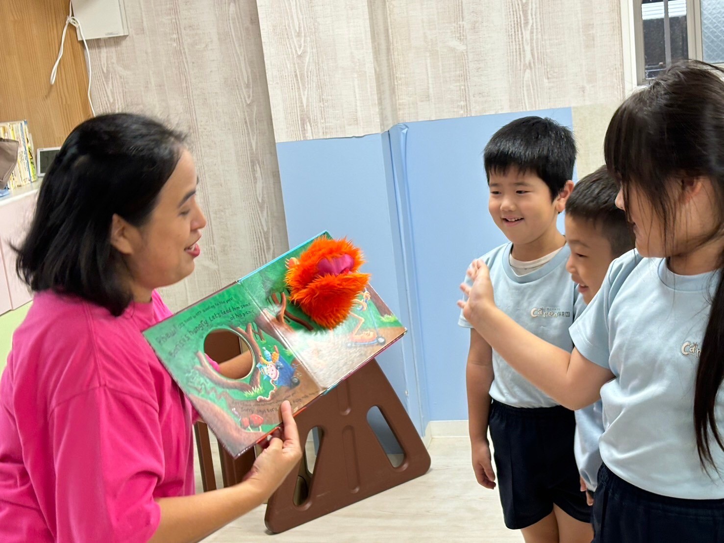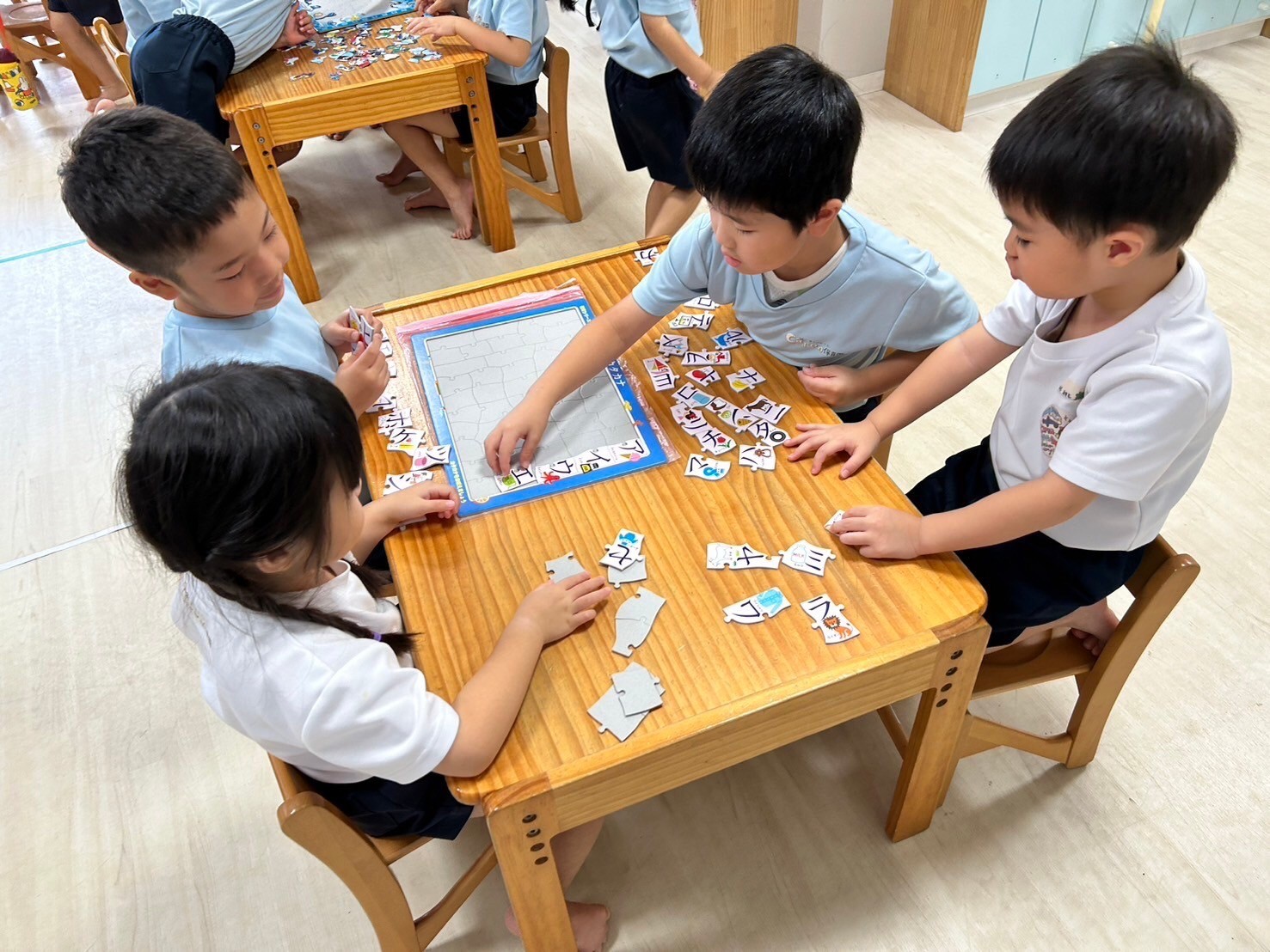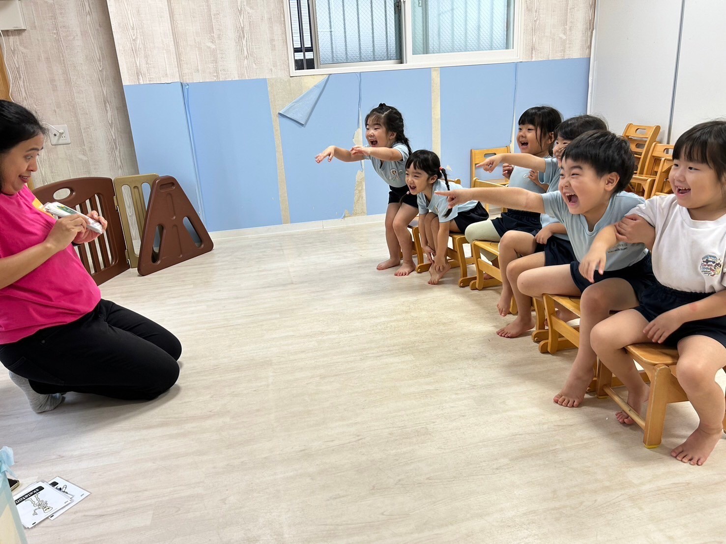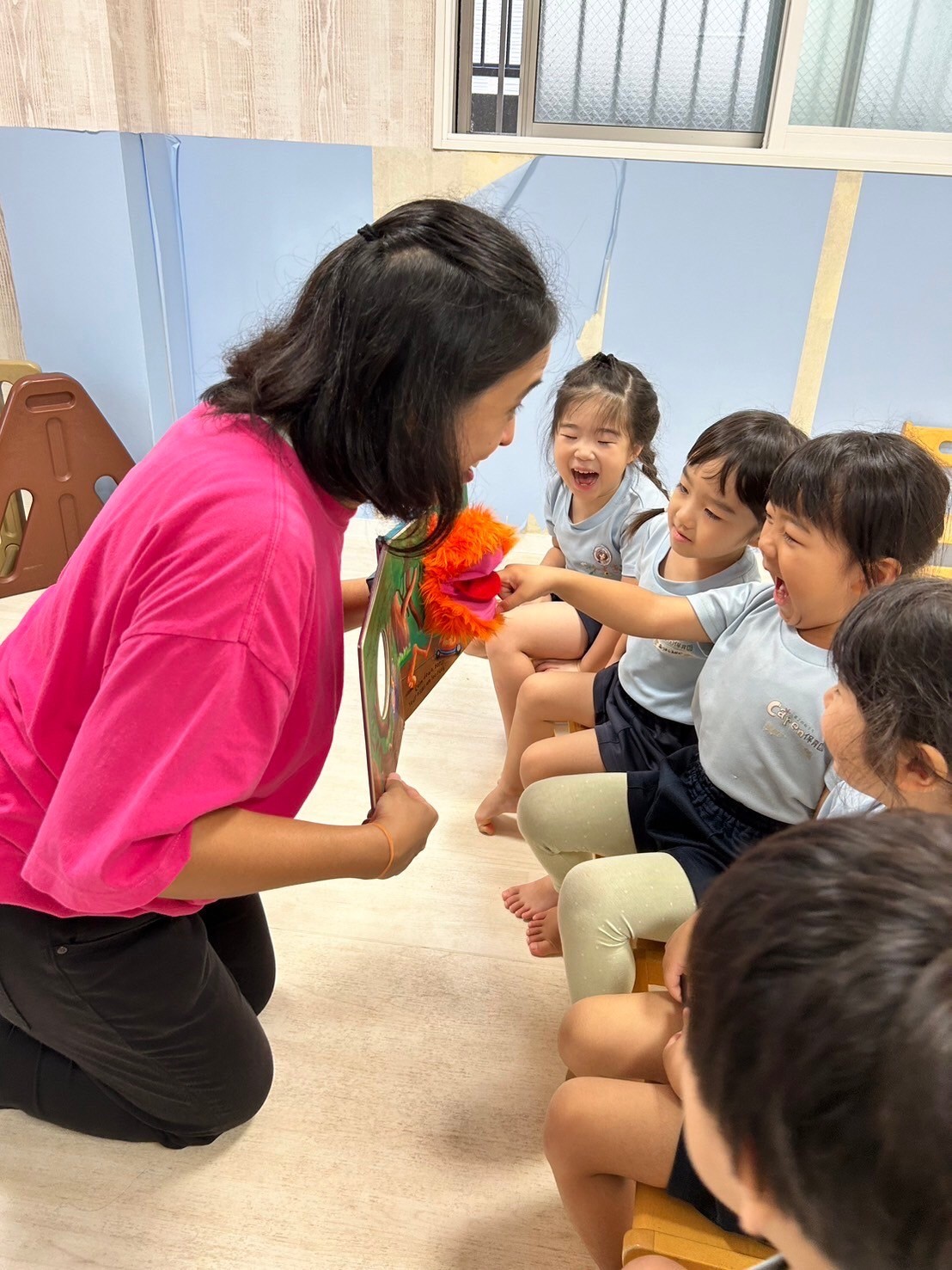 今日は英語レッスンの日🌟自己紹介では名前だけでなく、年齢も発表しましたよ💖今日のレッスンではチャリナ先生のお友だちのモンスターも登場して触れ合うことができ、いつも以上に大盛り上がりでした😆❣️アルファベットカードに隠れたハロウィンカードを見つけては『go away』と元気に追い払いましたよ👻レッスンの待ち時間にはハンカチ落としをして遊んだり、席替えをしたりしました🙌❤️レッスンが終わった後には新しくなった席で絵本を見た後、チームワークを高めるべくパズルをしました☺️順番にやりたいパズルを決めるグループ、話し合いで決めるグループ、ジャンケンで決めると様々な様子がみれました🥰
