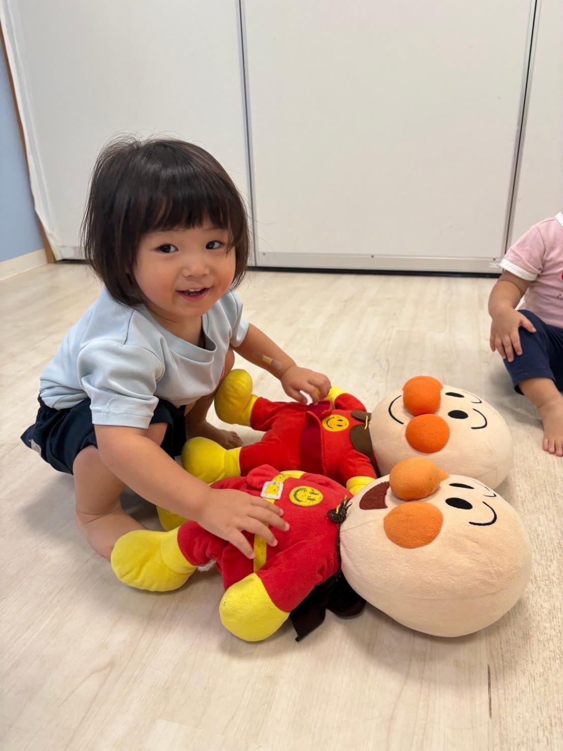 アンパンマンのお人形を赤ちゃんにみたてて、「とんと~ん、ねんね〜」とお世話をしてみたりよーいどん、で上手に走ってみたりと