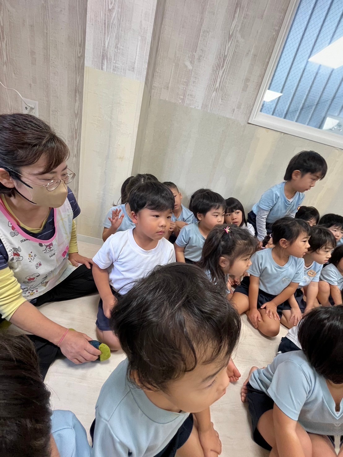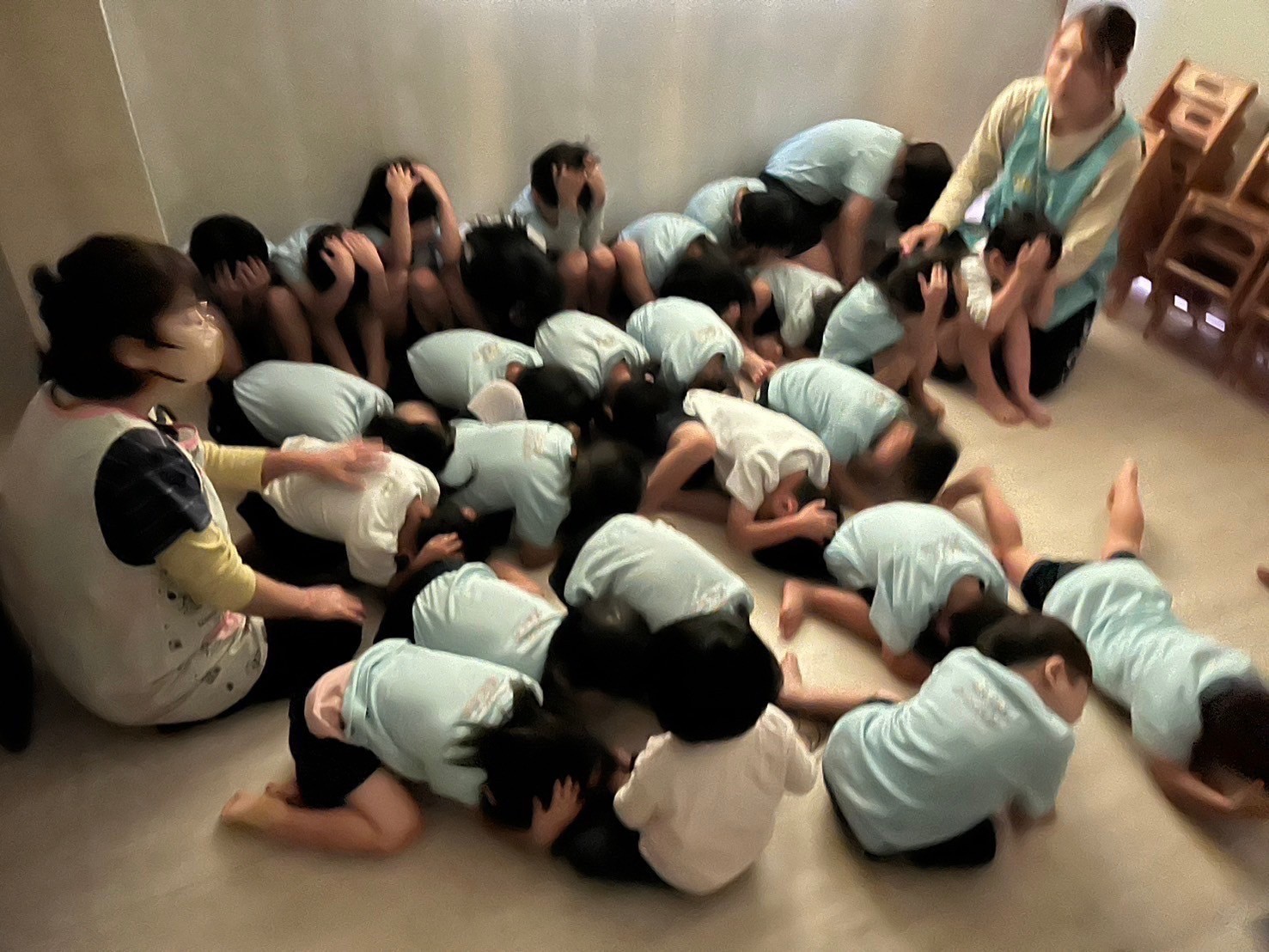 今日はおやつを食べようとしたら突然不審者が😨来た💦という設定で避難訓練がスタートしました‼️突然の出来事でしたが、先生たちの誘導に落ち着いて対応し、避難ができていた子どもたちです✨避難した後は頭や顔を隠して身を守るポーズも上手にでき、「怖かったけどできた✨」と自信を持って話す姿も見られていましたよ🌟