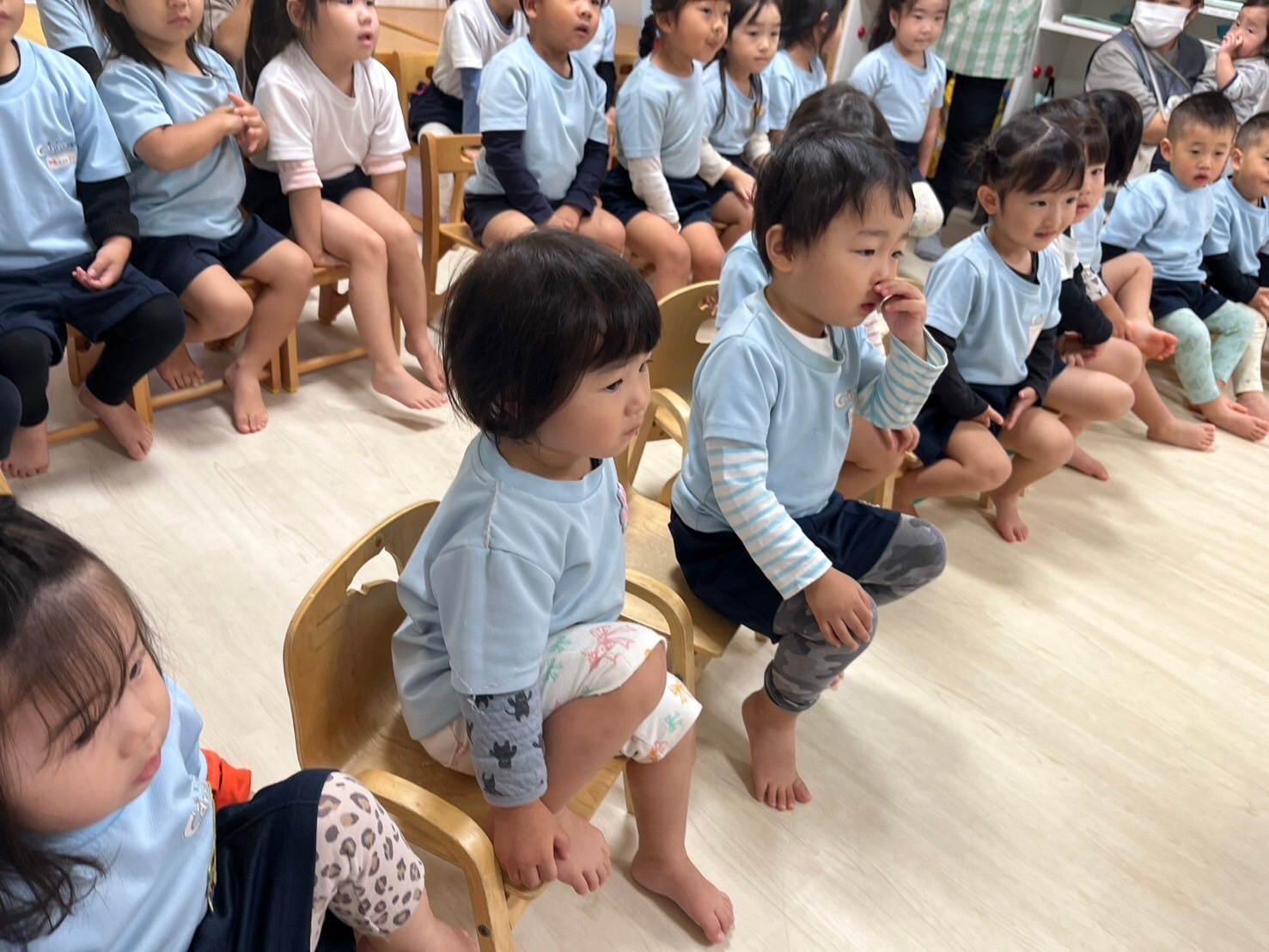 ひよこさんは先生たちに抱かれて♡りすさんは椅子にきちんと腰掛けて、最後まで参加することが出来ました👏
