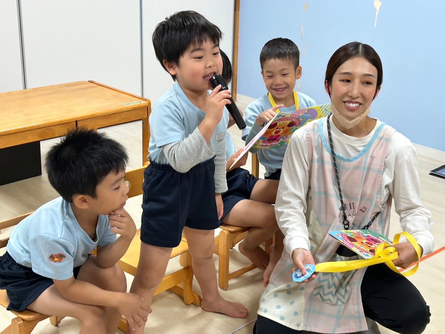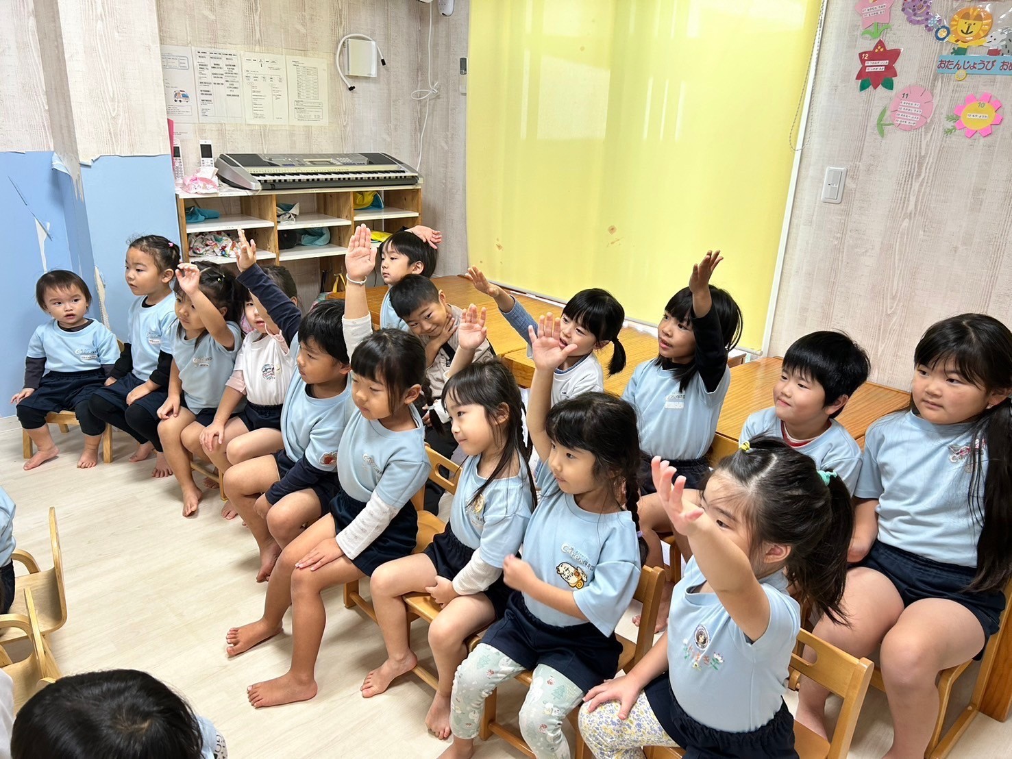 今日は11月生まれの誕生日会🎂💕今日の主役メンバーはみんな大きい組さんでした⭐️みんな自分で自己紹介をし、インタビューにも答えていました🤗先生の出し物はシルエットクイズ❣️薄暗い部屋にドキドキ・ワクワクしながら参加していましたよ🤩答えがわかった時のキラキラの表情が眩しかったです💖誕生日会の後は裏田公園に行き、ブランコや鬼ごっこ、ボール遊びで盛り上がりました😊✨鼻水が出ている子など体調不良の子もいるので週末も気をつけてお過ごしください😌🍀