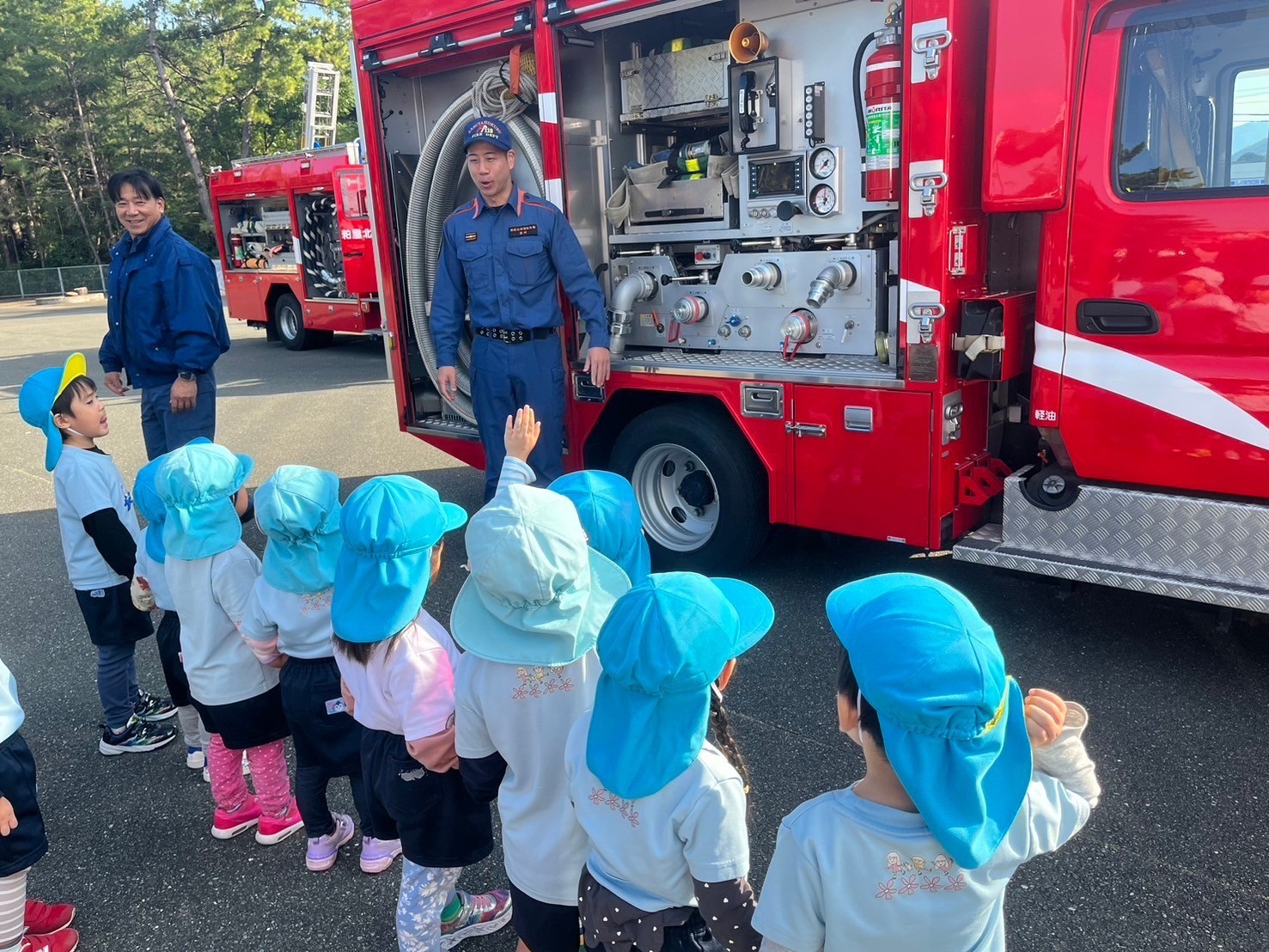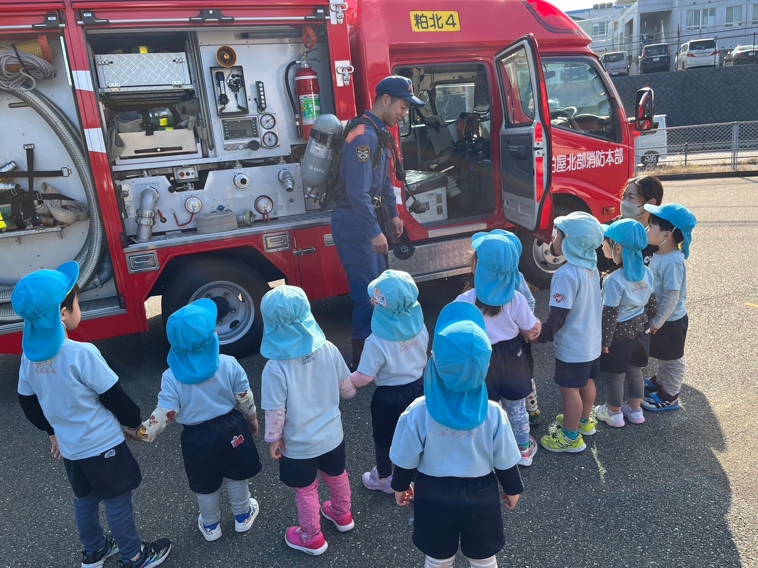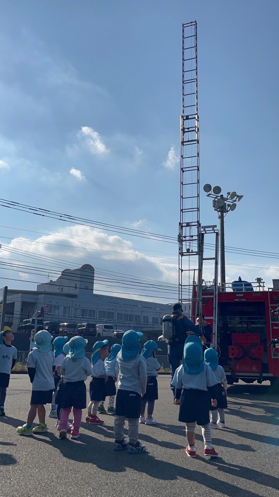 ついに消防署に着くと、たくさんの消防士さんたちに圧倒されかたまる子どもたちでした😂笑