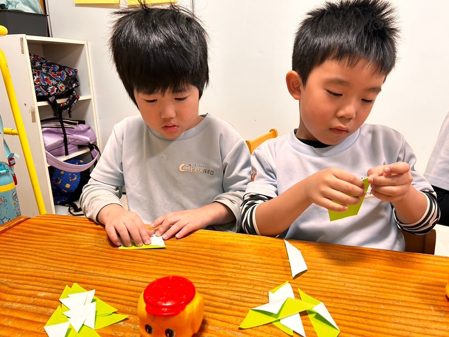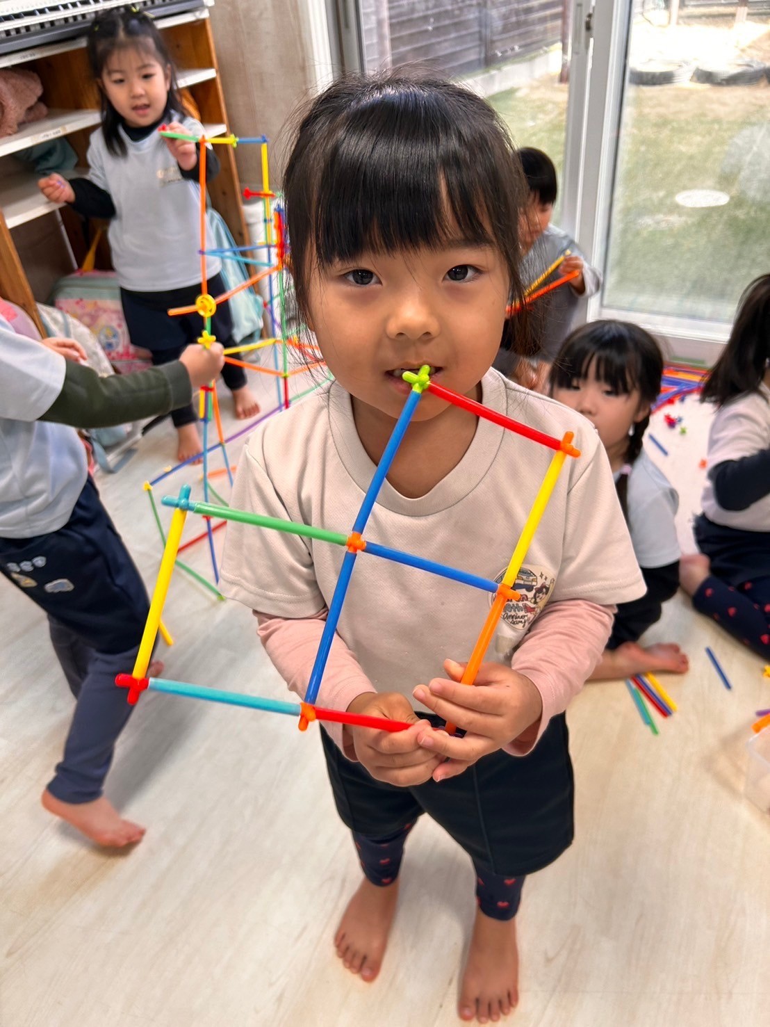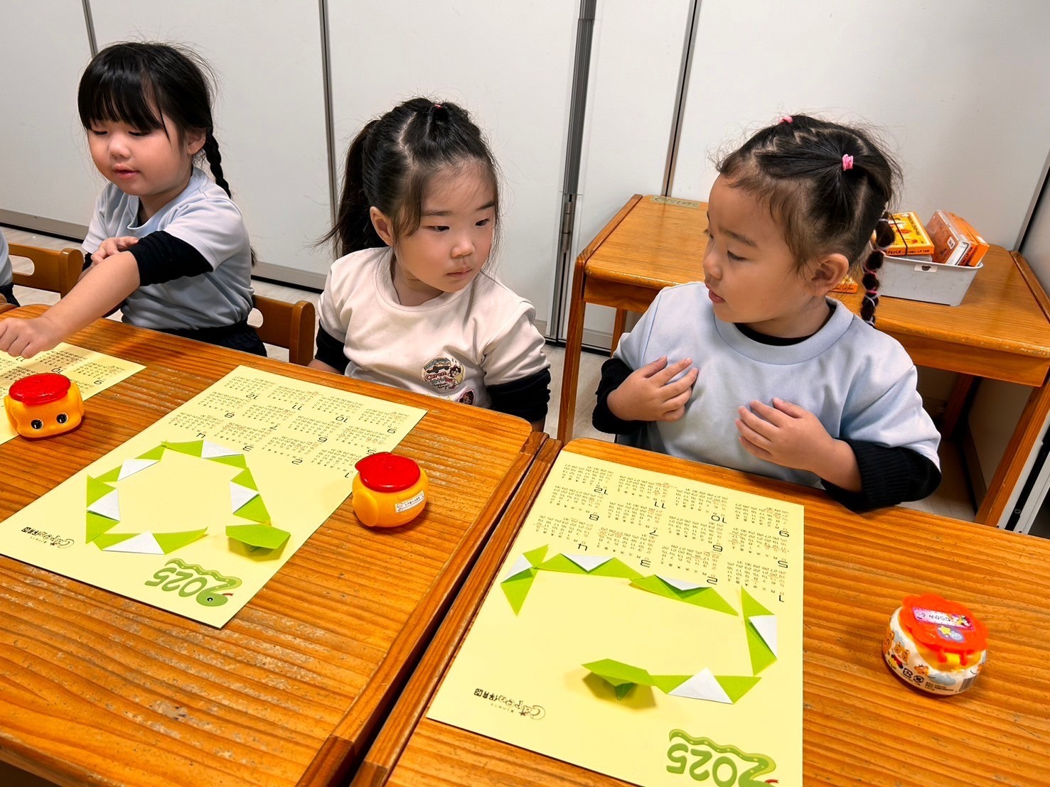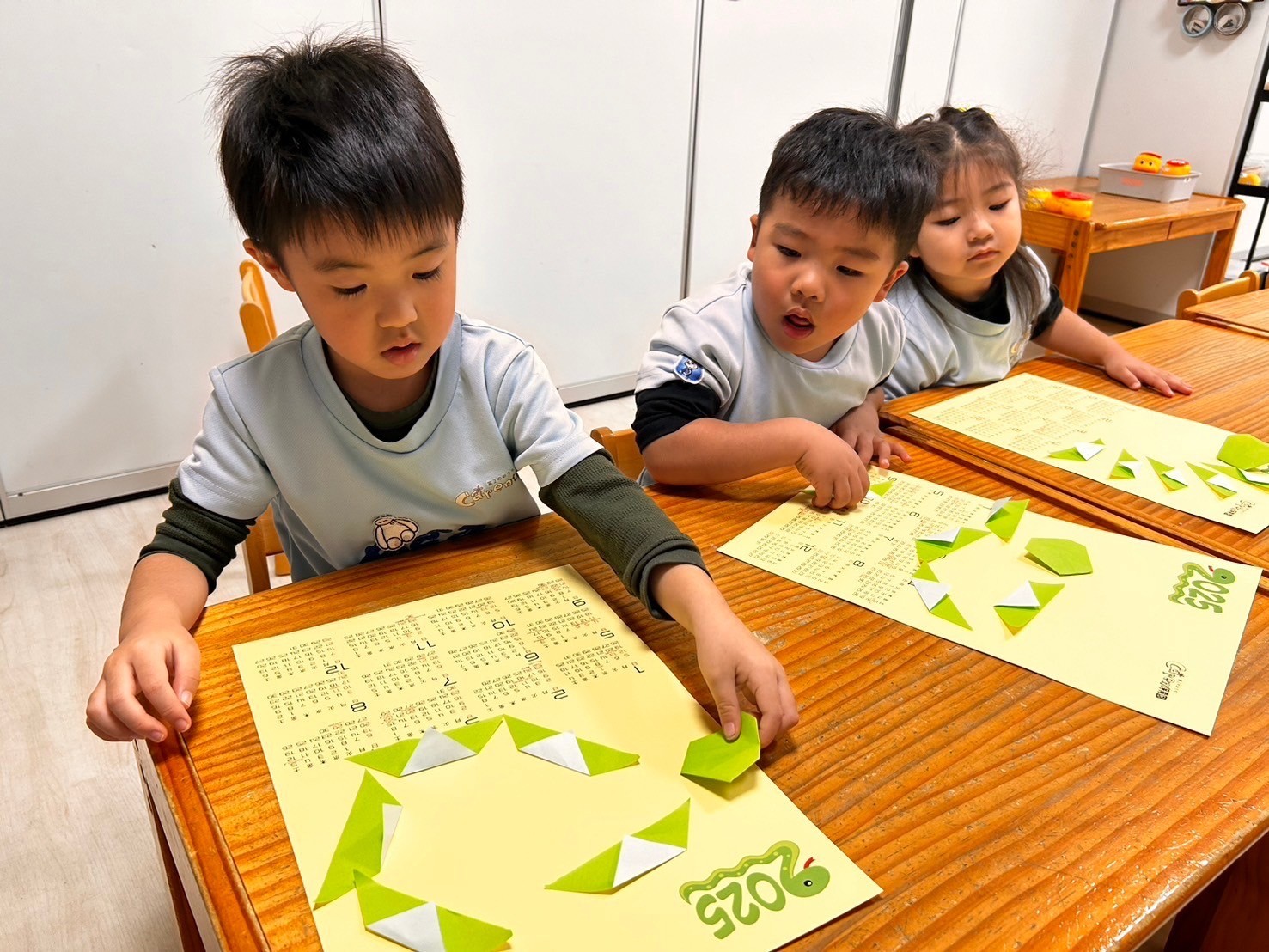 今日は英語レッスンの日🌟12月は英語で「December 」元気にレッスンだスタートしました🎄💕クリスマスにまつわるレッスンでした🥰最後にはトナカイの顔を作るゲームもあり、お互いに応援し合う姿もあり大盛り上がりでした‼️レッスンの合間にはストローのおもちゃで遊んだり、製作をしたりしました😌今回の制作は2025年のカレンダーづくりです❤️折り方は簡単ですが、並べ方で個性が出て、躍動感あふれる蛇が出来上がりました🐍🧡表情をつけるともっと個性が出るのだろうなと今から楽しみです😊❗️席替えもしてニコニコのみんなです💖