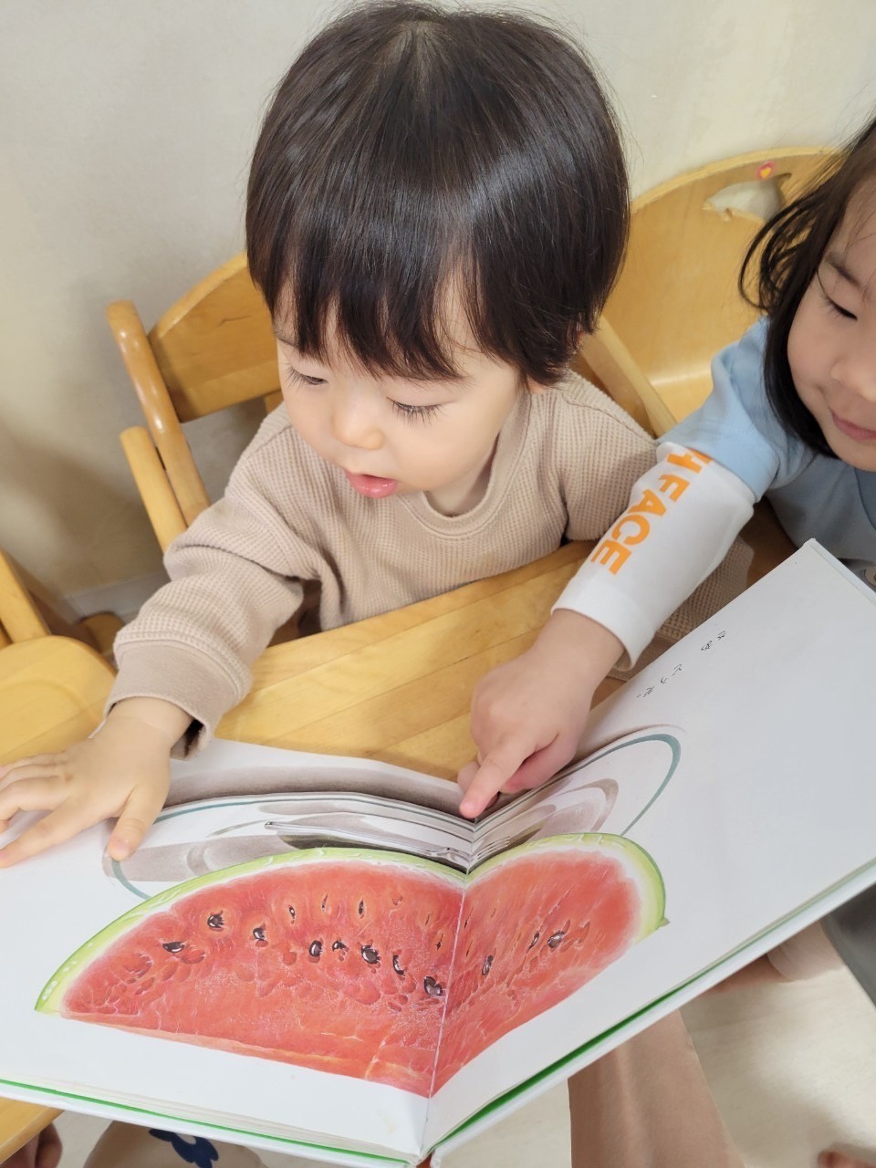 今日も大好きな絵本の読み聞かせから保育がスタート☺️くだものの絵本が大好き❣️ 「はいどうぞ!」の後にあむあむ、、、と大きな口を開けて食べる姿がとても可愛らしい子どもたちです🥰