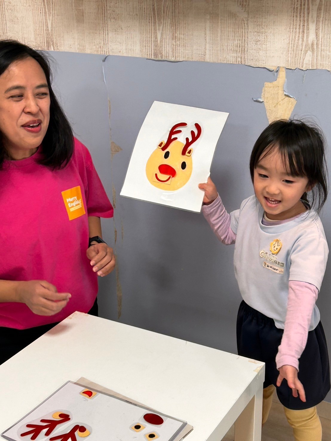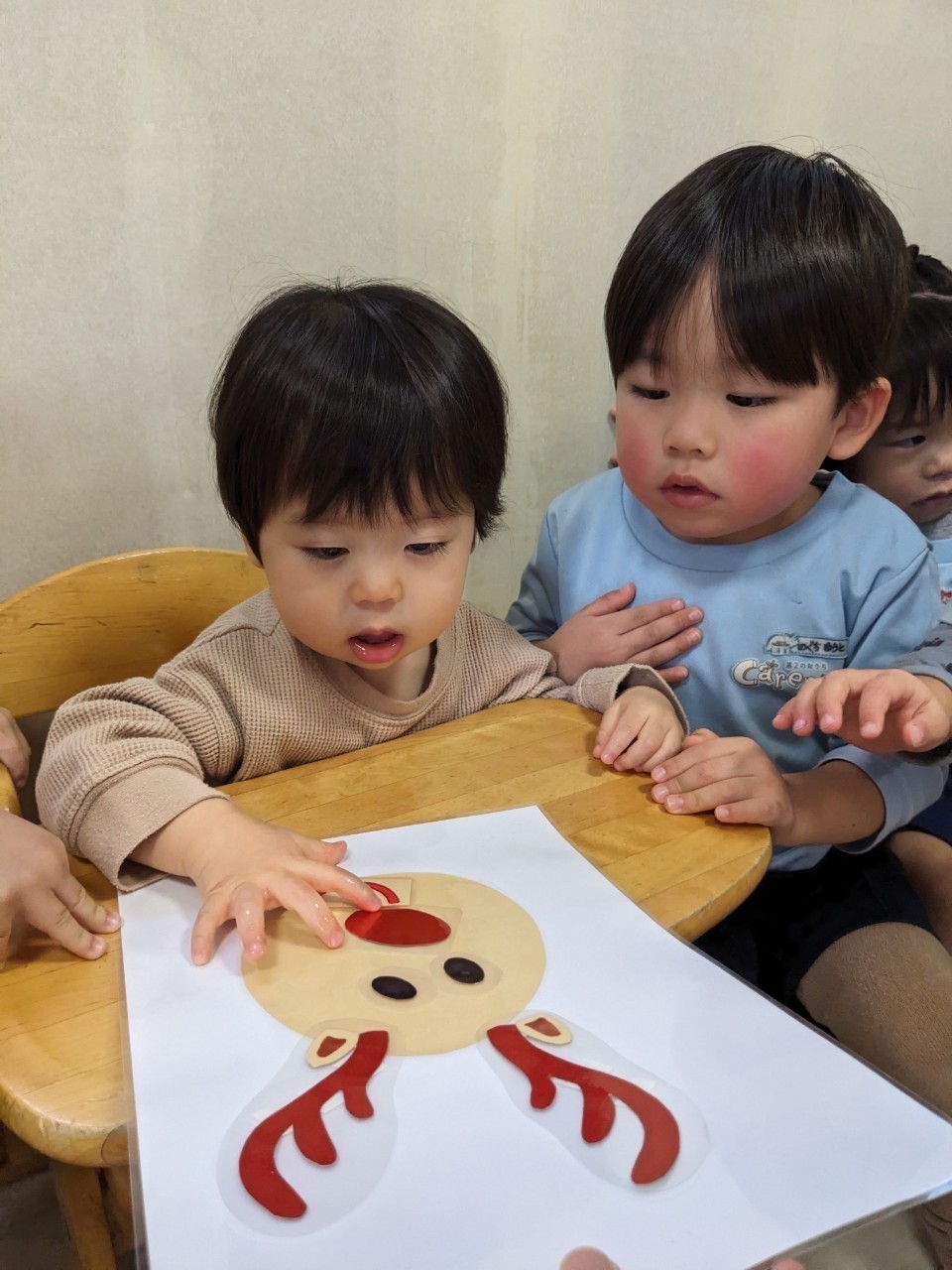 今日も大好きな絵本の読み聞かせから保育がスタート☺️お話にサンタが出てくると、発表会で会えたサンタのことや頼んでいるクリスマスプレゼントのことを口々に嬉しそうに話す可愛い子どもたちでしたよ😍❣️ 英語レッスンでもクリスマスの内容を楽しめていて、積極的に発言や発語をしたり、トナカイさん福笑いゲームをして笑顔で喜んでいました✨