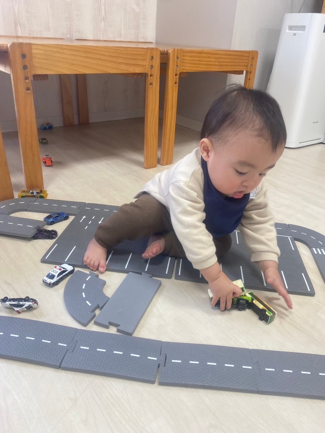 トミカと大きな道路のマットをたくさん繋げましたよ😍色とりどりの道路をつなげたり、手にたくさん持って見せに来てくれました🥰