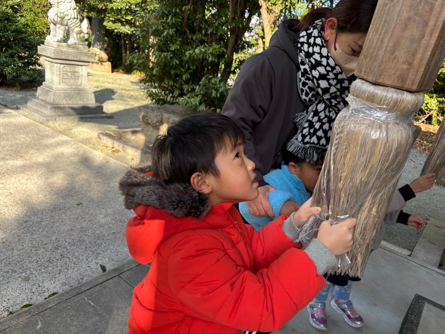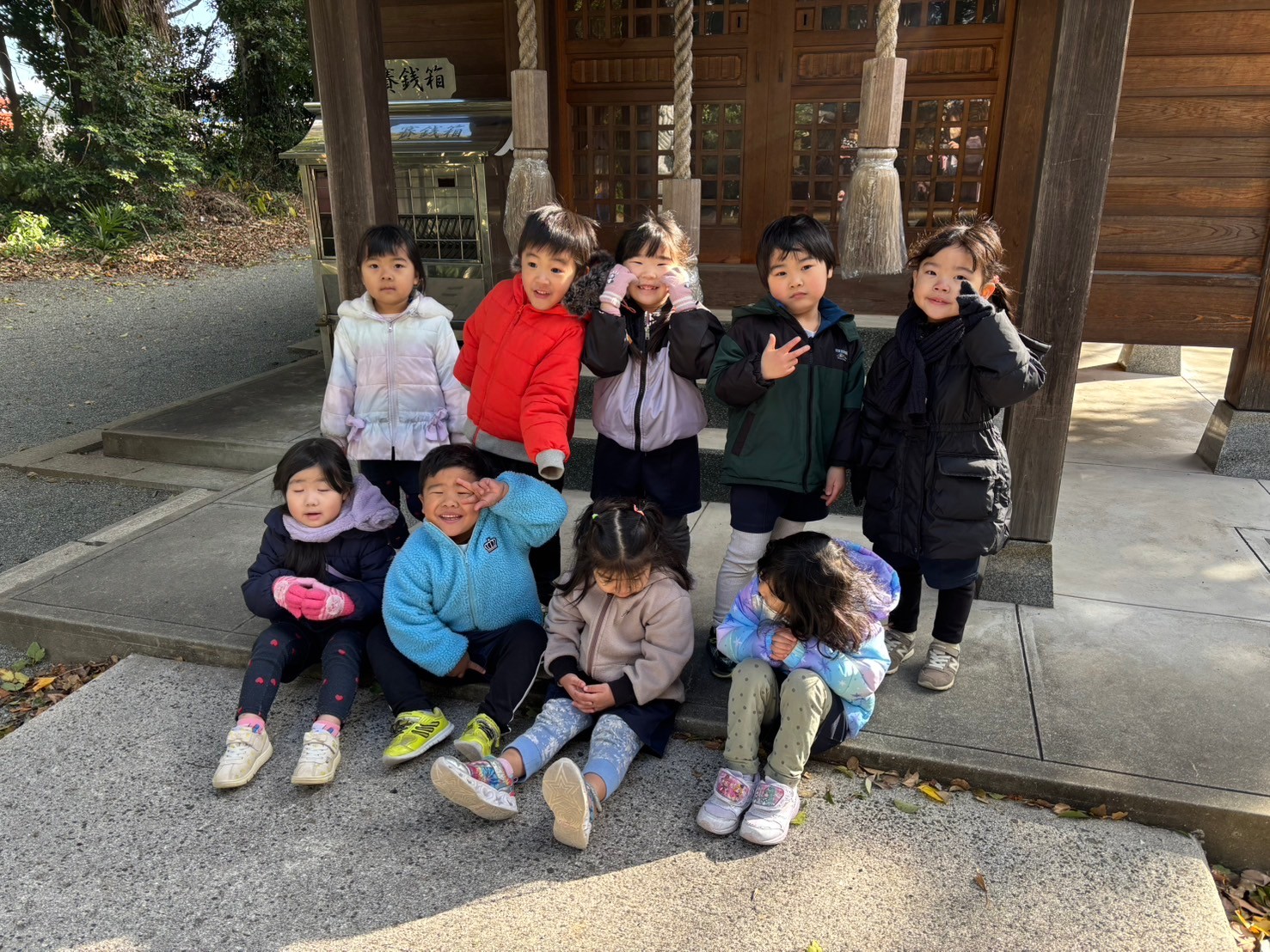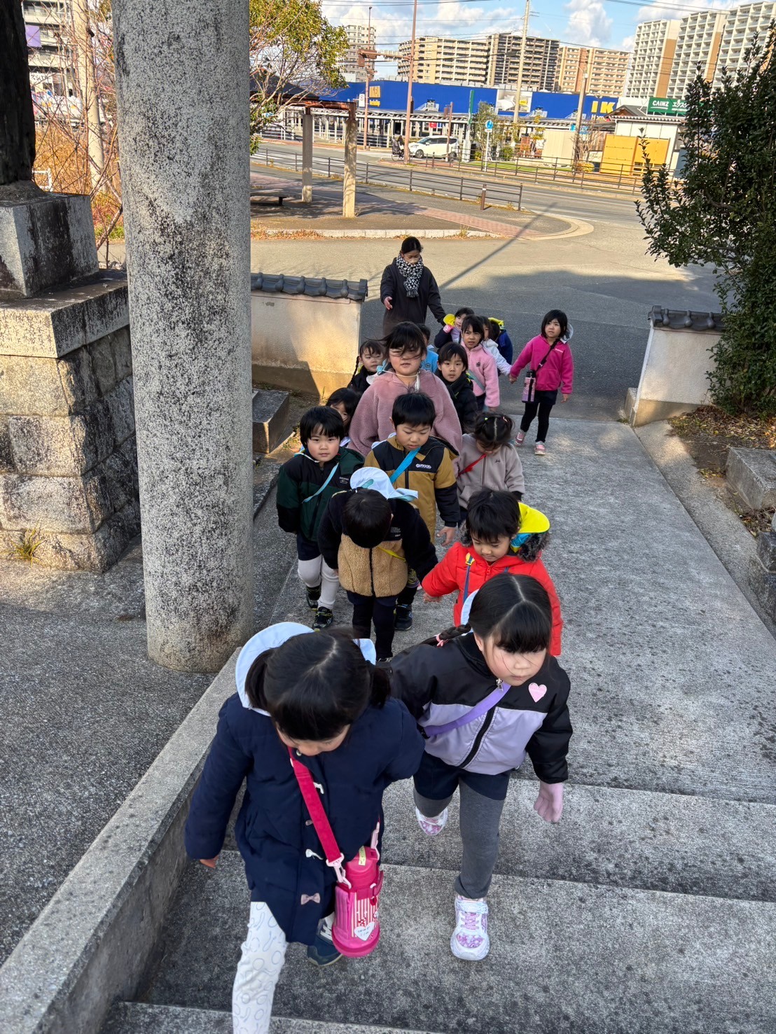 今日は楽しみにしていた初詣に行ってきました⛩️往復で2キロある道中、歳上の子は歳下の子を車道側に行かないように何度も変わってくれ、とても優しかったです🥰新宮神社では鳥居のくぐり方や、ニ礼二拍手一礼など作法を伝えながら神様にご挨拶をしました。帰り道で目に入ってくるのは沖田公園🩷行かないなんてありえない‼️思う存分に、、、とまではいきませんでしたが、増え鬼や遊具など時間の許す限り楽しみましたよ✨約1時間半の間、寒空の元で元気に過ごせたことや、事故もなく園外保育を終えられたことに感謝です😊