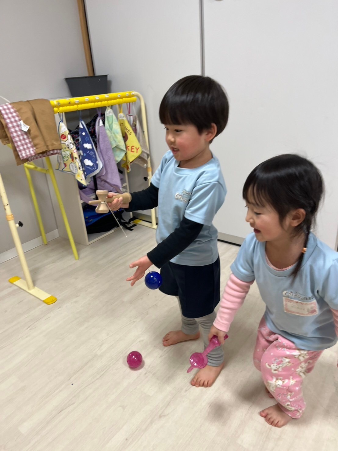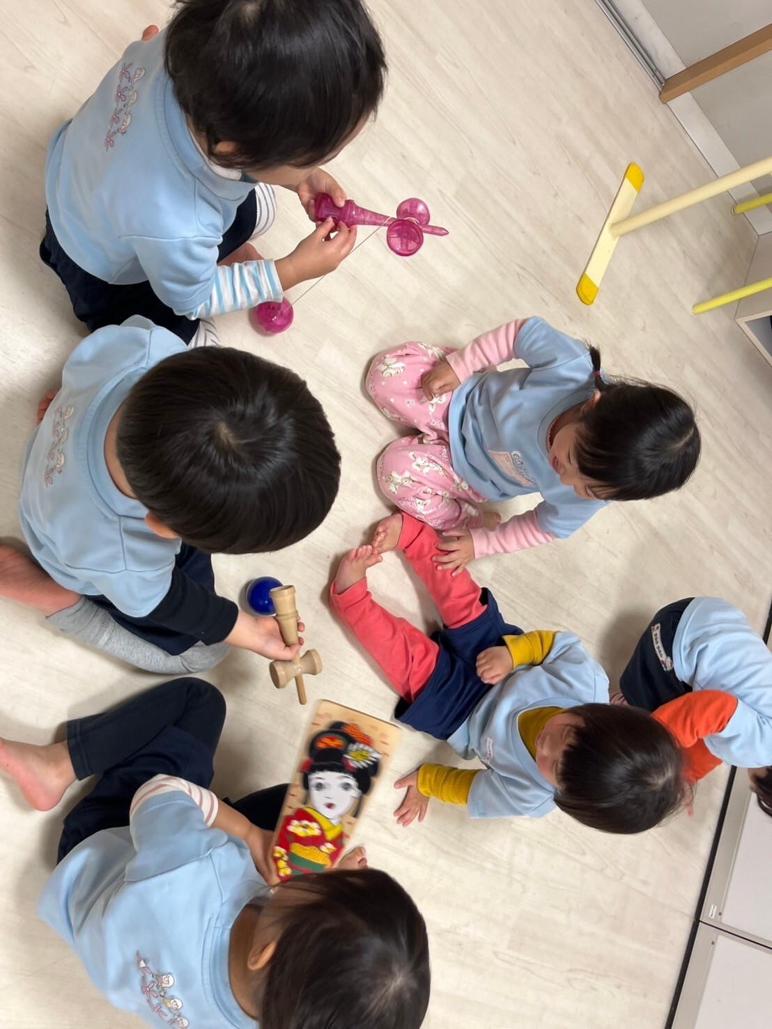 コマ、羽子板、けん玉、竹とんぼなどお正月ならではの遊びをお友達と先生と一緒にしました❣️