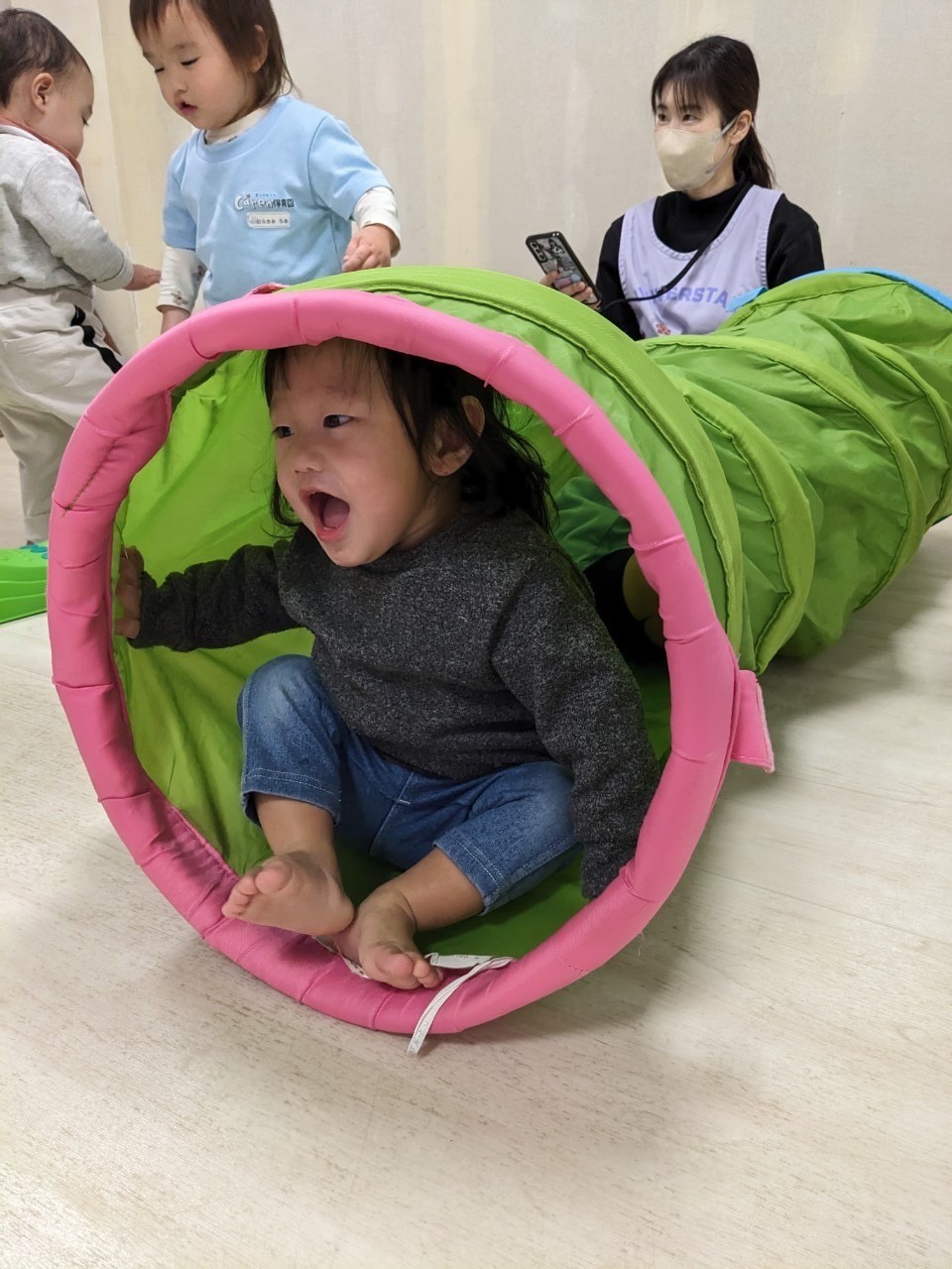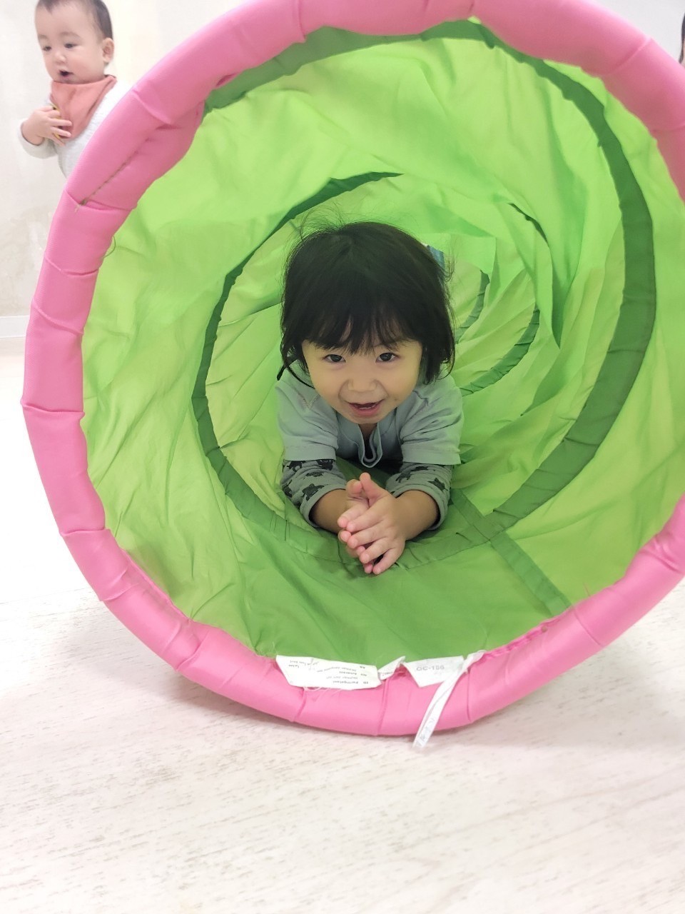 トンネルで嬉しそうに入っていき覗いて見ていた友達に会えて笑いが止まらない子ども達でした💕