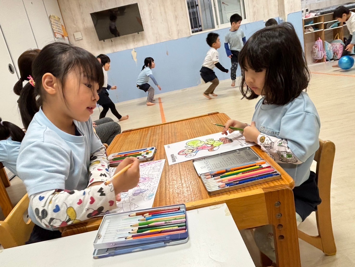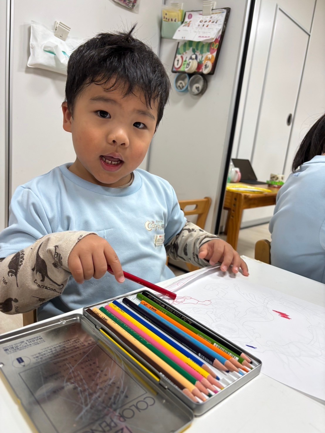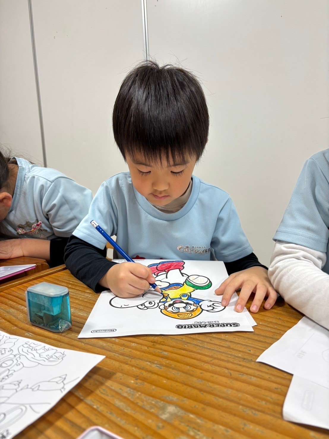 その後は、みんなでしたい遊びを相談しました😆なかなか意見がまとまらない中、きりん組さんが『どうする⁉️なんの遊びがしたいと❓』と聞いてくれて、ぬりえとカルタと爆弾ゲームに分かれて遊ぶことが決まりました💣