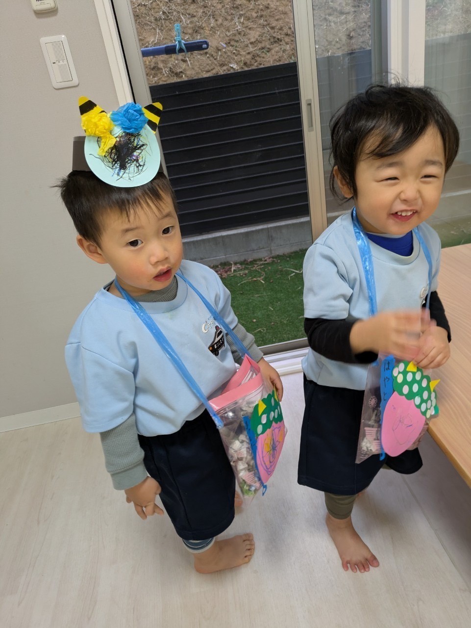 繰り返し豆まき遊びをしたいと訴えるなど、最後まで集中して笑顔で楽しめていました💖みんなのパワーに鬼役の先生がヘトヘトでしたよ笑