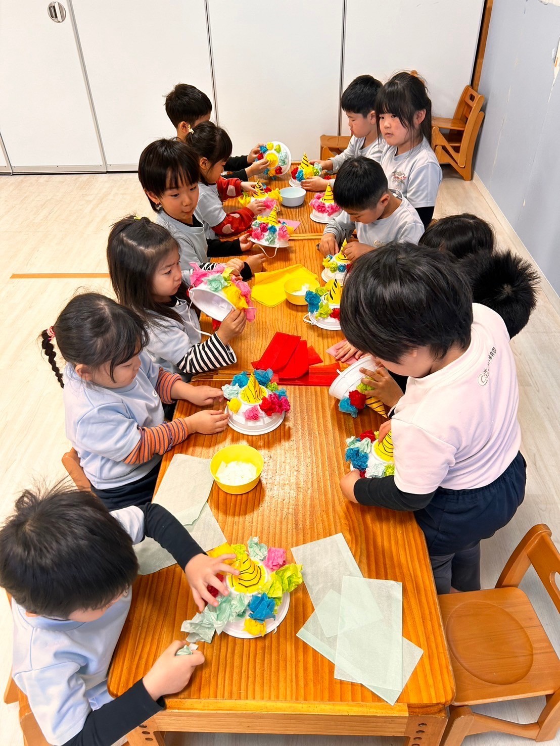 カラフルな花紙を優しく丸めて鬼の髪を作りましたよ☺️
