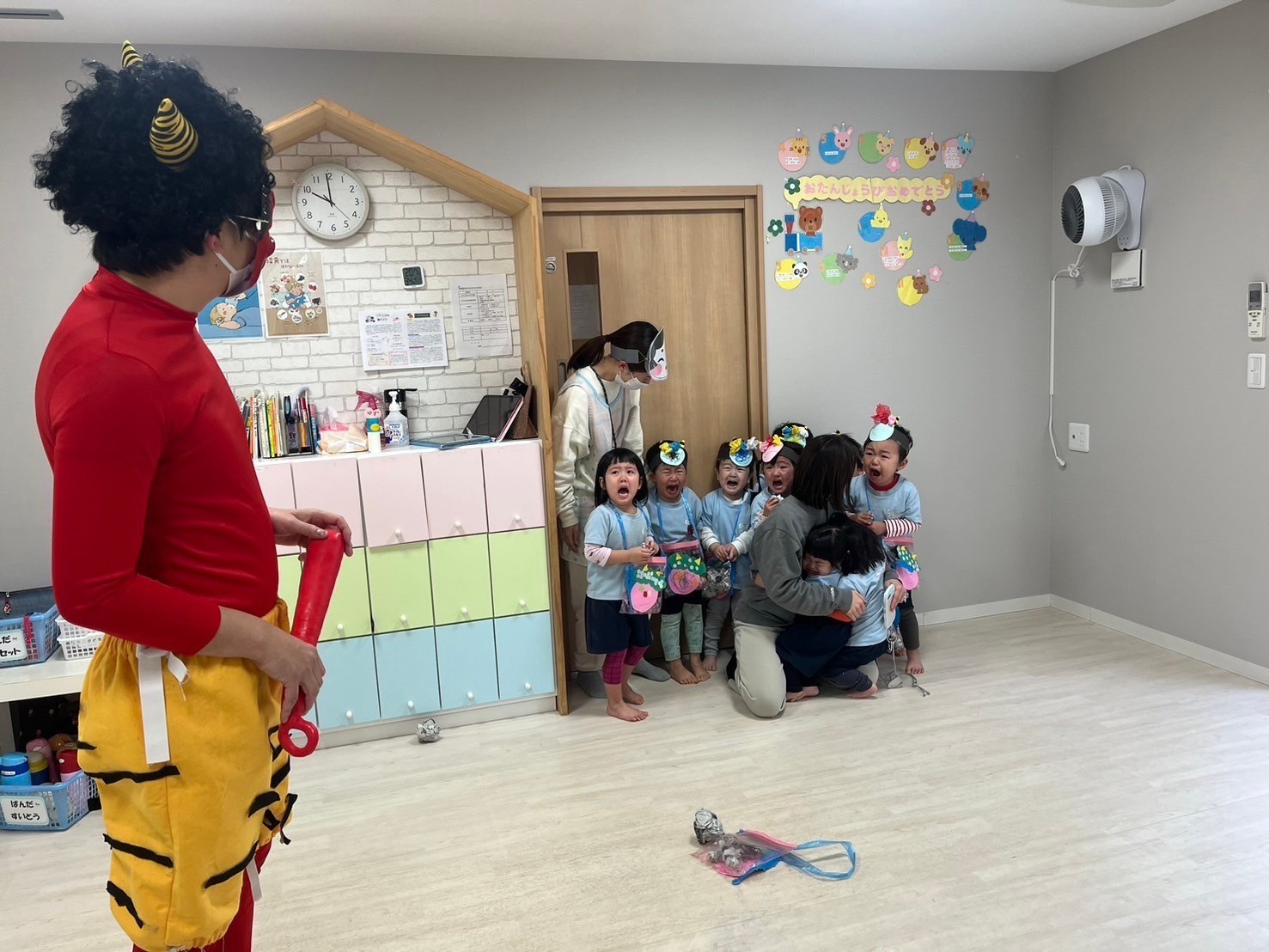 先生たちにくっつきながら豆まきタイム頑張りましたよ👹🌟最後には泣きながらもバイバイをしっかりとしていたかわいい子どもたちでした👋✨豆まき終了後は水分補給時間を作って、ゆったりと話をする時間を設けましたよ☺️