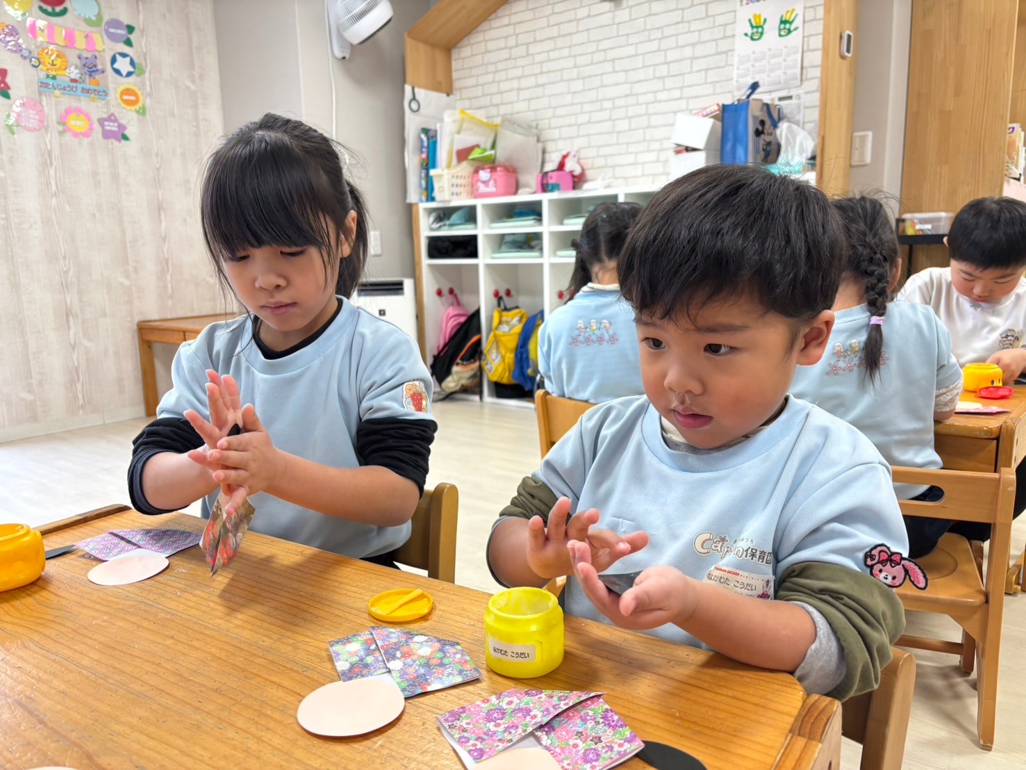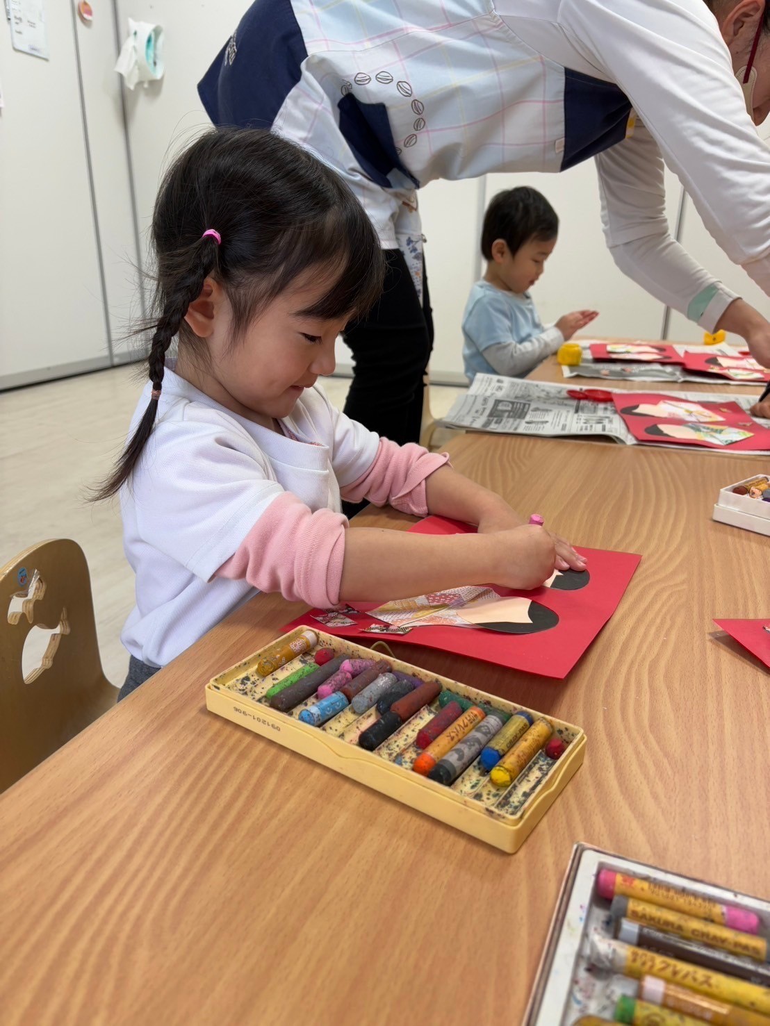 りす組さんもトントントン🎵とリズムよく糊付けできていて、目も色を選んで意欲的に描けていました😊🖍️
