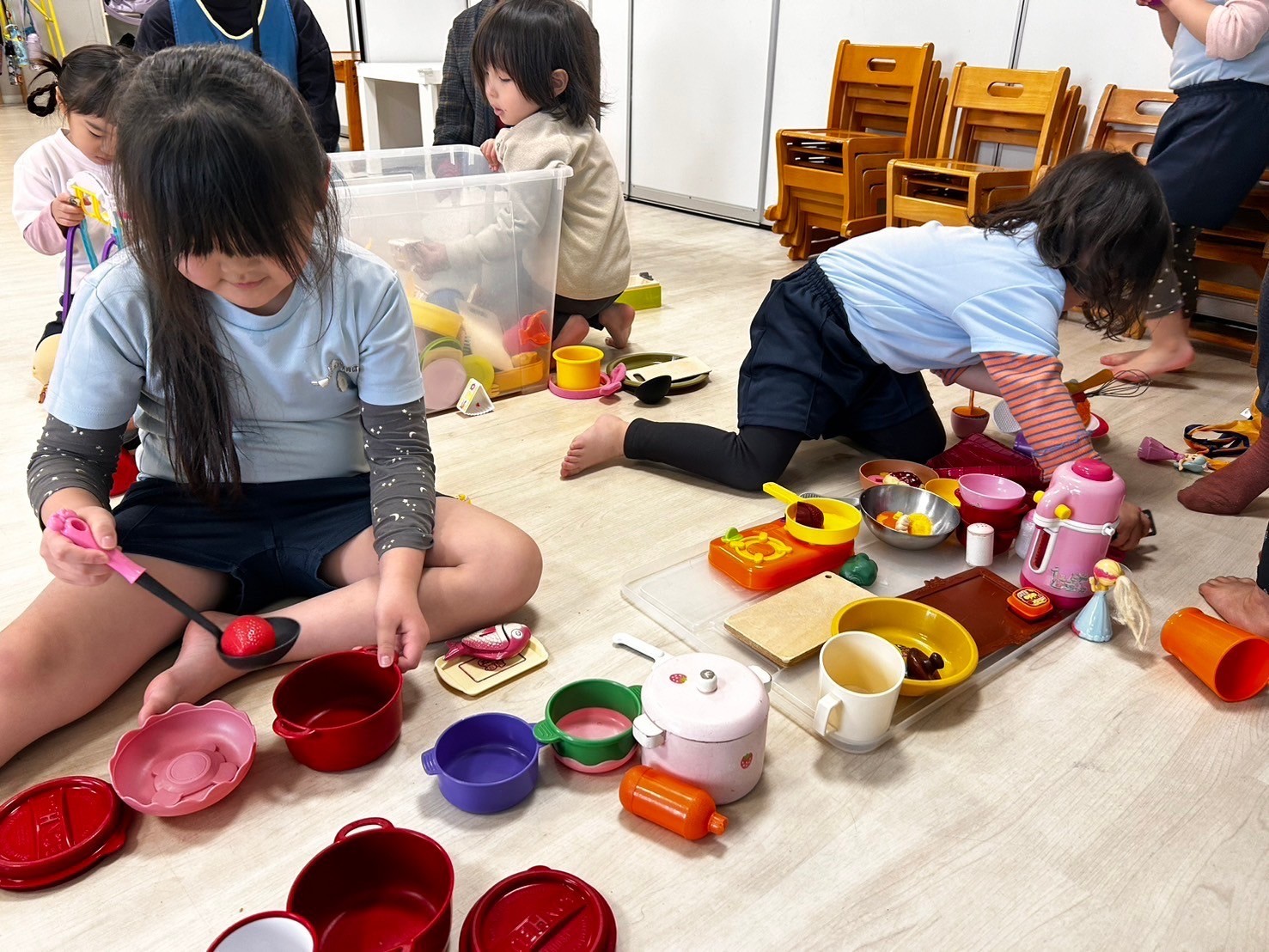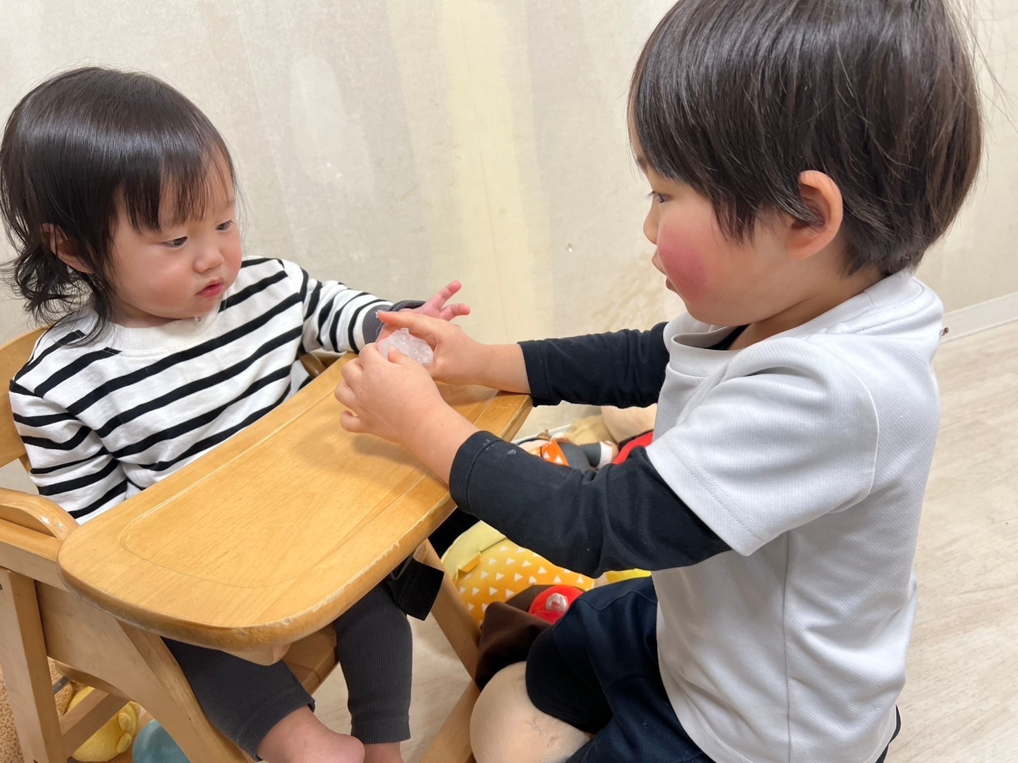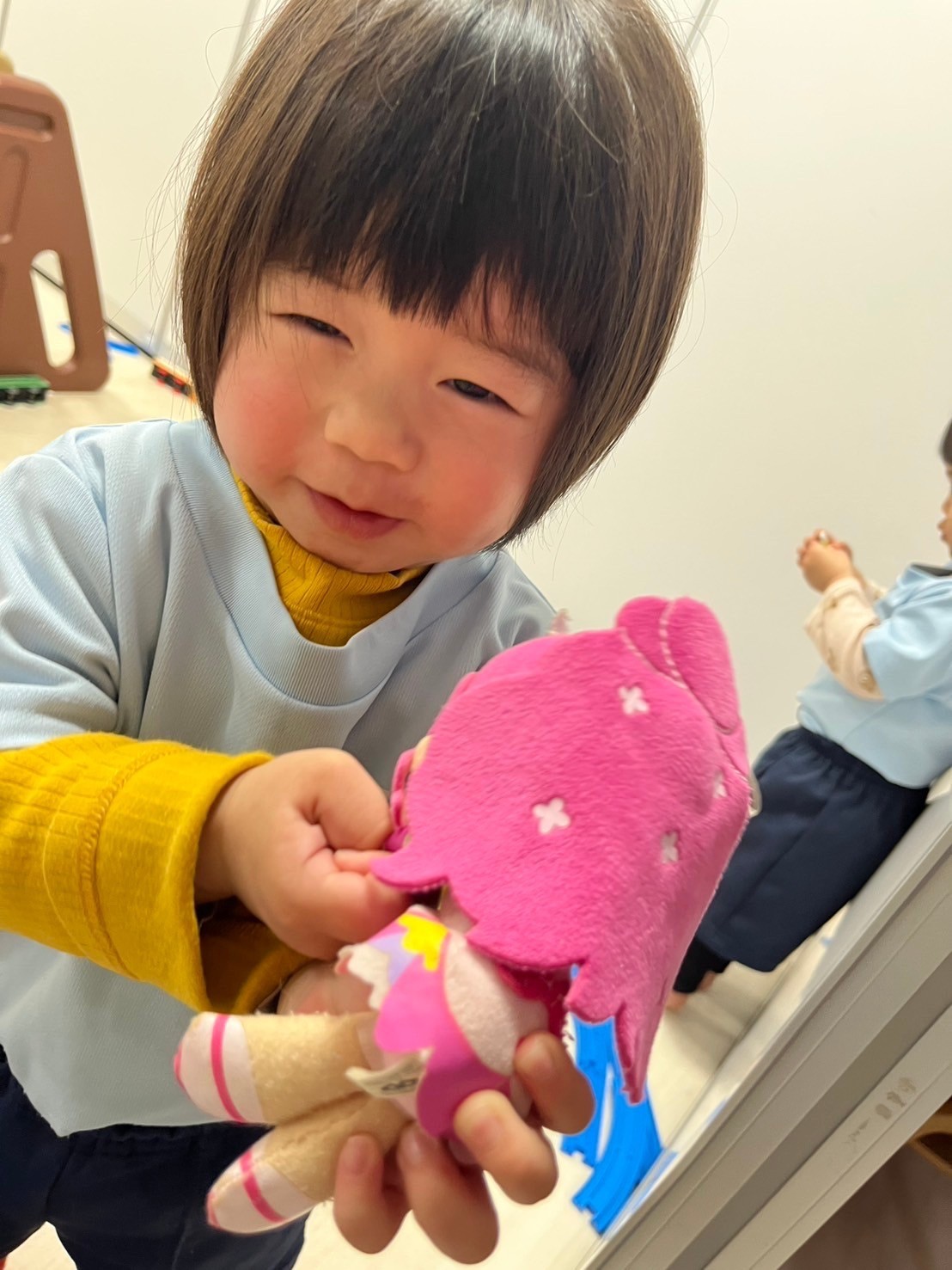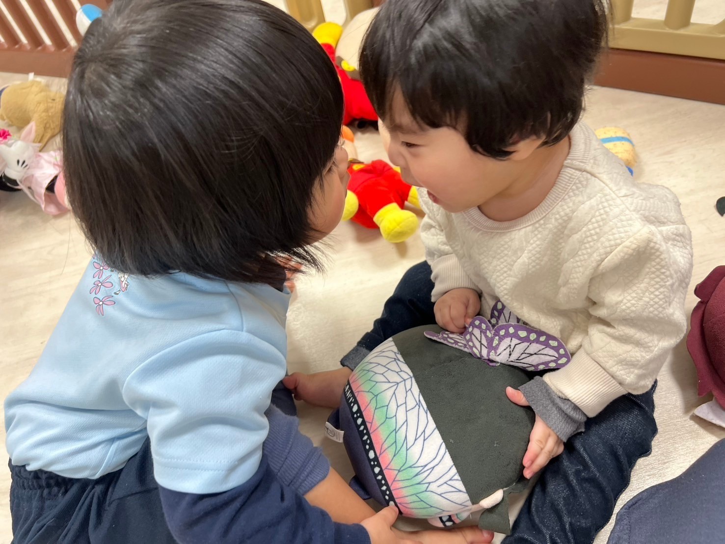 絵本の先生の読み聞かせの後は小さい組さんみんなで大好きなプラレールとぬいぐるみ遊びを楽しみました☺️異年齢児同士の関わりを通して思いやりや譲り合いの心の成長も促していけたらと思っています💗