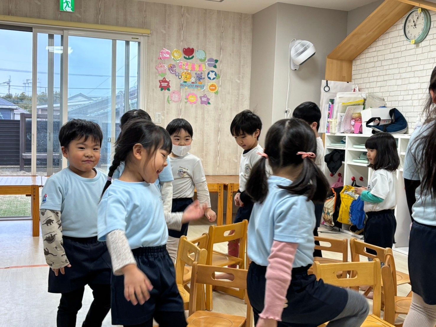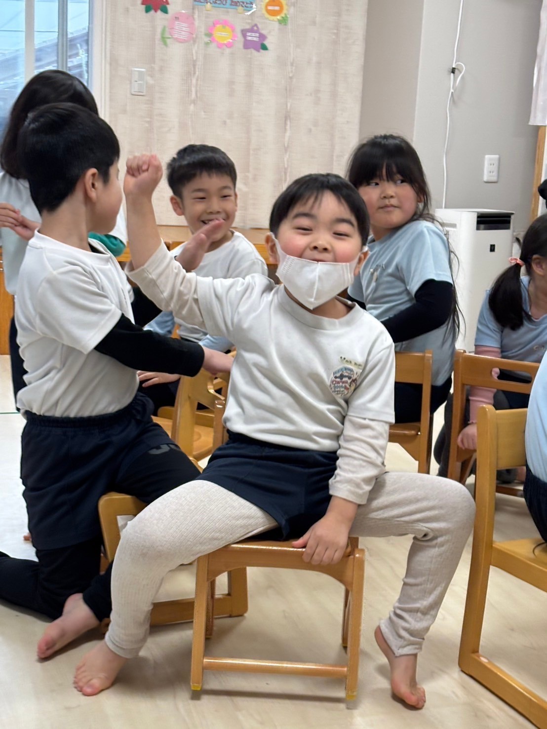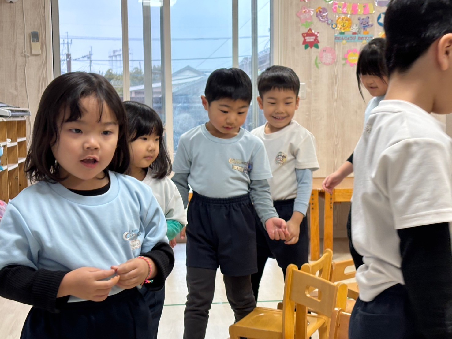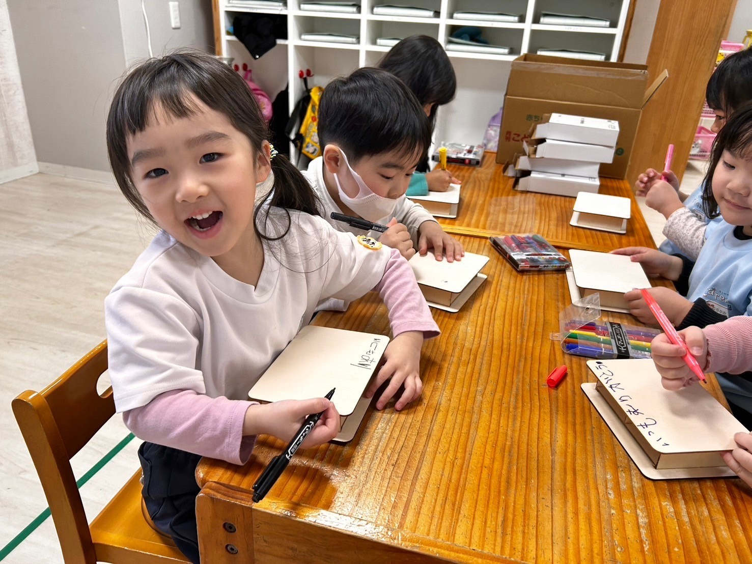 今日は絵本の読み聞かせの後、きりんぐみさんがお買い物でいない間にきりんぐみさんに卒園式で渡すプレゼント作りをしました❗️今までたくさん遊んでくれたり、お世話をしてくれたきりんぐみさんに向けて在園児を代表してプレゼント製作をします😌そのことを伝えると嬉しそうな淋しそうななんとも言えない表情になっていました✨いざ製作が始まると楽しみながら、文字を書いたり絵を描いたり、夢中になっていました💕きりんさんに喜んでもらえるといいね🥰最後には椅子取りゲームもしましたよ❗️