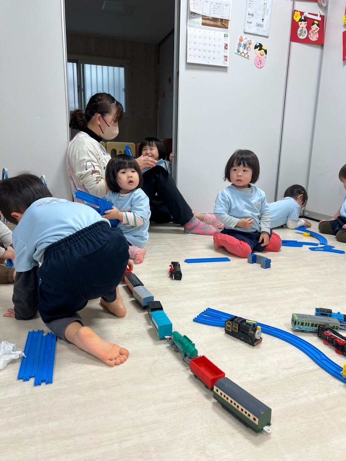 今日は絵本お読み聞かせの後、未満児さんと一緒に過ごしました☺️プラレールで車両や線路を繋げて遊びましたよ❗️小さいことの関わり方も上手になり、おもちゃを貸してあげる姿も見られました💕咳・鼻水の子が増えています💦寒さも続いているので、今後も気を引き締めて気をつけていきたいです😌☘️