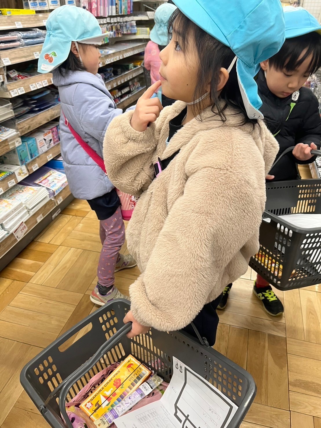 今日は、待ちに待ったお買い物体験に行ってきました🛍️カインズまでの道のりは、小学生になった時のためにと交通ルールを確認しながら歩きました🚶‍♀️きりん組さんだけだと、15分程でカインズに到着‼️早いものです😅お店の中では、大きな声は出さないや、走り回らないなど約束をしようかと思いましたが、そのようなことを言わなくても、きちんとした振る舞いができて、本当おりこうさんでした✨✨買い物リストを手にクレパスやのり、鉛筆など必要なものをカゴの中に入れ、一人ひとり千円札を握りしめて買い物をしました🛒帰りに副店長さんにお礼を言って帰りました😊雲行きが怪しかったので、沖田中央公園では遊べないからまた今度来ようねと伝えていたせいか「遊びたいな〜😒」の一言もないきりん組…🦒そんな姿を見て、滑り台一回で終わるならと提案すると「うん❗️わかったー‼️」と荷物を置いて滑り台🛝にダッシュ💨本当に一回滑ったらすぐ荷物を持って帰る準備をしていました😂
