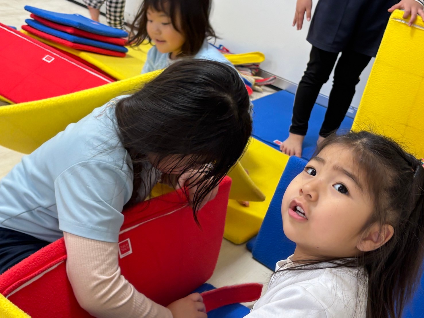 運動遊びもしました‼️トンネルをくぐったり、マットからジャンプしたりといっぱい体を動かして遊びましたよ😁