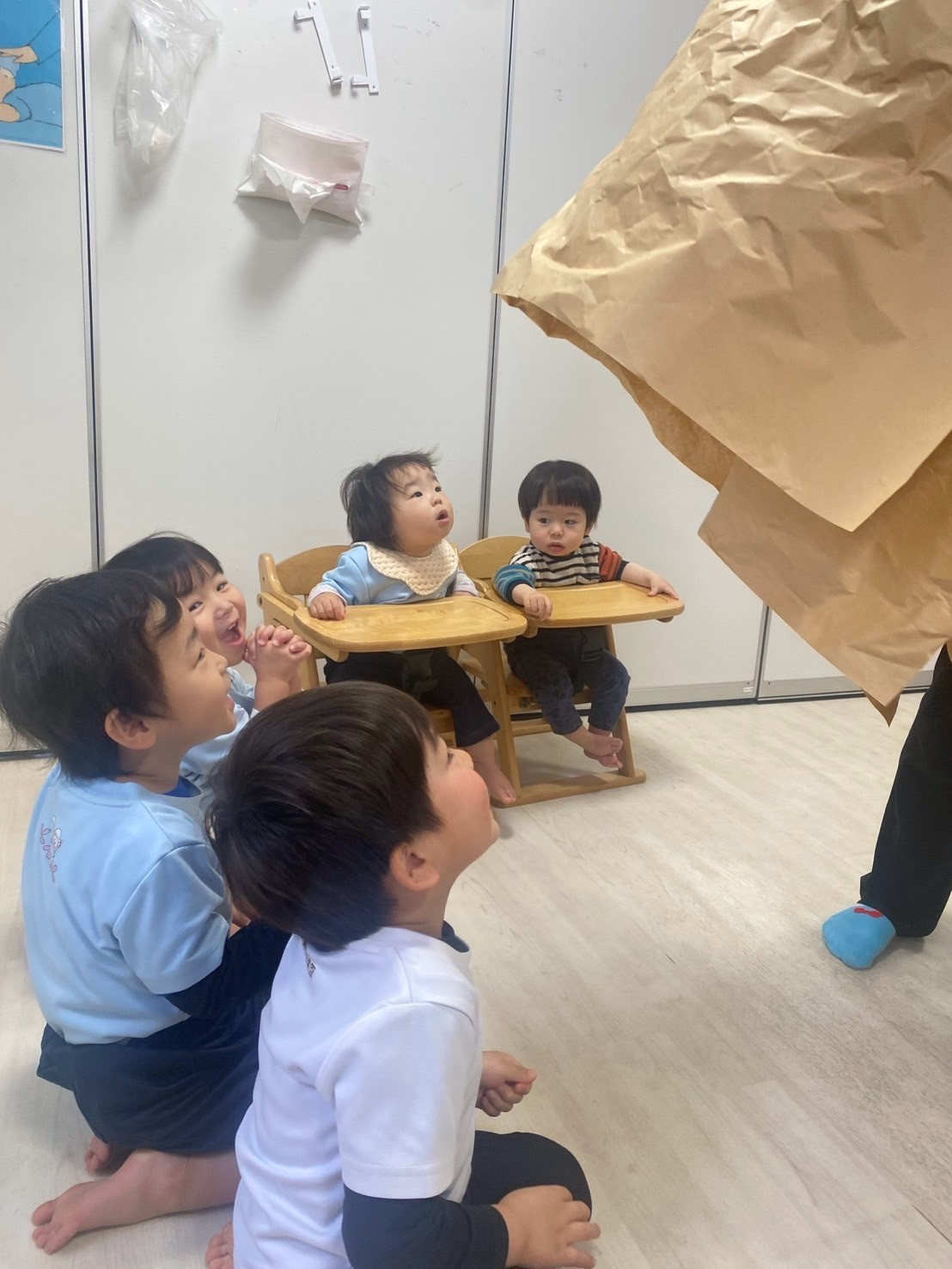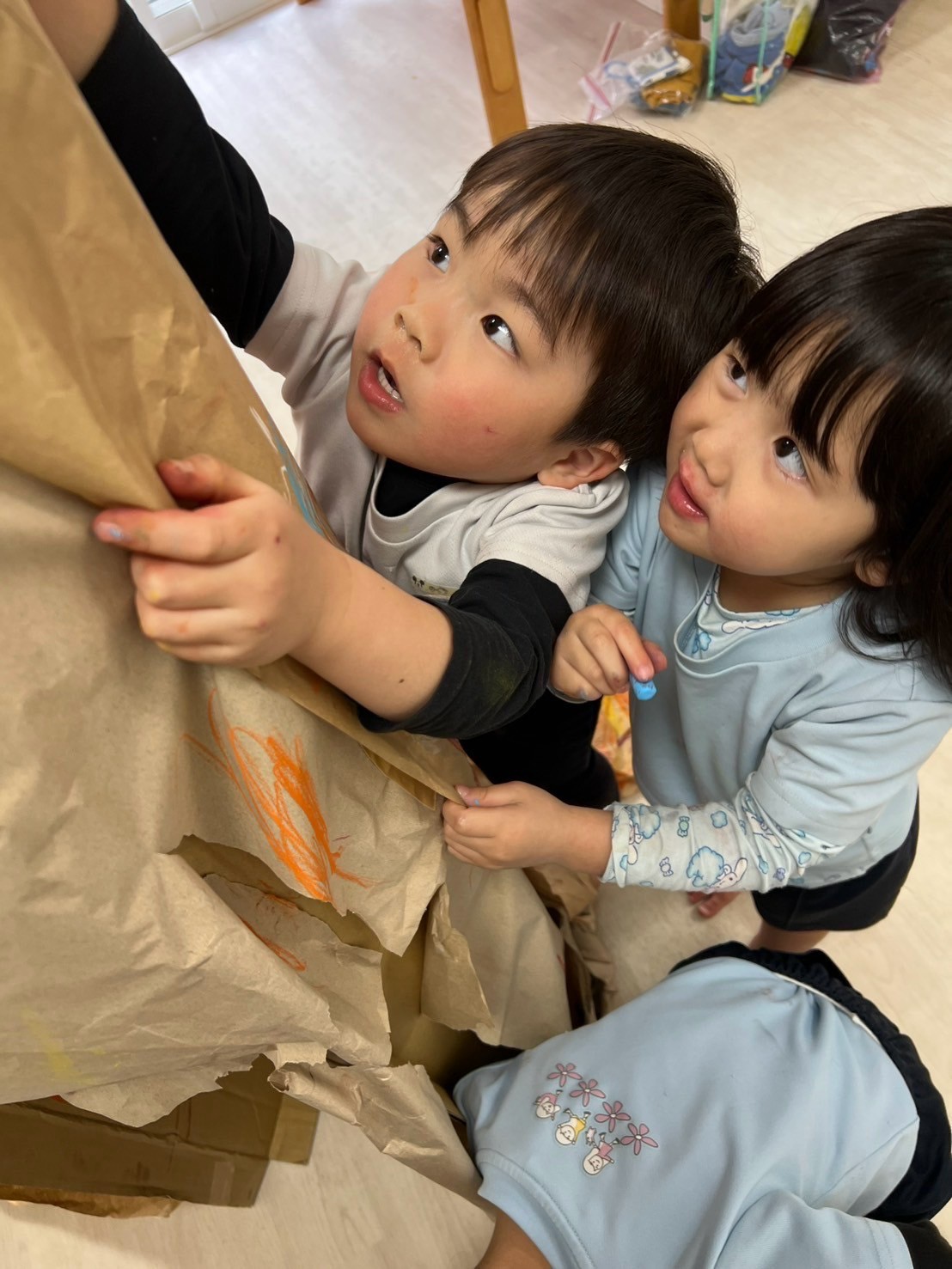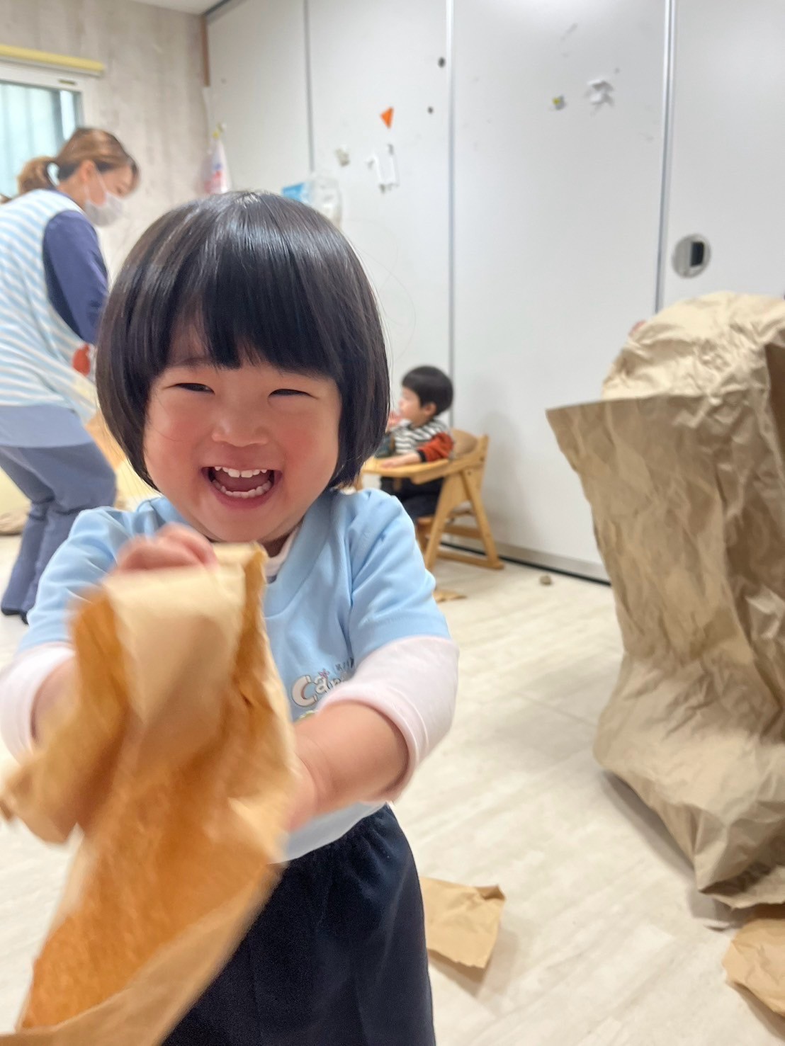ちぎったり、丸めたりと手先をよく使いながら遊べていて、節分の豆まき遊びにも繋げて遊ぶ姿も見られました👹