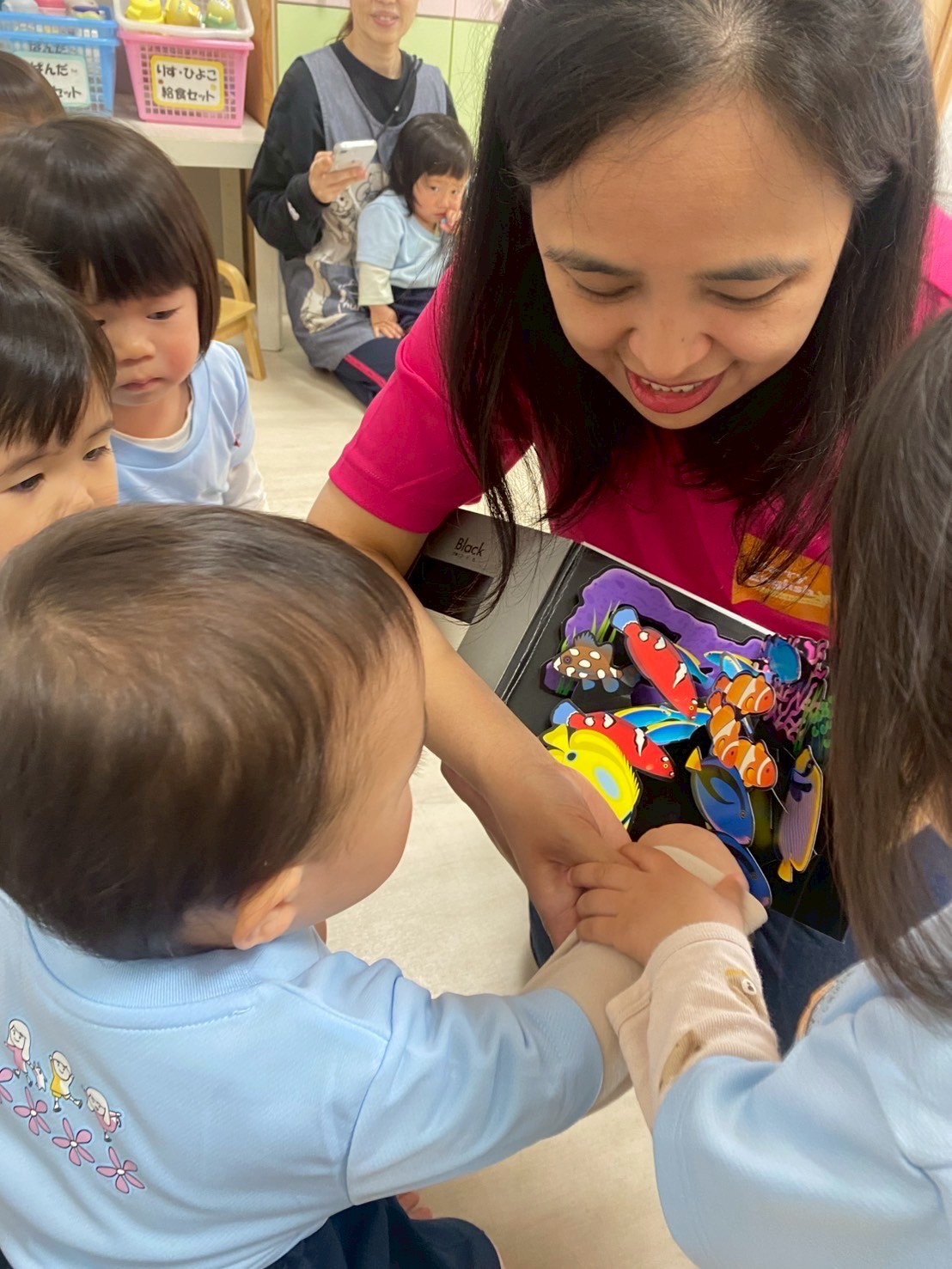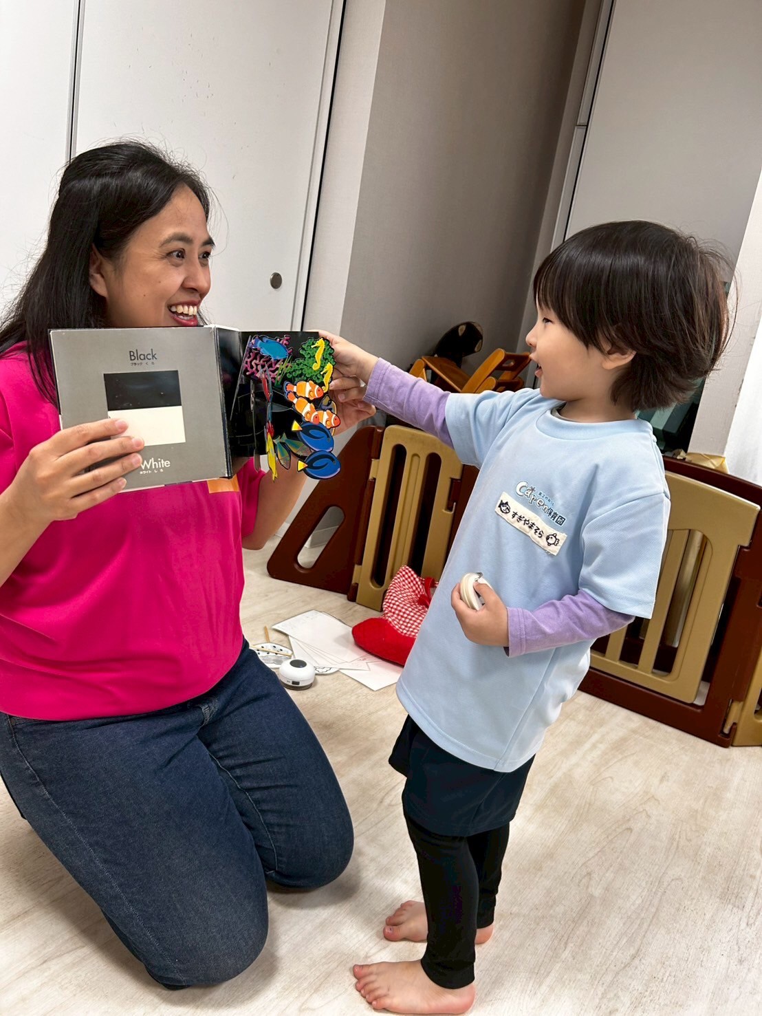 チャリナ先生と初対面の子もいましたが、元気に挨拶しレッスンがスタートしました🎶💕今日は色の絵本を読んでもらい、動物の名前や色の名前を覚えましたよ😆