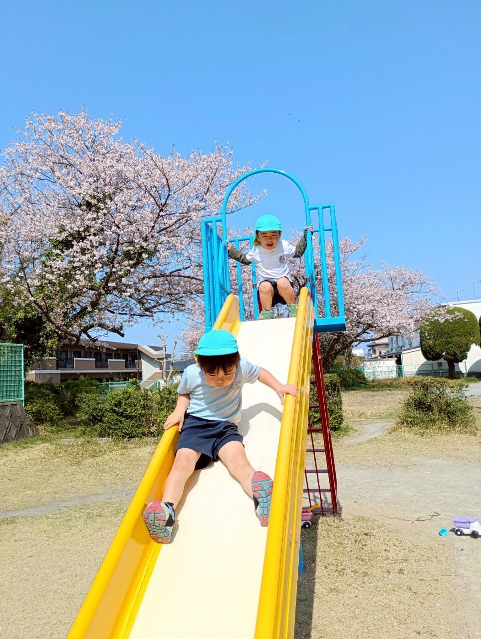 先生と一緒に滑り台を滑ったりブランコを思い切り漕いだりして十分に身体を動かしました✨✨