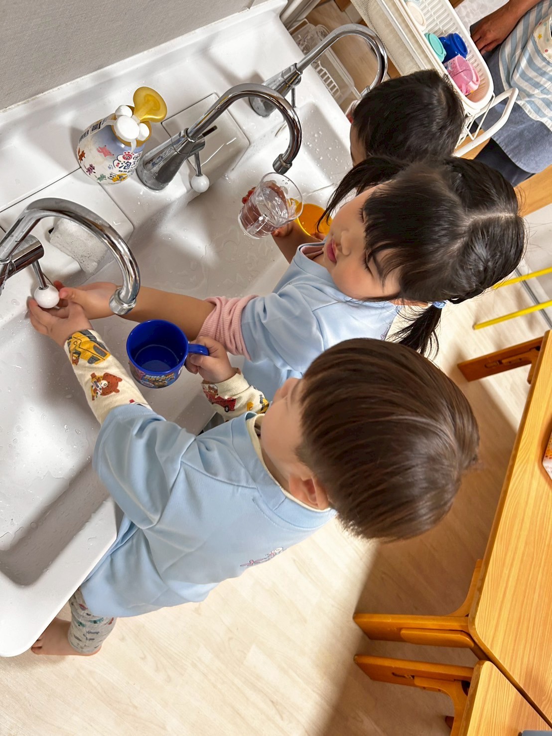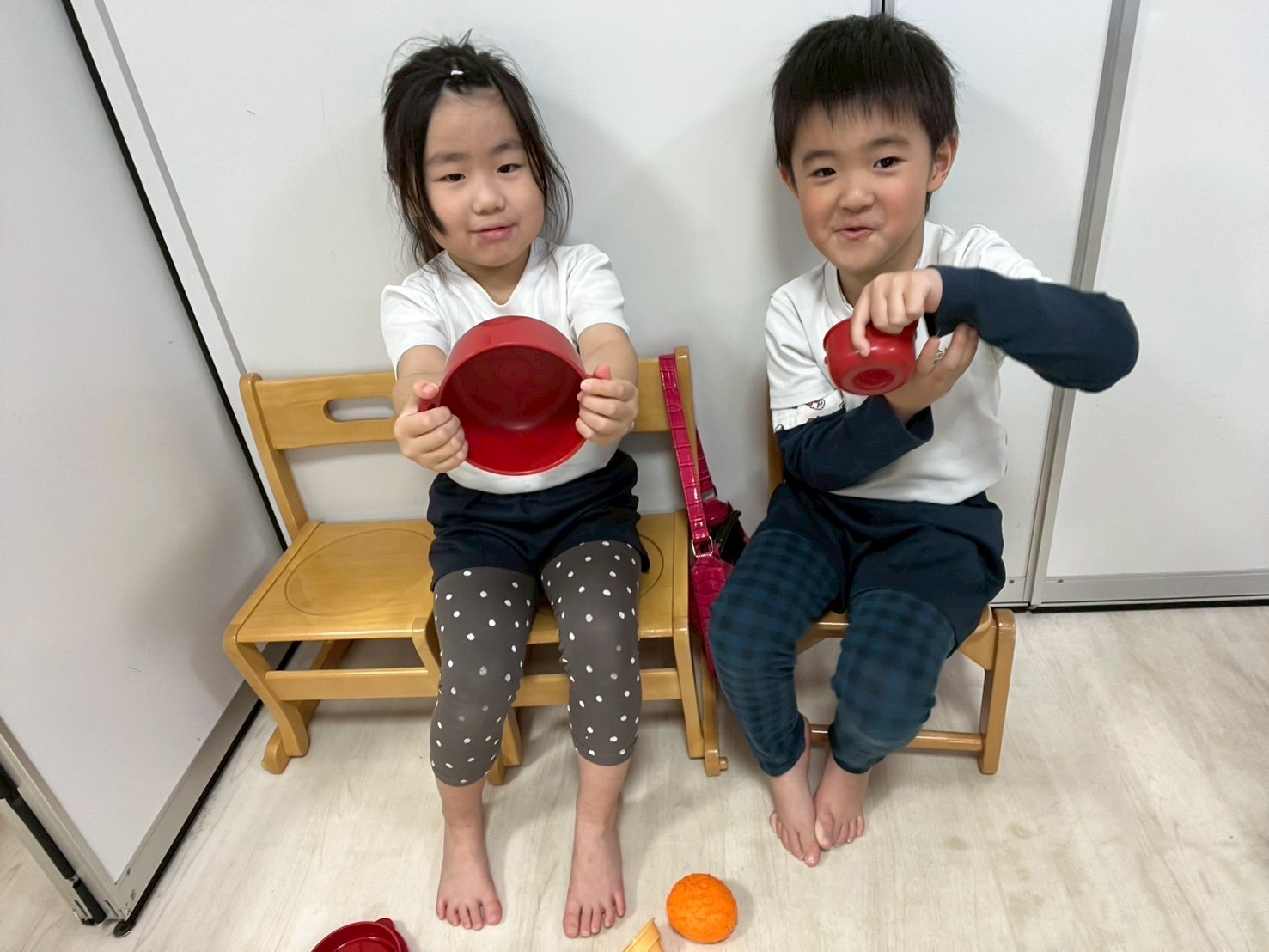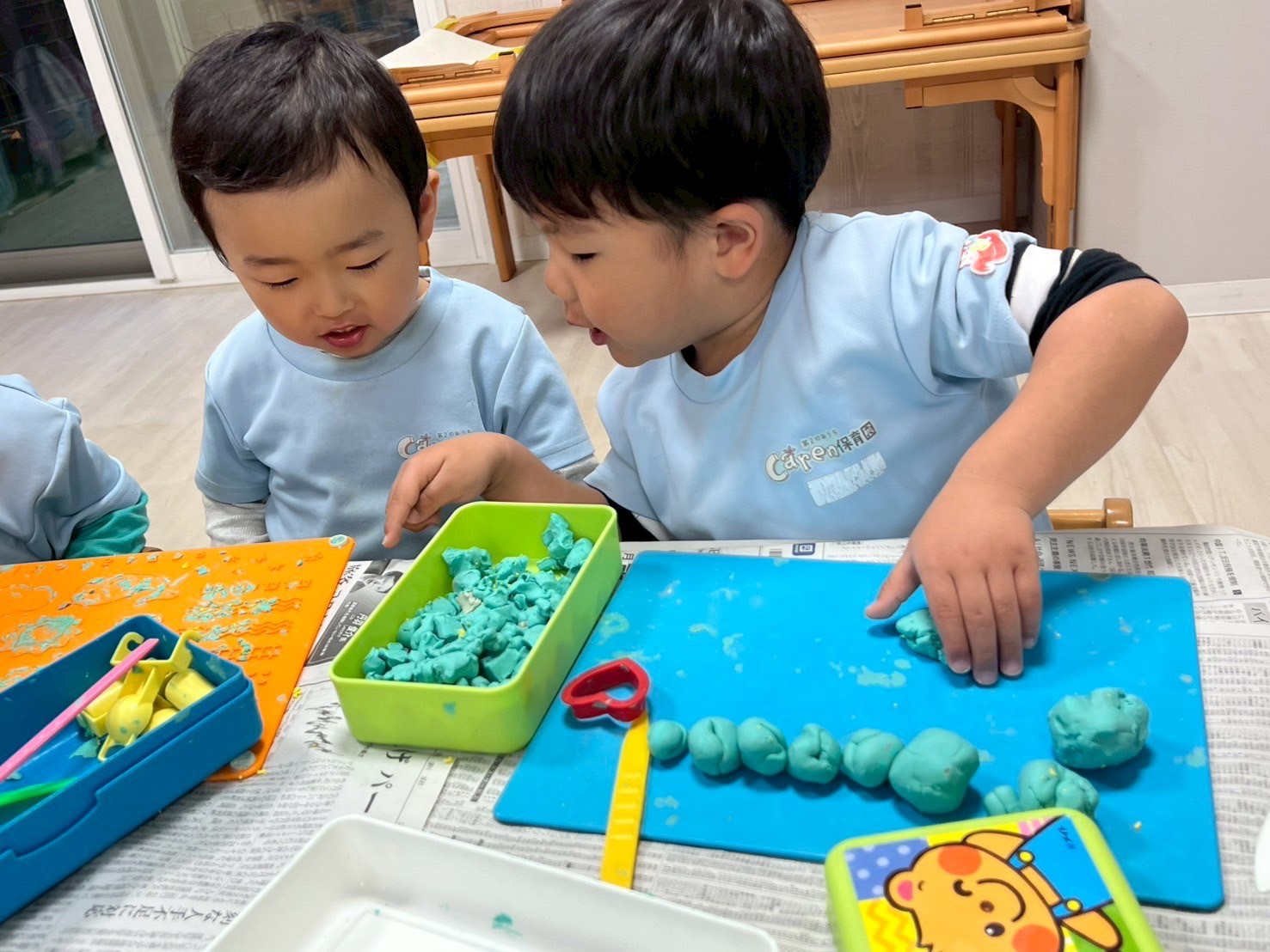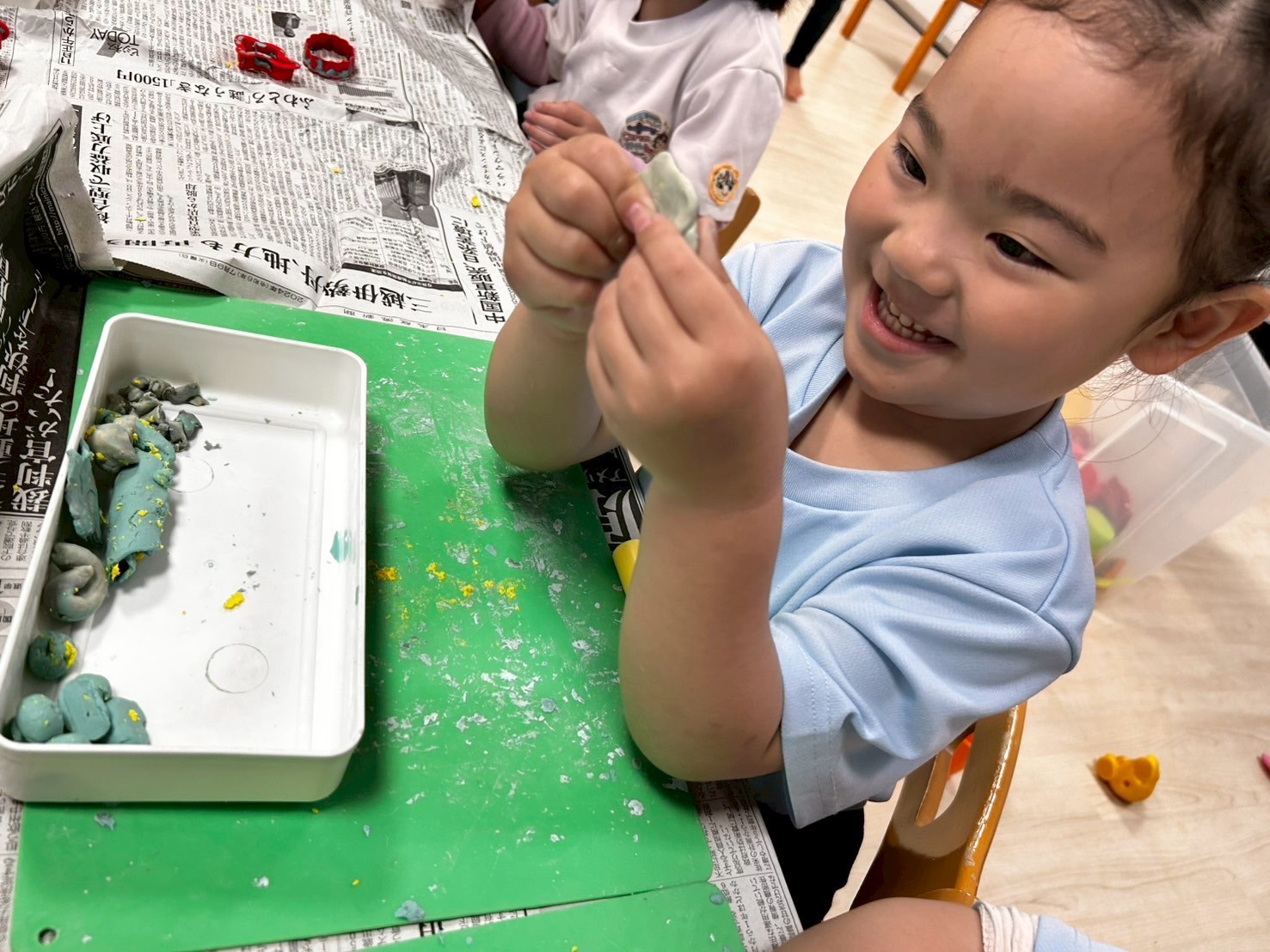 今日は週明けで不安定になる子もいたのですが、朝の歌から季節の歌と徐々に元気を取り戻し、お部屋で遊びました❣️大人気の粘土コーナー、ままごとみんなで好きな遊びに没頭しましたよ☺️