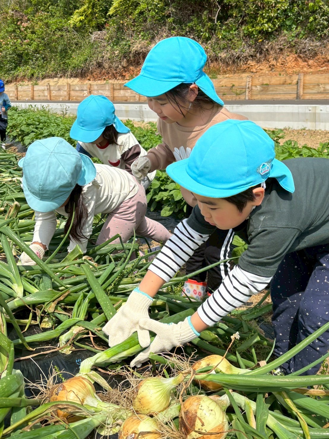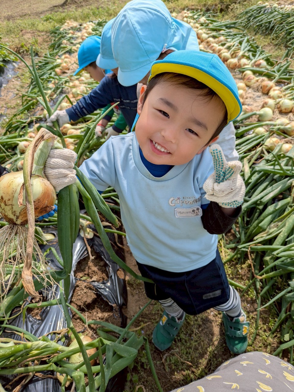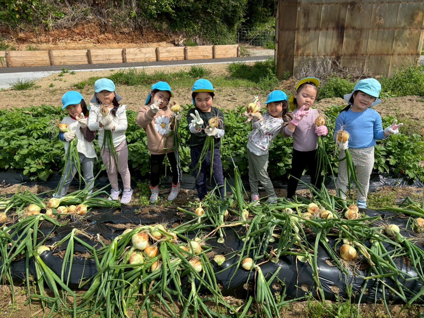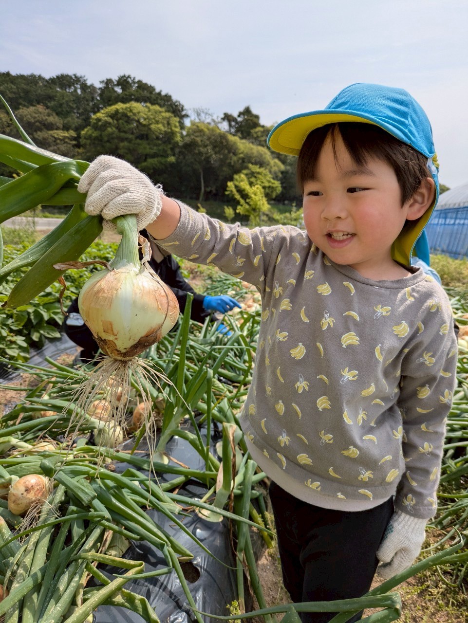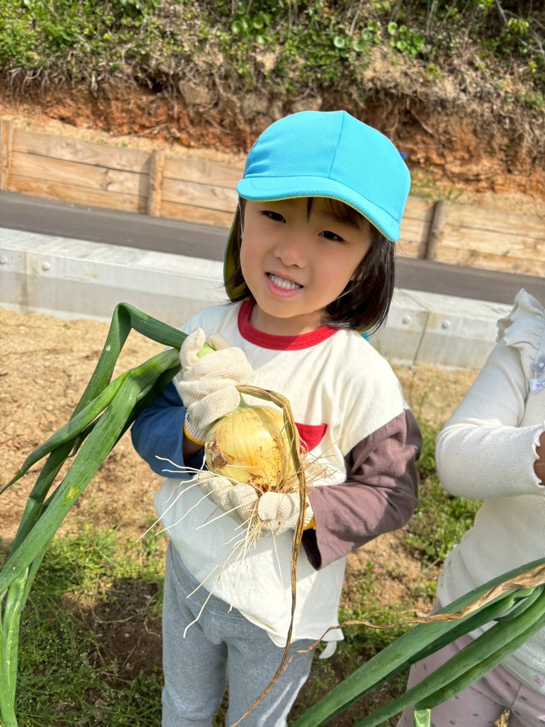 今日は以上児さんみんなで、新宮町にある玉ねぎ畑に行きました🚌バスの中では玉ねぎクイズに大盛り上がり😂「玉ねぎは木にできるでしょうか?土にできるでしょうか?」「土の中に一個できるでしょうか?たくさんできるでしょうか?」などなど初めての玉ねぎ収穫に興味津々でした🧅到着すると、畑を管理されているおじさま方に挨拶をして、いよいよ収穫です🌟両手でしっかり握って、よいしょっと尻もちをつきながらも、未満児さんの分もたくさん掘るぞ〜と意気込んで沢山収穫しましたよ💓今回は貴重な体験をさせてもらい、本当によかったです😊