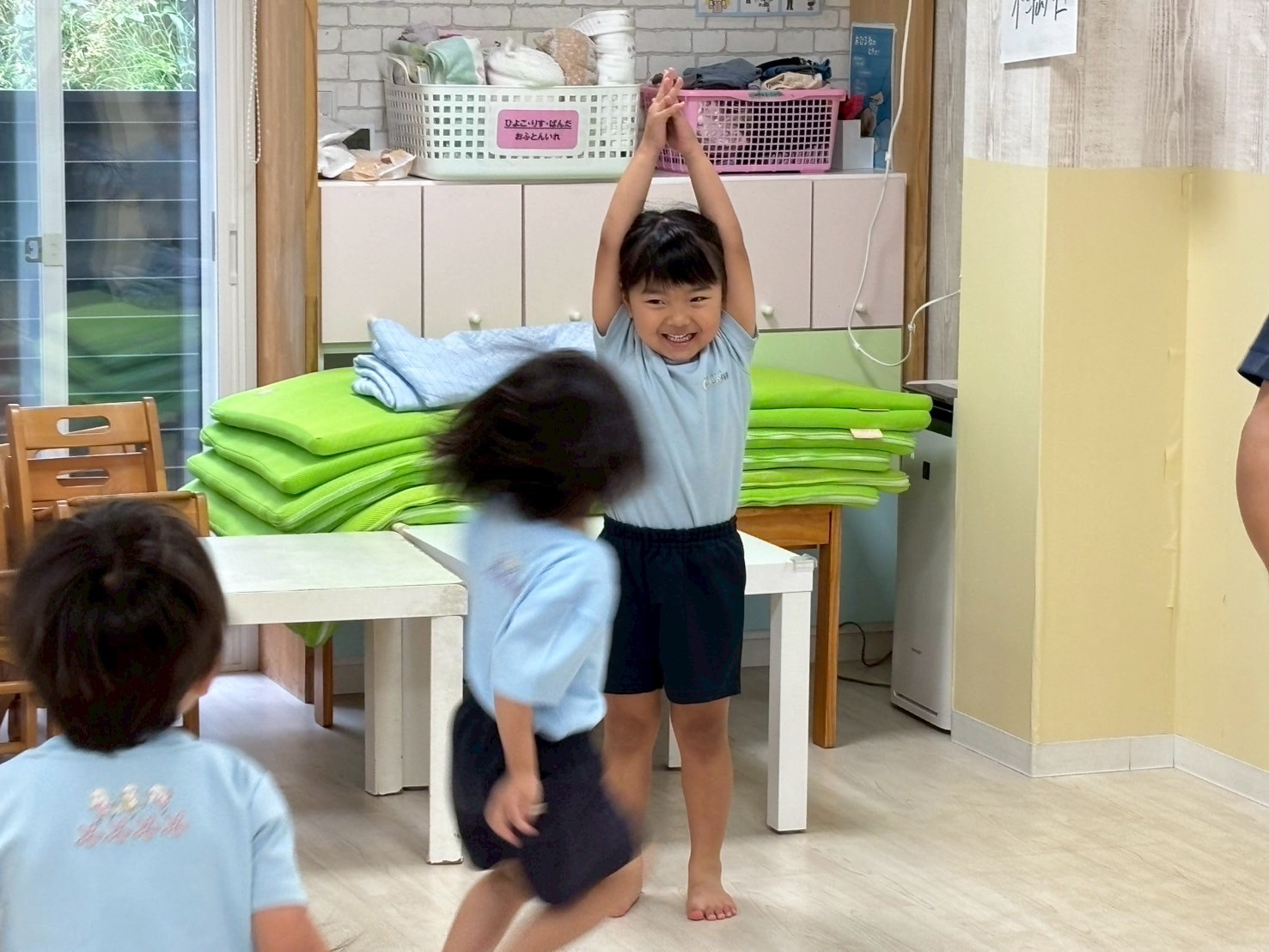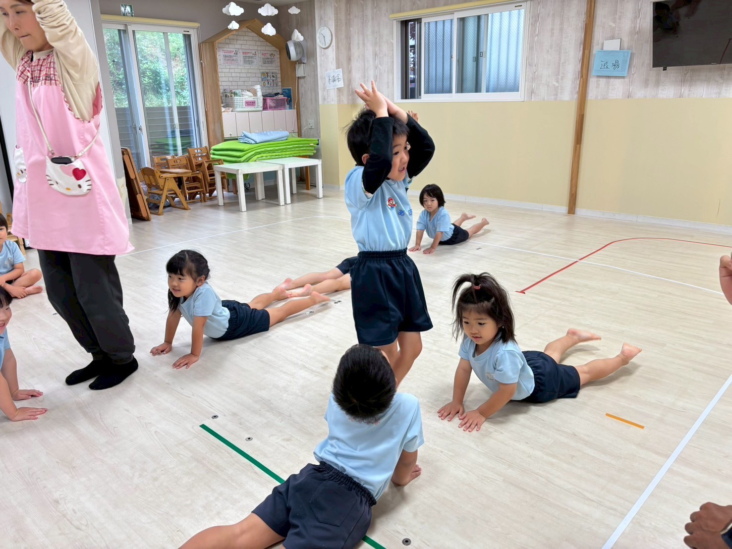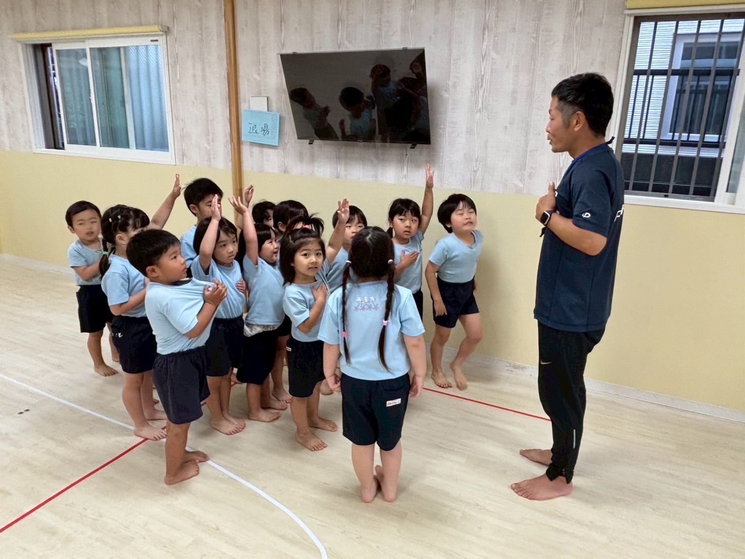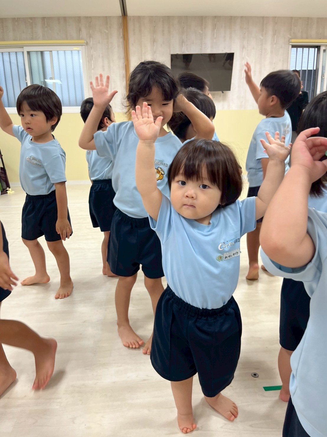 今日は運動会の練習を部屋を広くして行いました❣️開会式・閉会式、ソーラン節に体操とみんな本当によく頑張っていました🤗感覚も掴めてきていると思うので、細かい部分も調整しながら本番に向けて更に気合を入れていきたいと思います🌟頑張った後はそのまま広いお部屋でてる先生と鬼ごっこをしましたよ🏃💖運動会の練習頑張ってるんだってね!と言っていただくと子どもたちも励みになると思いますので応援よろしくお願いします🤗💕