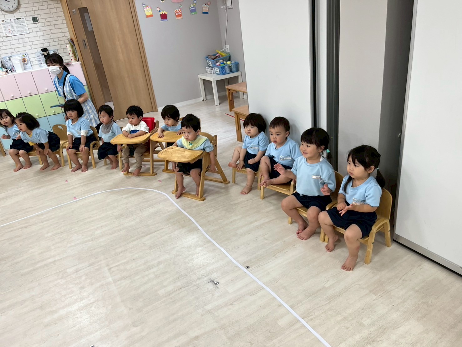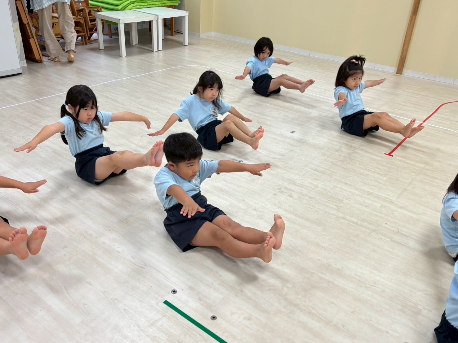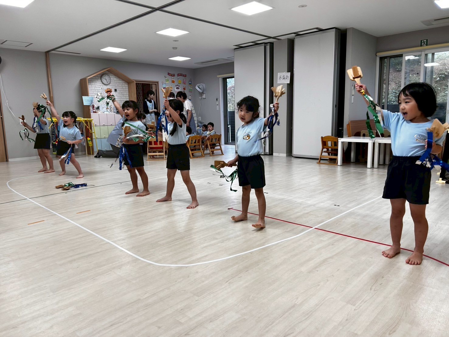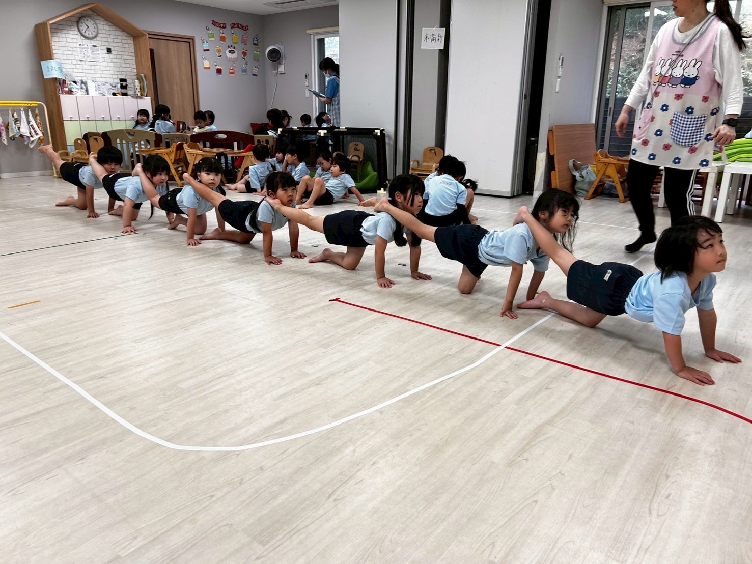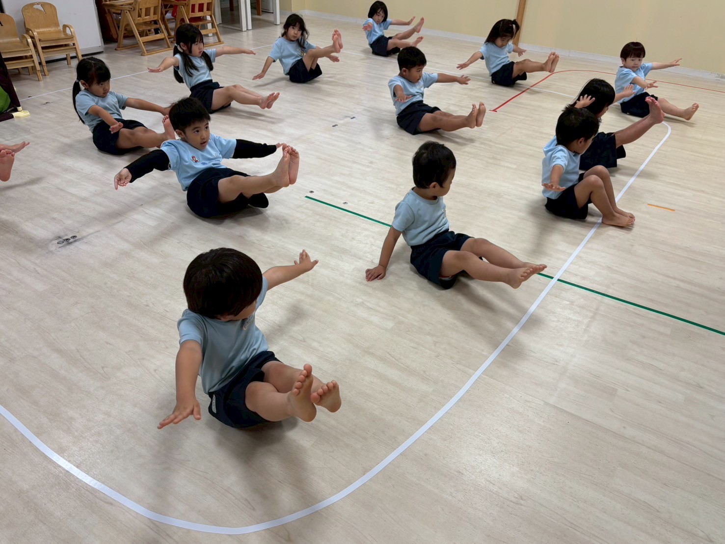 今日は運動会の練習を部屋を広くして行いました❣️開会式・閉会式、ソーラン節に体操とみんな本当によく頑張っていました🤗感覚も掴めてきていると思うので、細かい部分も調整しながら本番に向けて更に気合を入れていきたいと思います🌟頑張った後はそのまま広いお部屋でてる先生と鬼ごっこをしましたよ🏃💖運動会の練習頑張ってるんだってね!と言っていただくと子どもたちも励みになると思いますので応援よろしくお願いします🤗💕