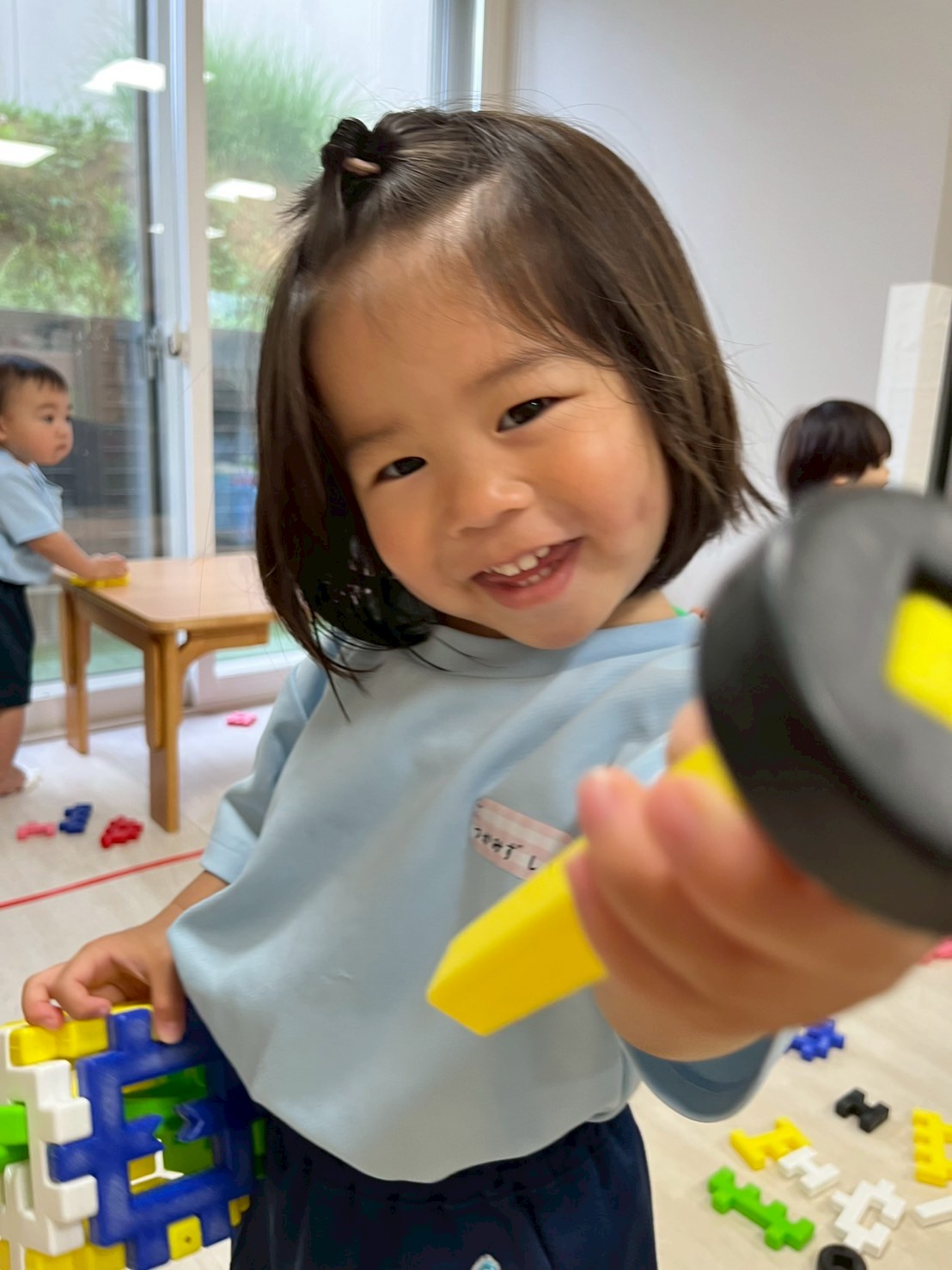 絵本の読み聞かせを十分楽しんだ後は運動会の合同練習。先生の迫力ある声や笛の音に驚いて泣く子もいましたが皆最後まで参加することができました。大きい組さんの踊りをじっと見つめて手をたたいて応援する姿も見られました。その後はブロックでのんびり遊びました。マイクを作って「あーなたのおなまっえっは?」と歌いながら先生やお友達に質問したり大工さんごっこをしたり思い思いに楽しんでいました😊
