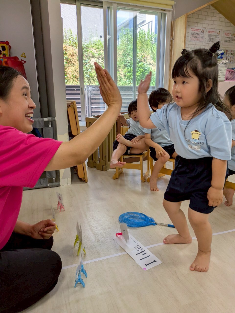 今日は英語レッスンの日🌟虫を捕まえながら楽しく学びました!「like 」「don’t like 」の使い方も教えてもらいました☺️✨待ち時間には運動会練習で旗やソーラン節、組体操とクラスごとに頑張りました💖リフレッシュタイムではまずはフルーツバスケット、うさぎさんは初めてでしたがルールを守りながら楽しめました☺️次の園庭遊びとブロック遊びではそれぞれの世界観で思い思いの時間を過ごしました😆💗