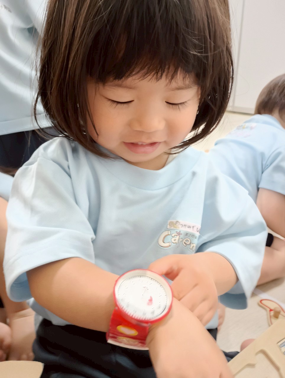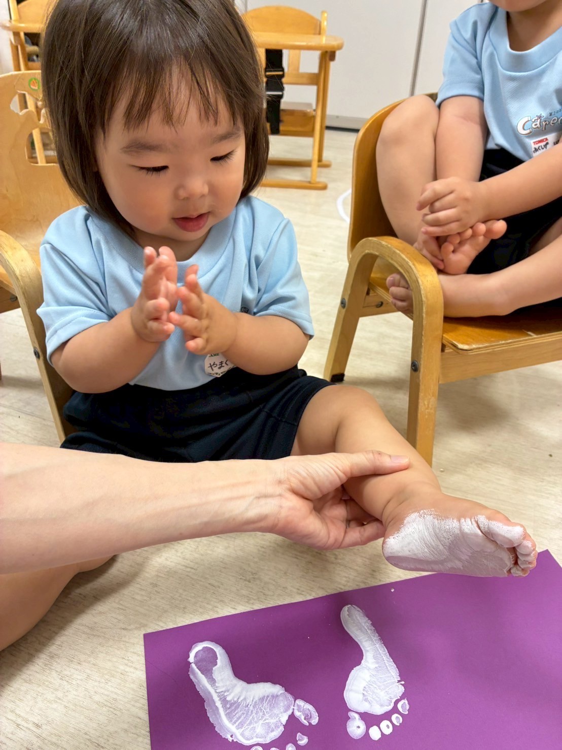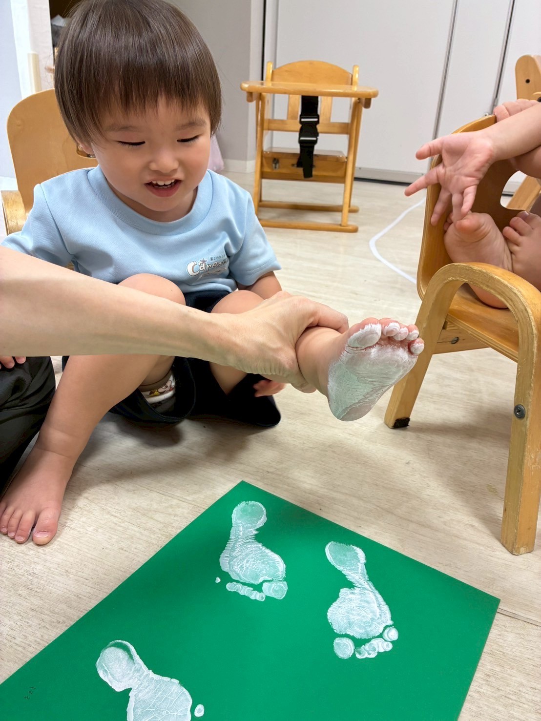 室内遊びでは、足型の製作と時の記念日に合わせて、手作りおもちゃの時計⌚️を付けて、「コチコチカッチンおとけいさーん🎵」と嬉しそうに歌っていました❣️足型は7月の製作です☺️何になるのかお楽しみに🦀🩴