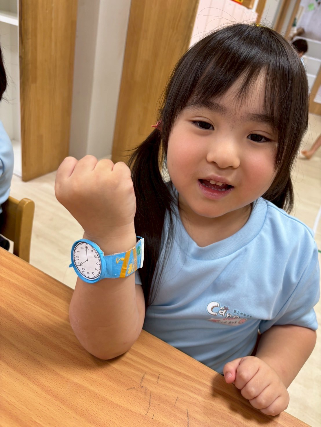 絵本の先生からの読み聞かせの後、時の記念日についてのお話をし、時計の針を書き入れる製作をしました🌟大人の針と子どもの針、長さや本数を意識しながら上手に書くことができました🎶明日持ち帰り予定です☺️