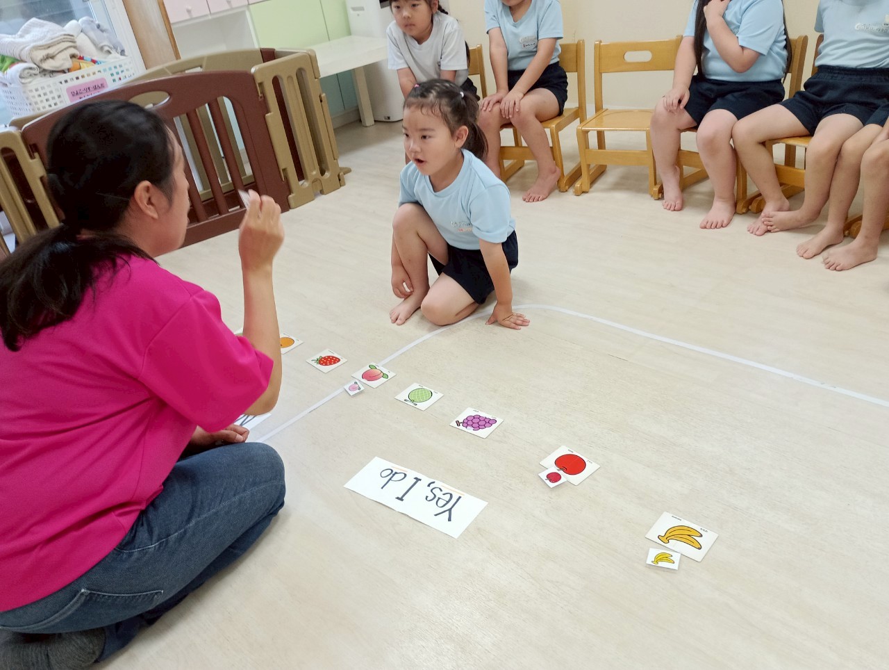 うさぎさんは、同じ果物がどこにあるかな〜って見つけて、その果物を英語で答えることを頑張っていました☺️きりんこあらさんは、果物をたくさん覚えているので好きな果物、嫌いな果物のときに使う英文を、先生と一緒に言って練習しました🩷